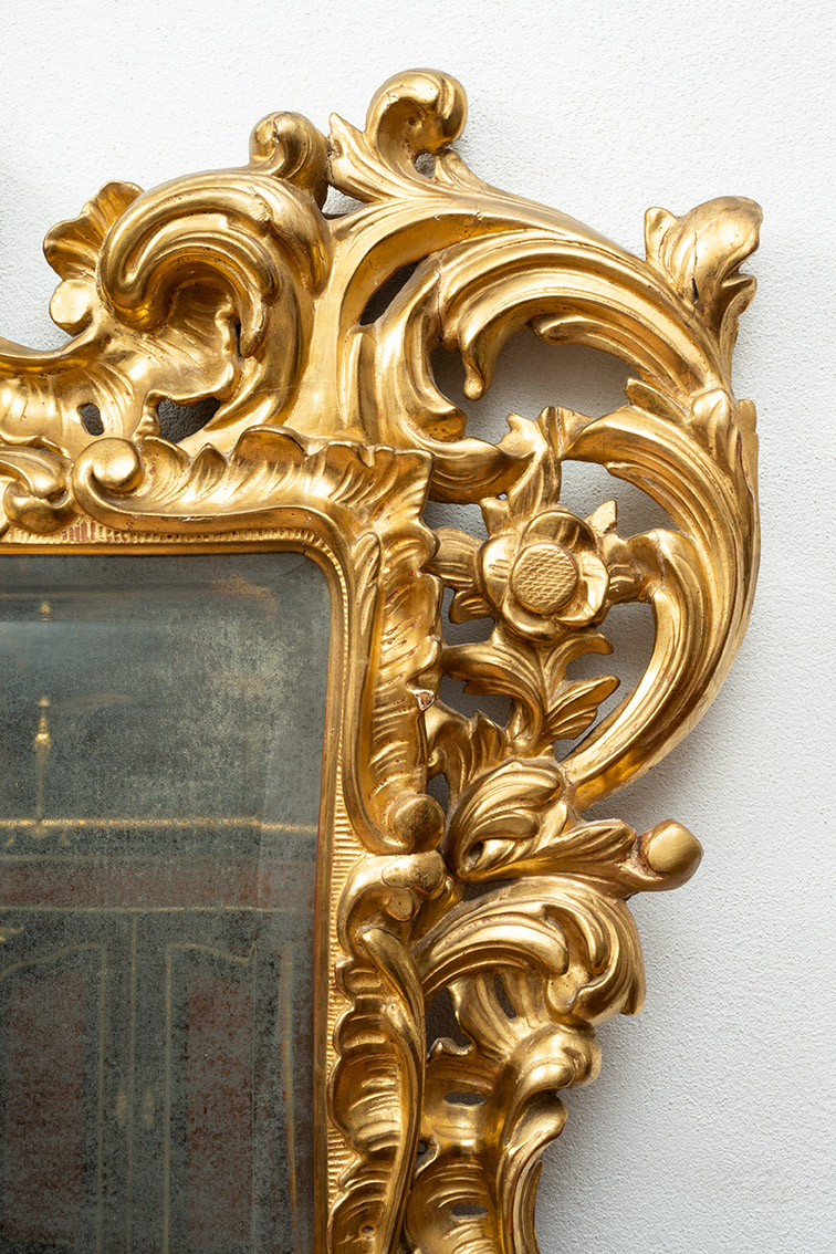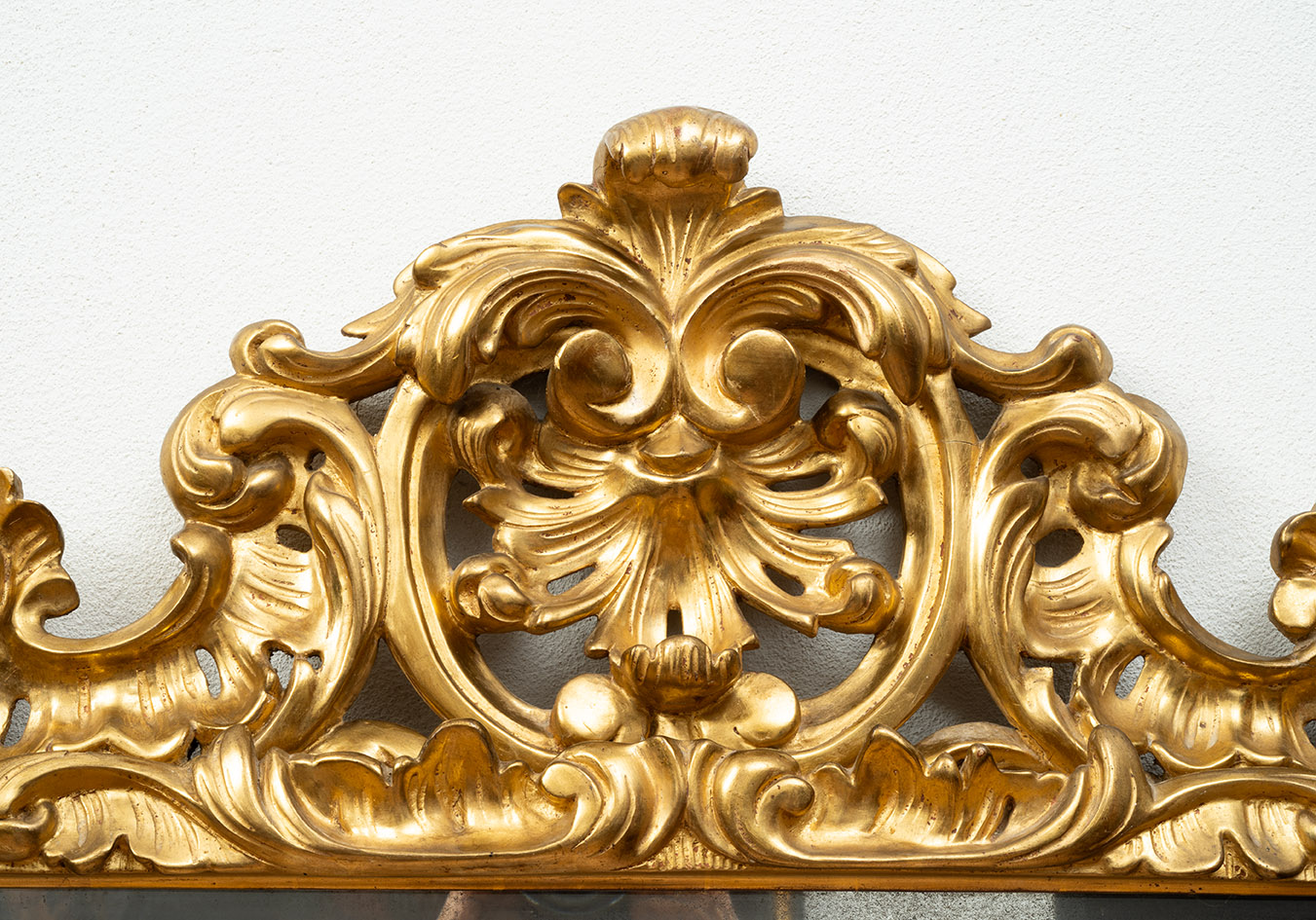 Lo specchio al mercurio è contornato da un intaglio a motivo vegetale dalla quale parte un più grande intaglio a rocailles tipico dello stile di appartenenza.