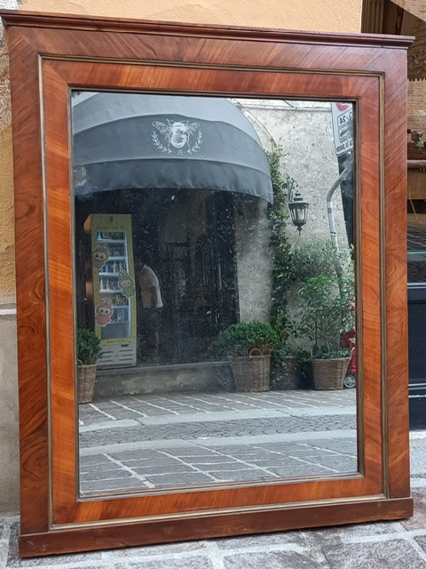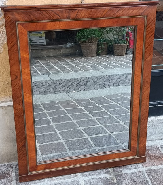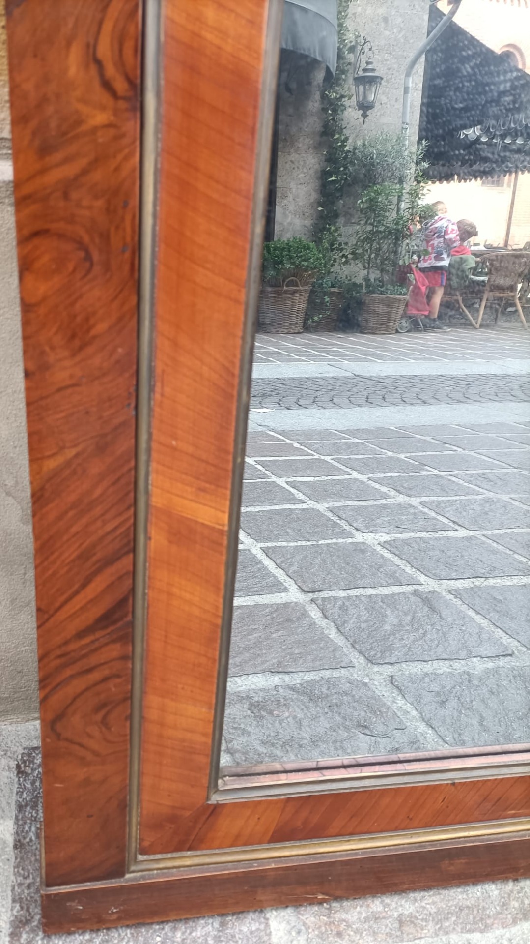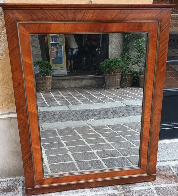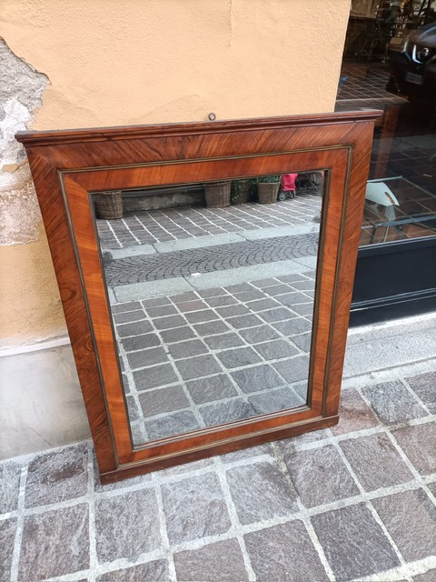 Elegante specchiera in noce e lastrone di noce con bordino in ottone e specchio al mercurio. Misure : cm. 92 x 114