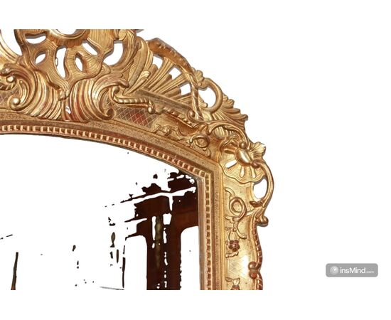 Bellissima specchiera francese di inizio 1800, stile Luigi XV, in legno dorato foglia oro. Presenta ricca cimasa nel corpo superiore e cornice riccamente elaborata.