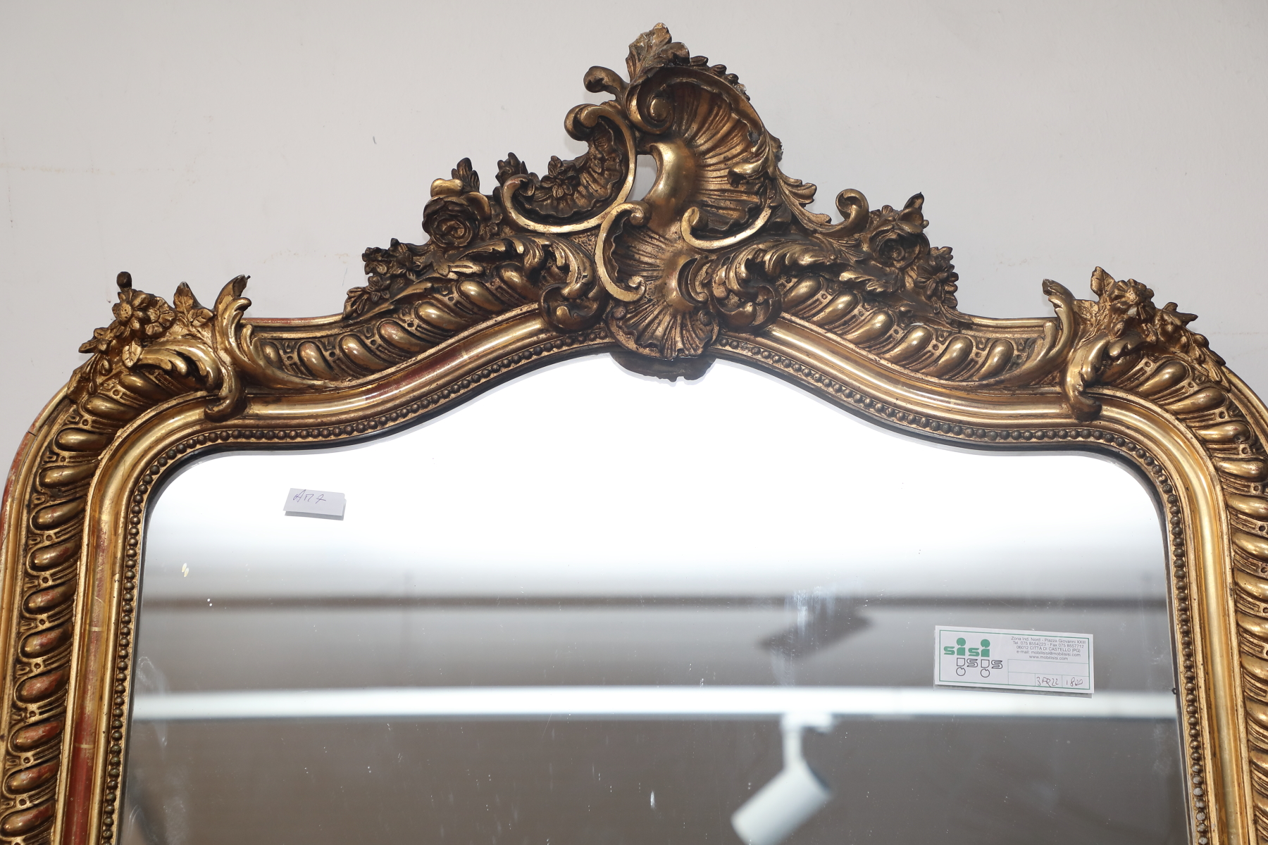 Specchiera in legno dorato ed intagliato con cimasa a ricciolo e foglie intagliate .Dimensionsioni : 104x145h.