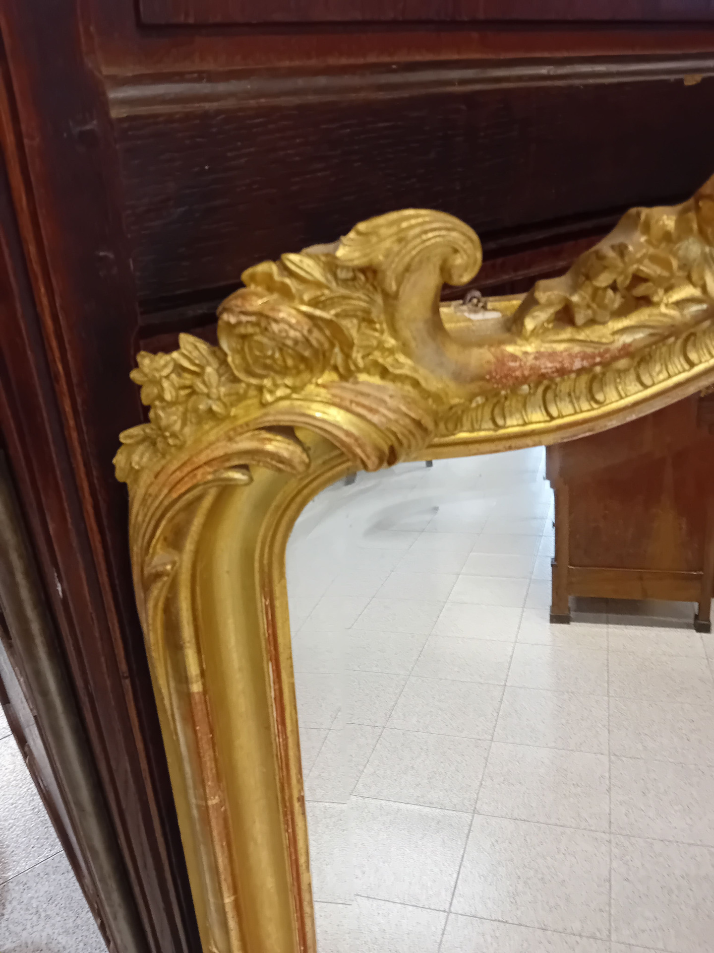 con cimasa mossa ,conchiglia ,motivi floreali a ramages lungo i lati ,foglie intagliate sui lati della base. Dimensioni: Altezza massima 137 cm - Larghezza massima 91 cm Spese di spedizione a carico cliente. Per maggiori informazioni contattateci: info@antichitadaziano.com