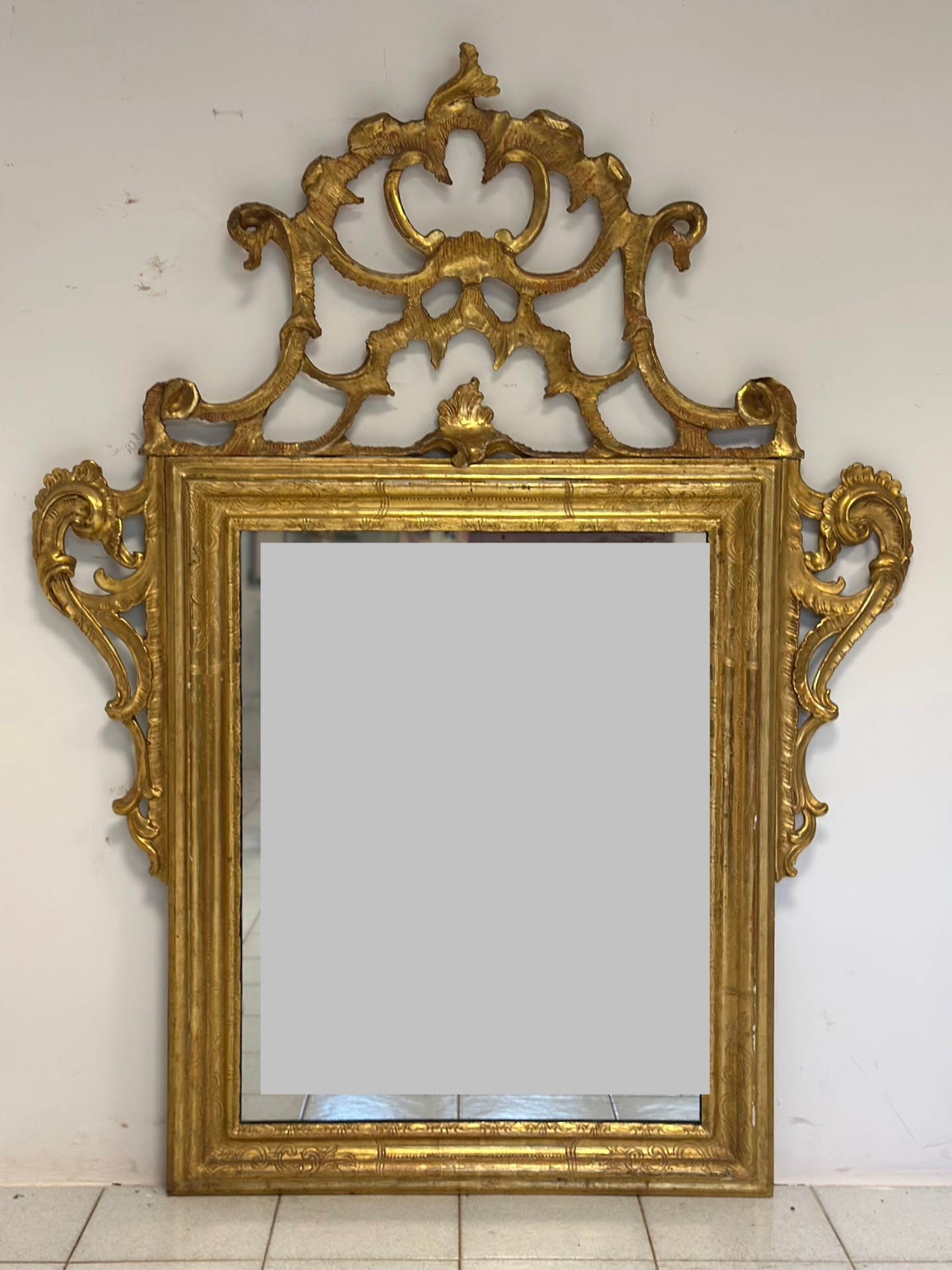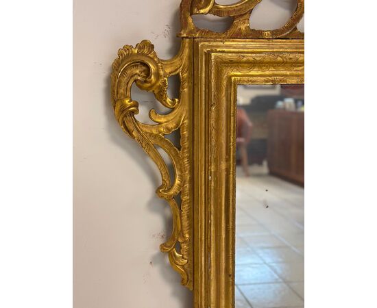 Specchiera in legno intagliata  dorata  a foglia  interamente costruita in legno tutta finemente scolpita e decorata con eleganti volute a motivi vegetali con una ricca cimasa traforata vetro al mercurio coevo del periodo