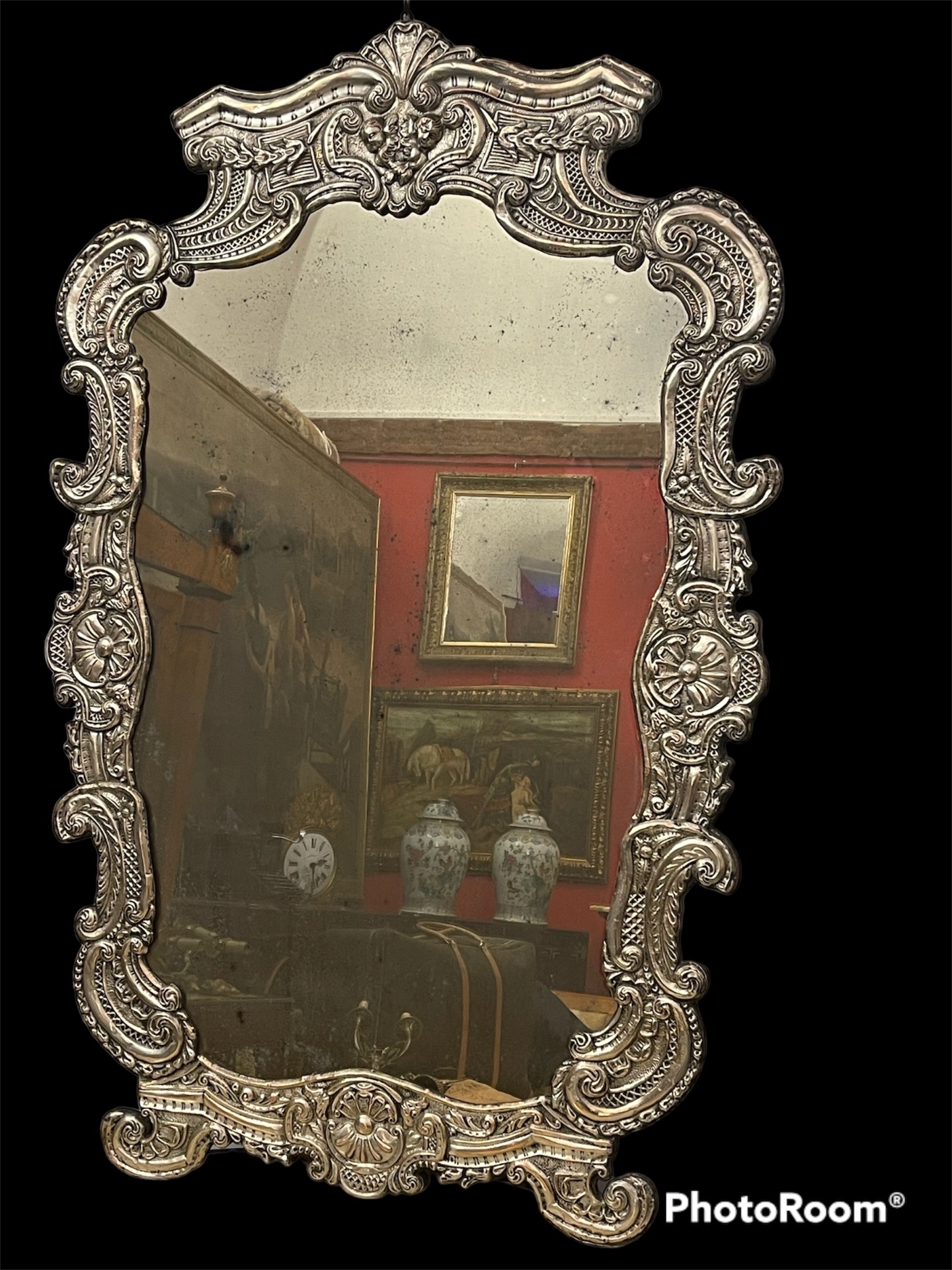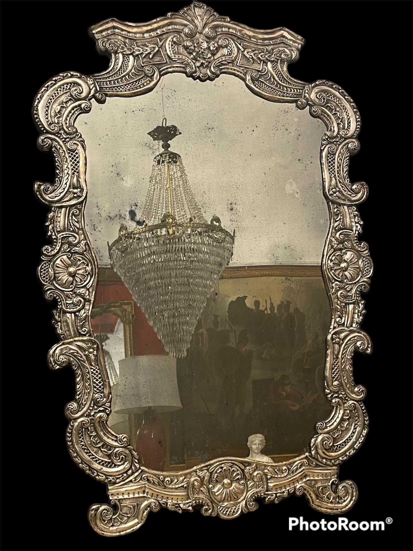 Specchiera a motivo di cartaglorie in metallo sbalzato e bagnato in argento di grandi dimensioni in ottime condizioni 130x68 circa inizi 900 Italia