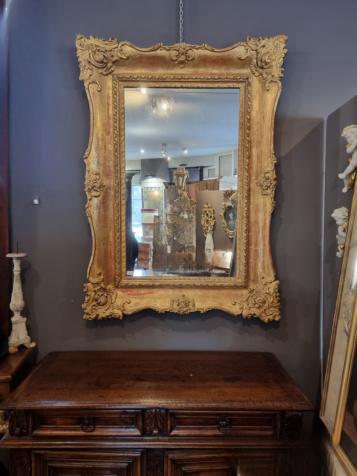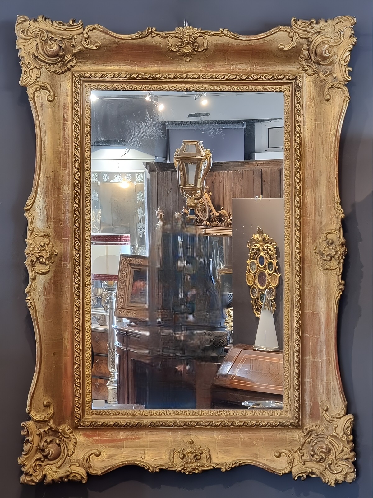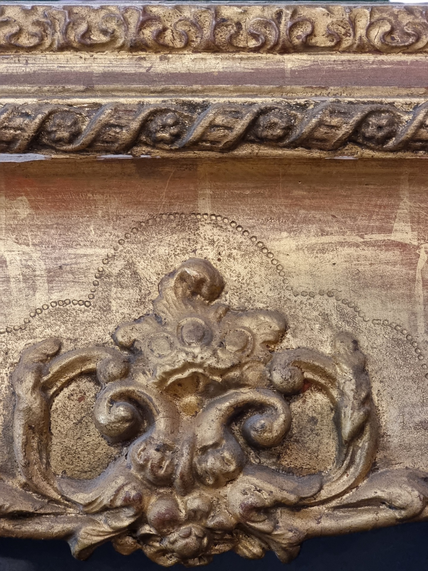 Importante specchiera veneta di epoca Luigi Filippo (metà XIX secolo), caratterizzata da una cornice mossa e riccamente decorata in pastiglia dorata a guazzo. L’opera si distingue per le dimensioni generose (cm 143 x 101) e per la presenza di una fascia di cornice molto ampia, fino a 21 cm nel punto maggiore, che contribuisce all’imponenza dell’insieme.