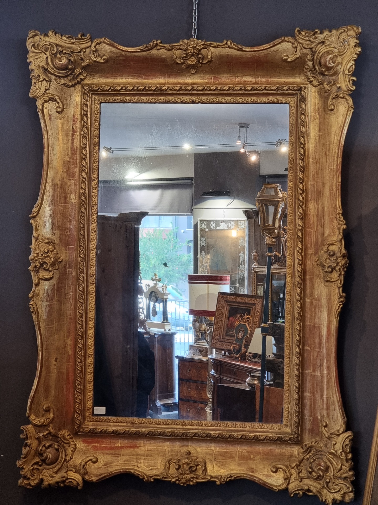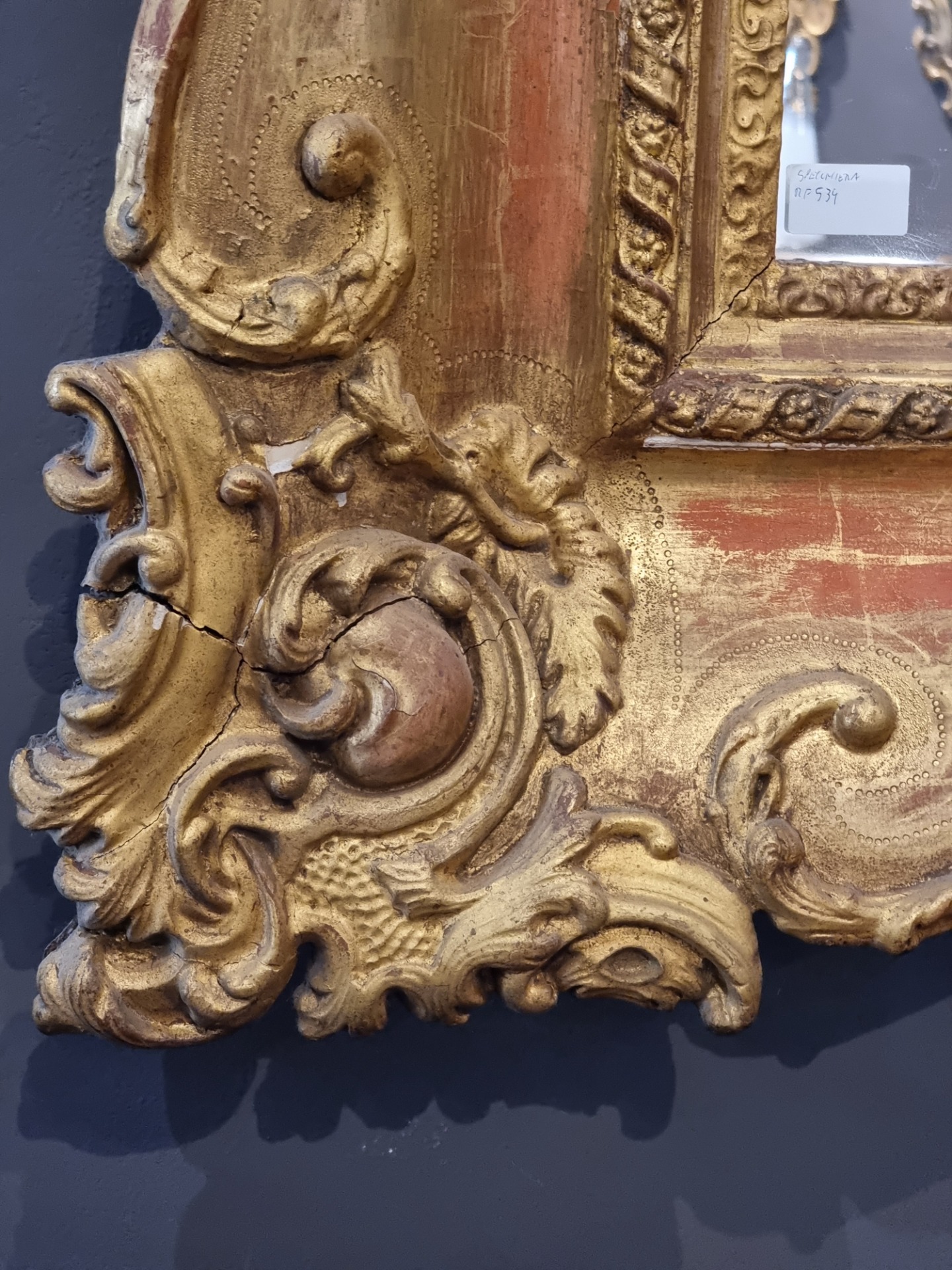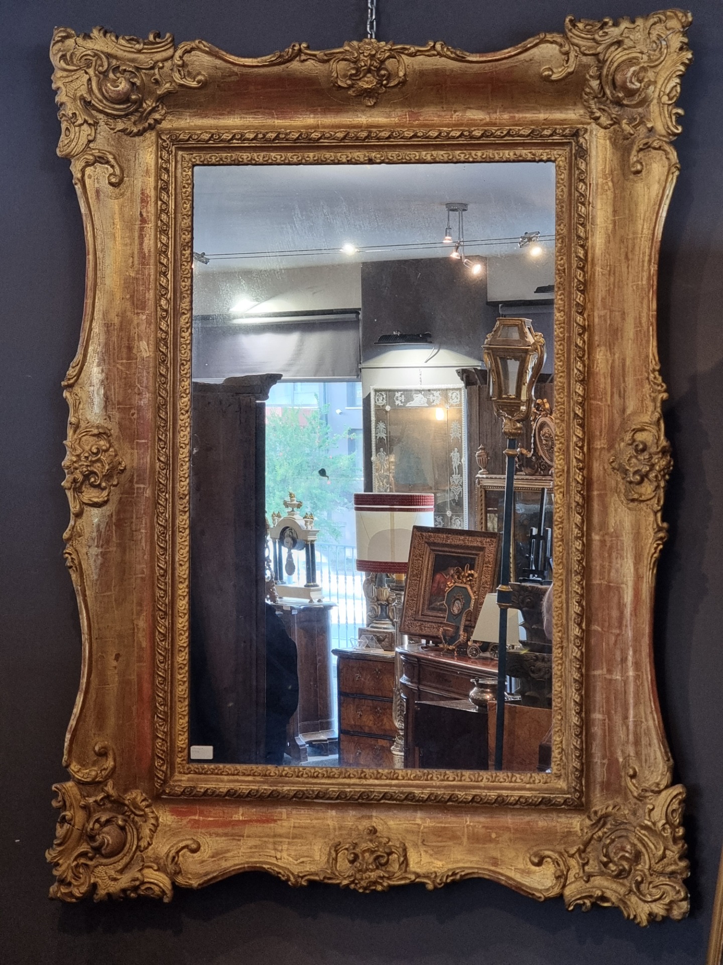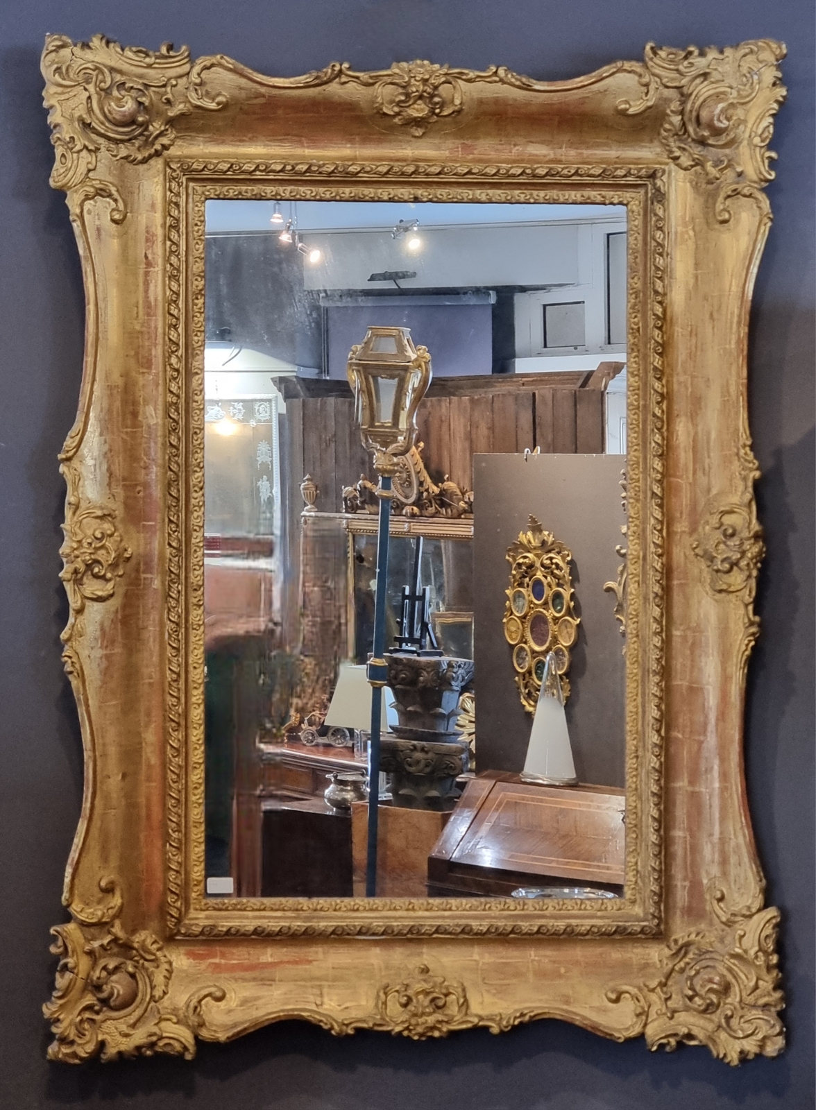 Importante specchiera veneta di epoca Luigi Filippo (metà XIX secolo), caratterizzata da una cornice mossa e riccamente decorata in pastiglia dorata a guazzo. L’opera si distingue per le dimensioni generose (cm 143 x 101) e per la presenza di una fascia di cornice molto ampia, fino a 21 cm nel punto maggiore, che contribuisce all’imponenza dell’insieme.