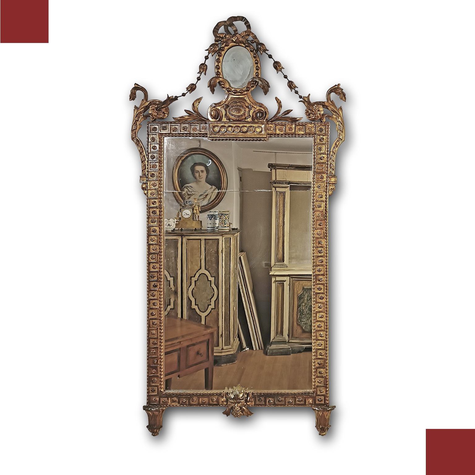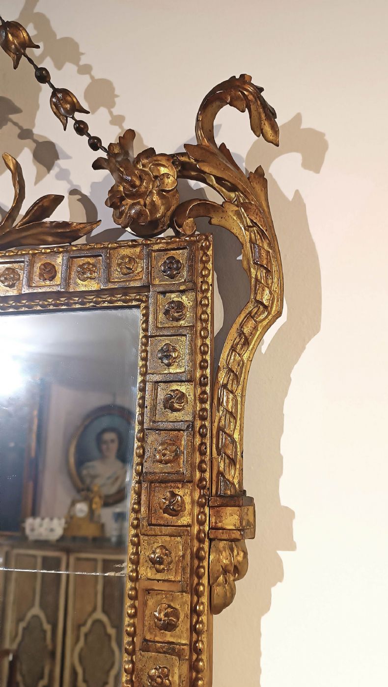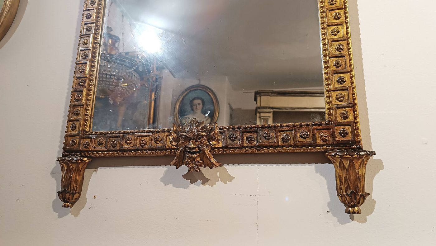 Raffinata specchiera in legno intagliato e dorato a foglia d’oro zecchino. La cornice si distingue per la sua grande eleganza, impreziosita da raffinati motivi intagliati, caratterizzati da motivi floreali e geometrici. In basso, la cornice si conclude con un volto figurato al centro, mentre la cimasa è arricchita da ghirlande di fiori e un fiocco; all’interno di quest’ultimo è presente un ulteriore piccolo specchio. Si tratta di una specchiera di grande gusto e raffinatezza, capace di arredare con classe qualsiasi ambiente. Manifattura Lucchese (Lucca, Toscana) del periodo neoclassico, intorno alla fine del XVIII secolo.