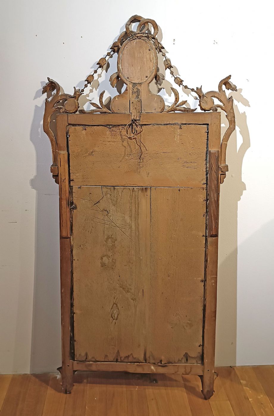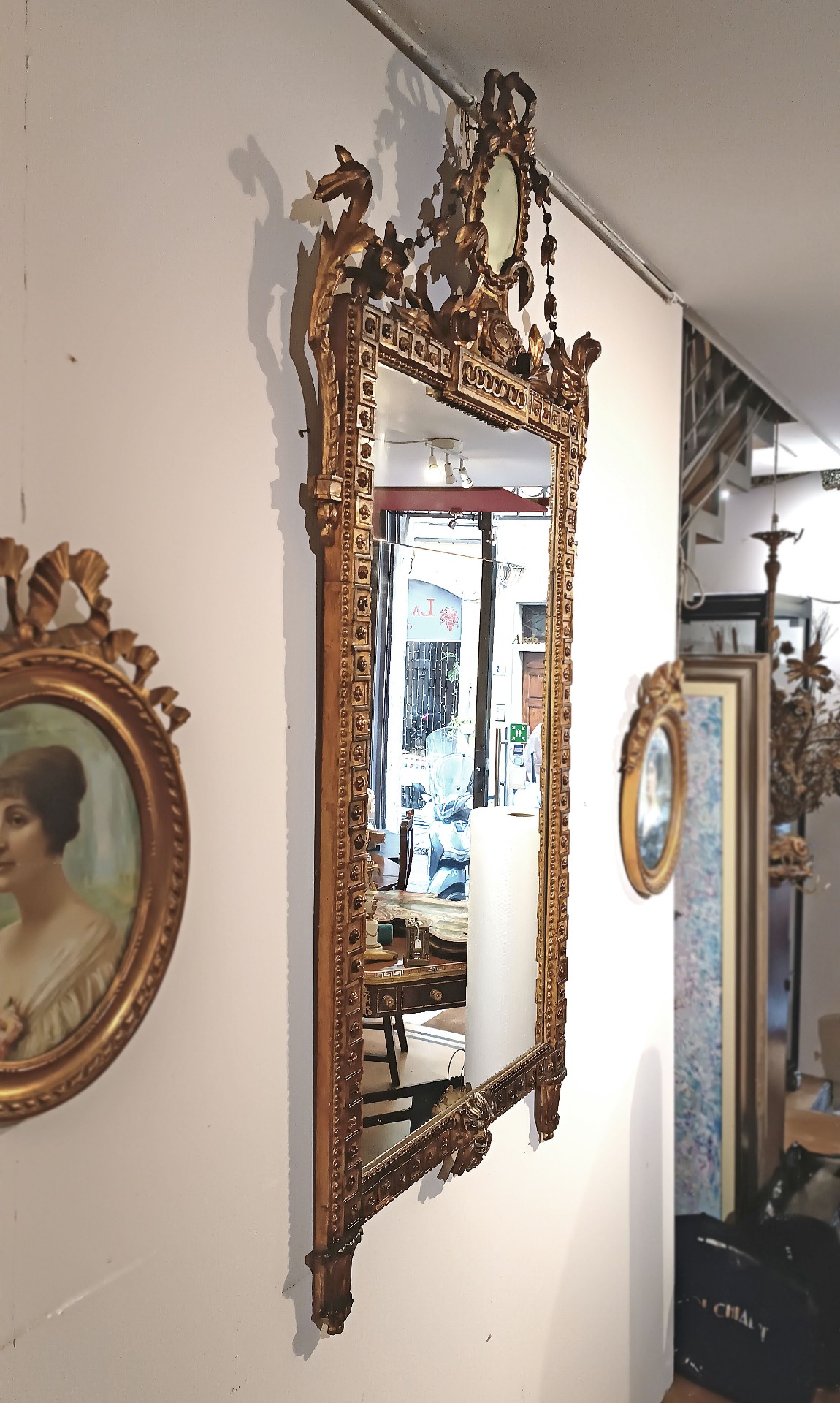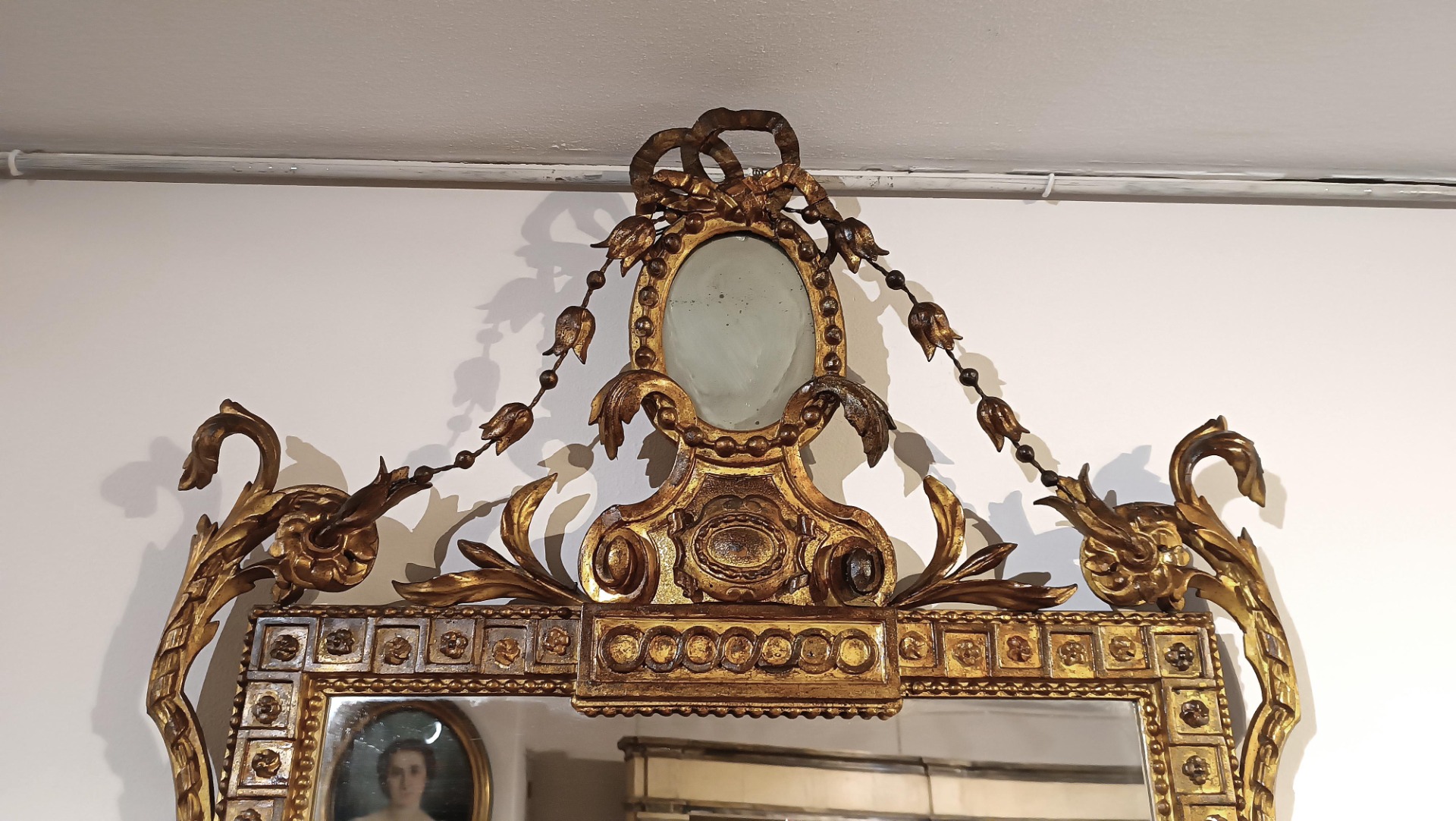 Raffinata specchiera in legno intagliato e dorato a foglia d’oro zecchino. La cornice si distingue per la sua grande eleganza, impreziosita da raffinati motivi intagliati, caratterizzati da motivi floreali e geometrici. In basso, la cornice si conclude con un volto figurato al centro, mentre la cimasa è arricchita da ghirlande di fiori e un fiocco; all’interno di quest’ultimo è presente un ulteriore piccolo specchio. Si tratta di una specchiera di grande gusto e raffinatezza, capace di arredare con classe qualsiasi ambiente. Manifattura Lucchese (Lucca, Toscana) del periodo neoclassico, intorno alla fine del XVIII secolo.