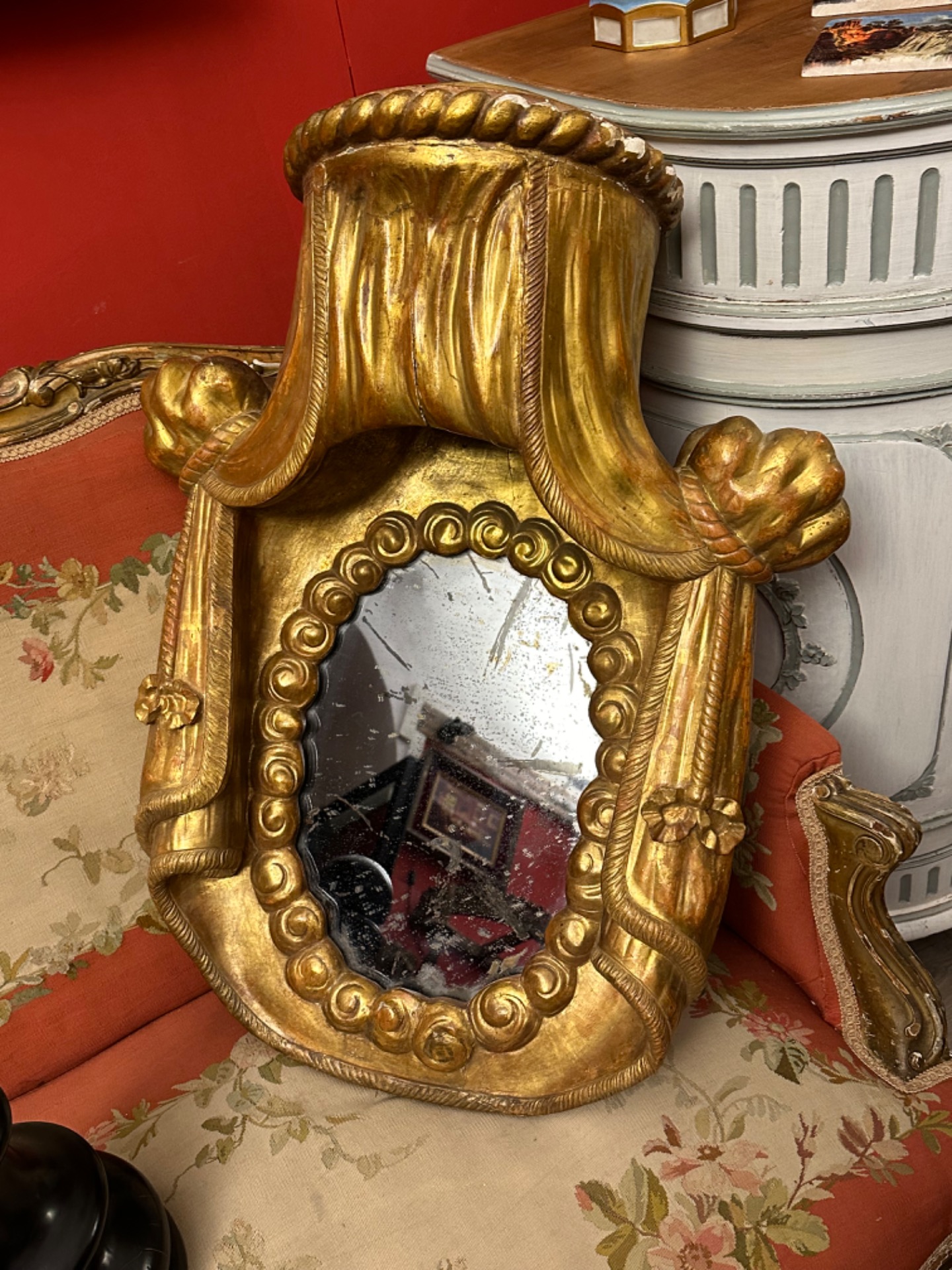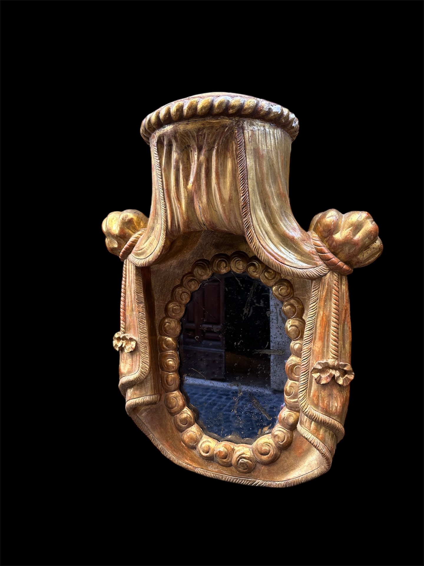 Specchiera in legno intagliato e dorato a foglia d'oro con drappi ai lati e fiocchi Italia prima metà del 700