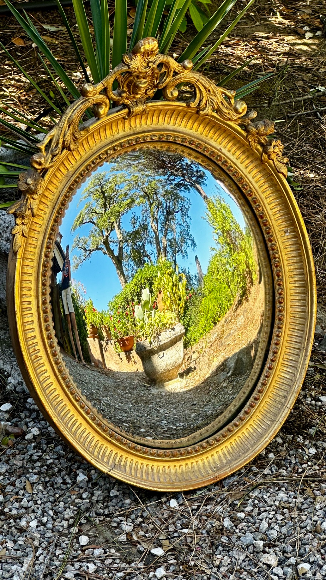 Specchio “Sorcière” in legno dorato, XIX secolo Raro specchio convesso di forma ovale, detto “sorcière”, databile alla seconda metà del XIX secolo. La cornice è finemente lavorata in legno intagliato e dorato, arricchita da una elegante decorazione a perle lungo l’interno e da una serie di...