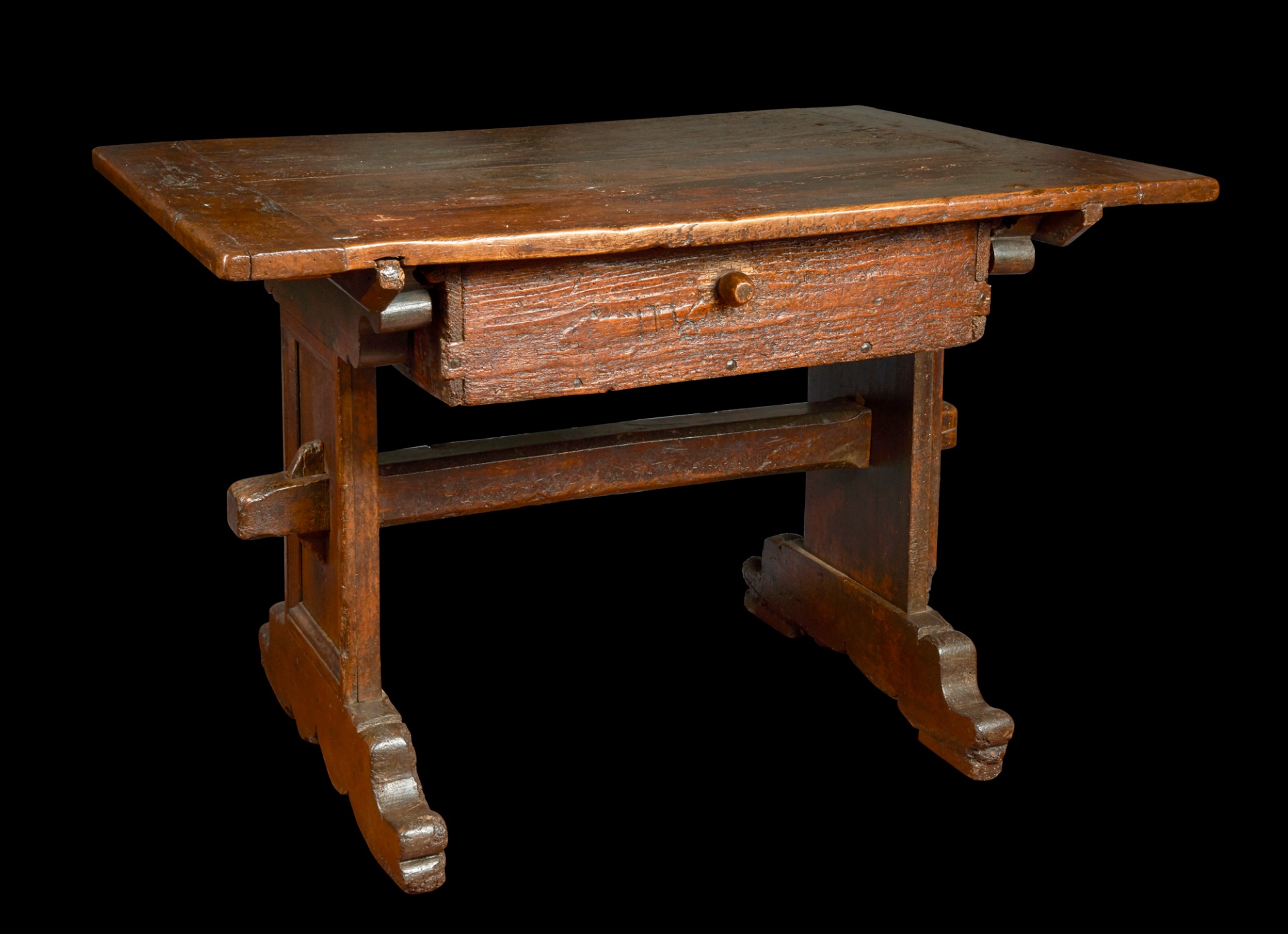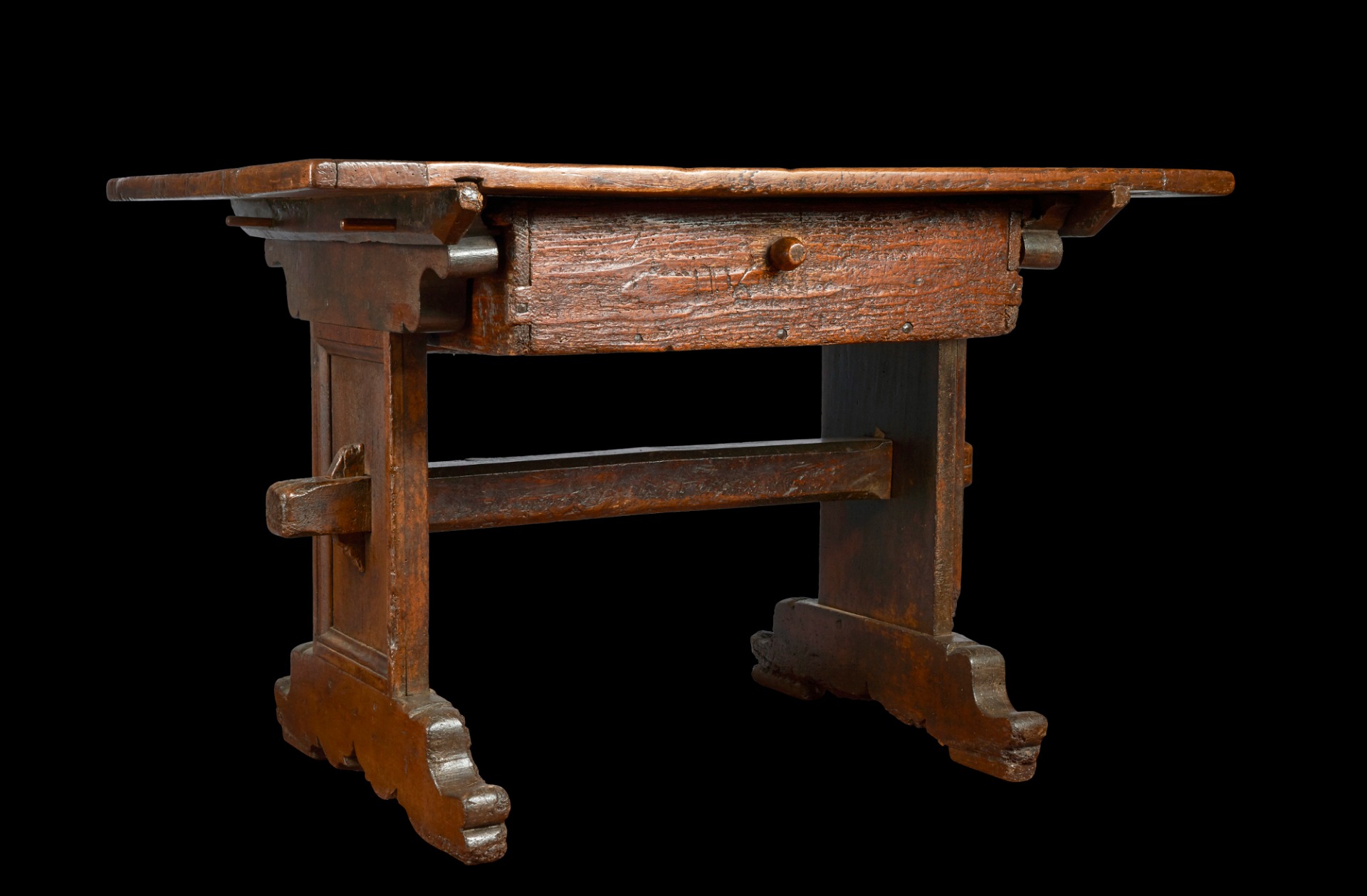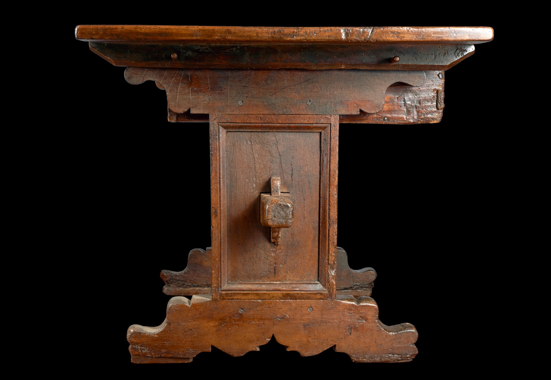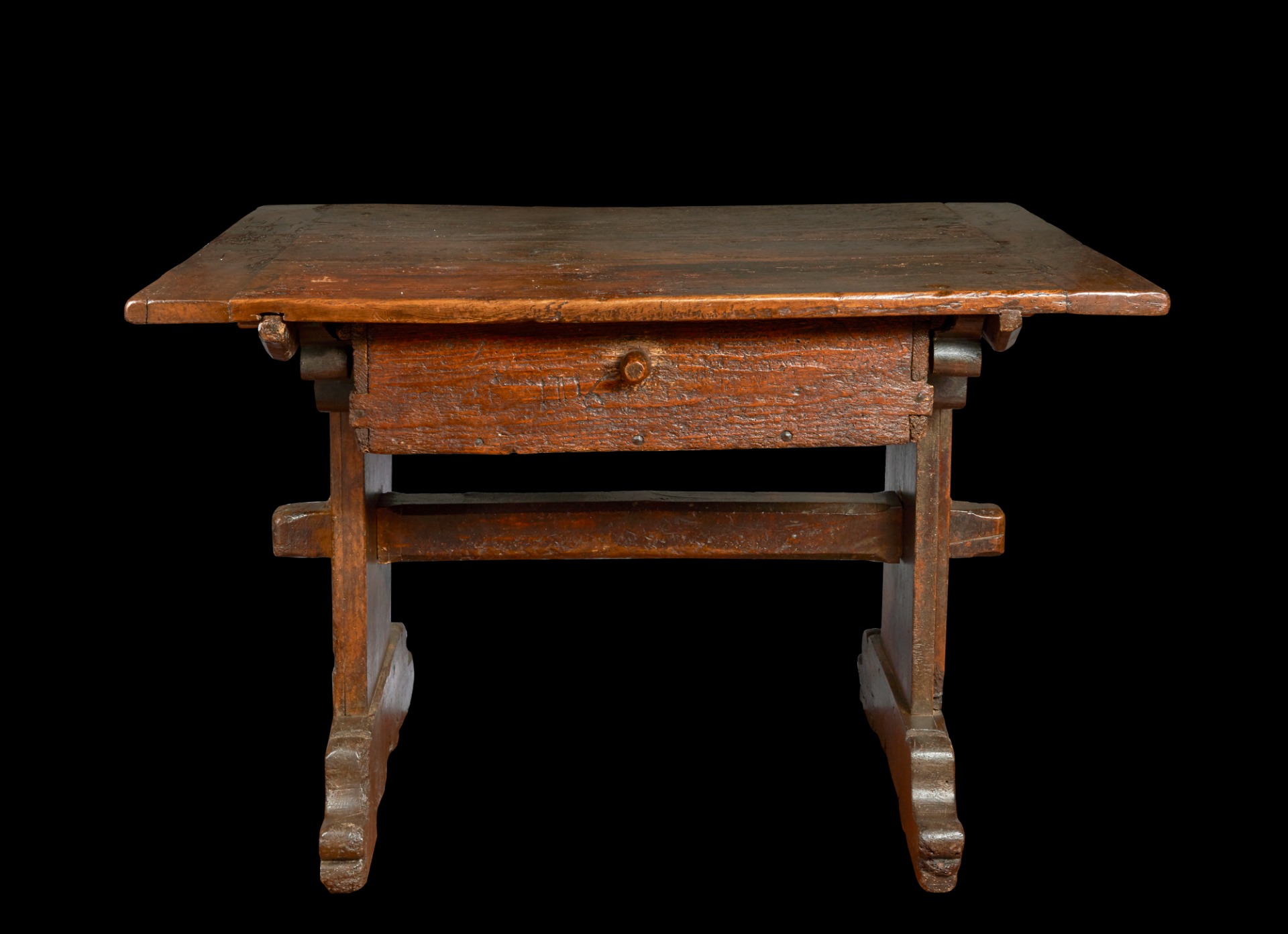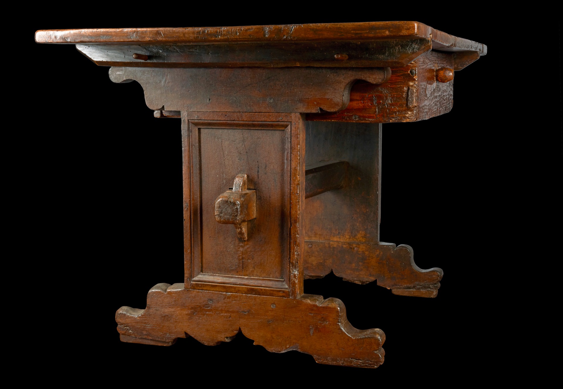Da notare l’eleganza nella modanatura delle mensole, e il grande cassetto con l’incastro chiodato sul fronte che scorre per tutta la lunghezza del tavolo e che, spinto da un lato, dà la possibilità al desco di essere usato come scrittoio.