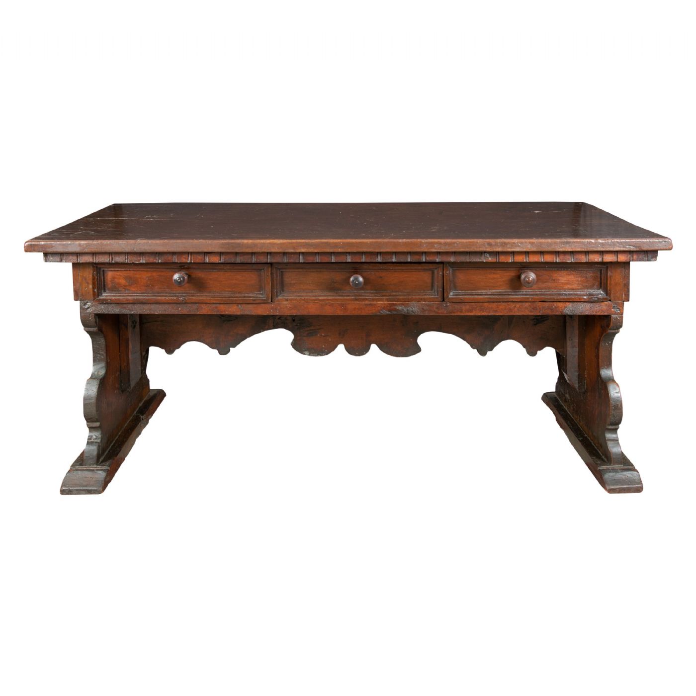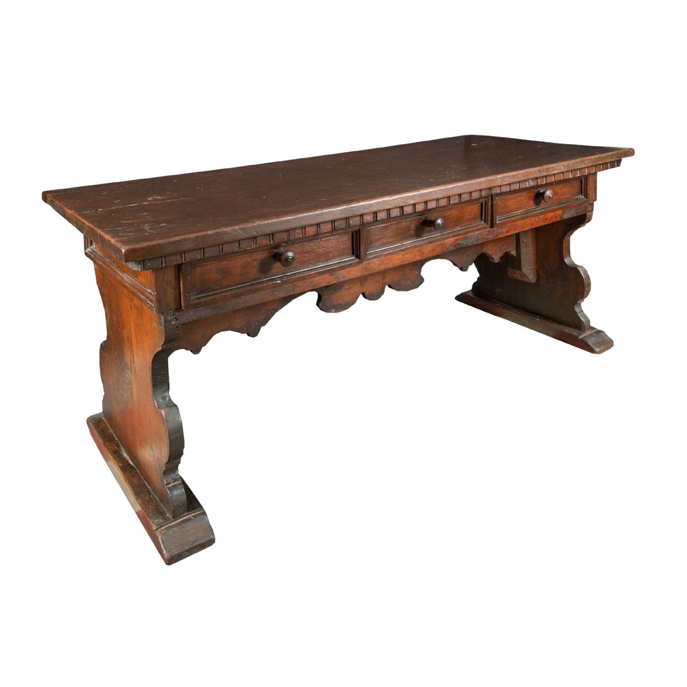 Realizzato interamente in legno di noce massello, presumibilmente da una bottega artigiana dell’Italia settentrionale in epoca tardo-rinascimentale. Piano poggiante su due gambe ad asso di coppe unite da una traversa sagomata, fascia centrale a tre cassetti decorata da un fregio dentellato.