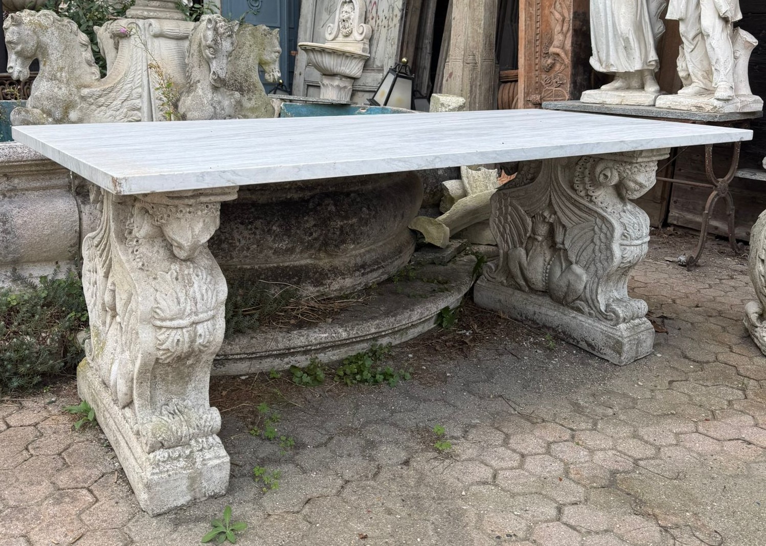 TAV326 - Tavolo in marmo con basamenti in pietra composta scolpita con coppia di leoni alati.