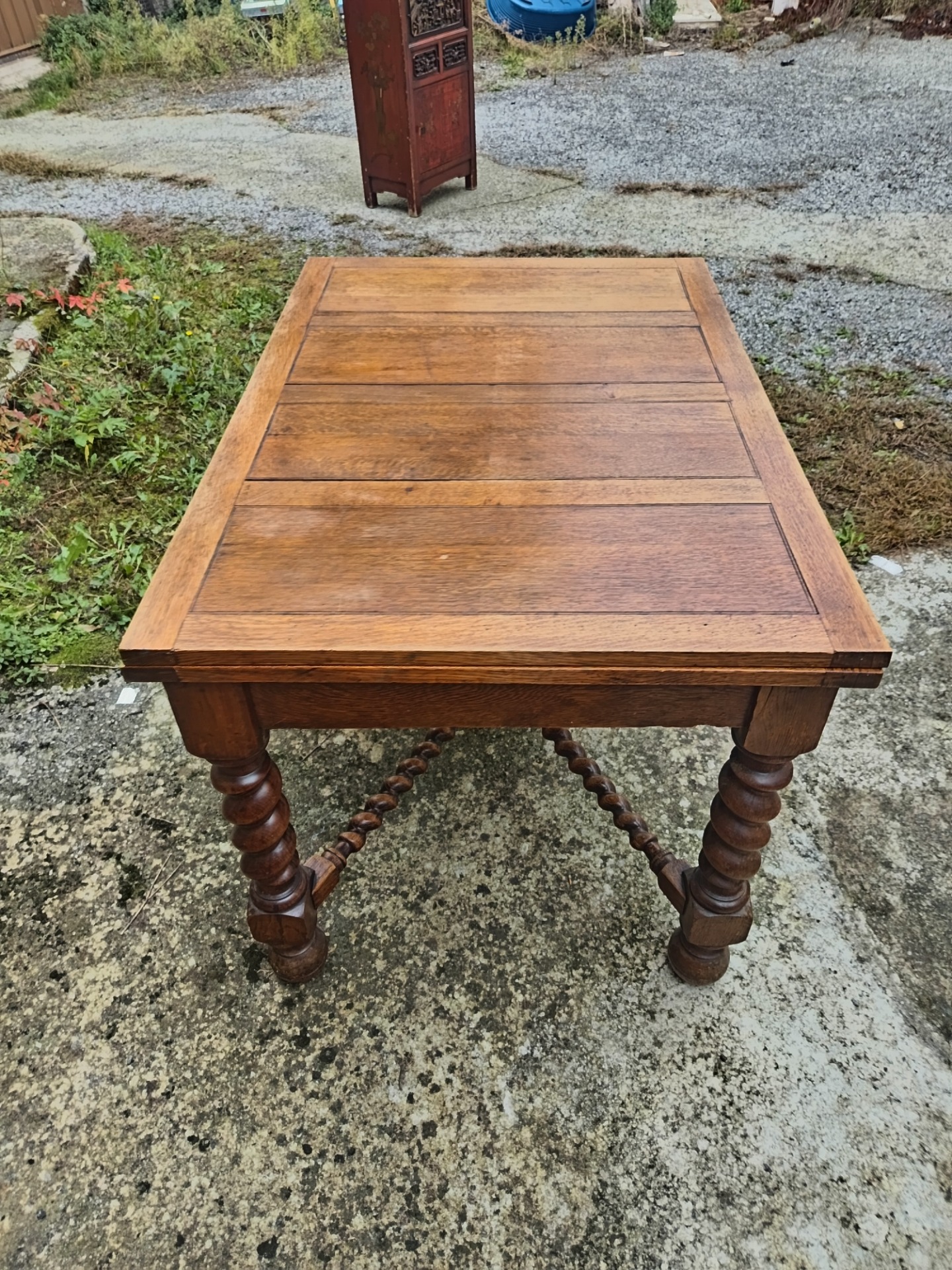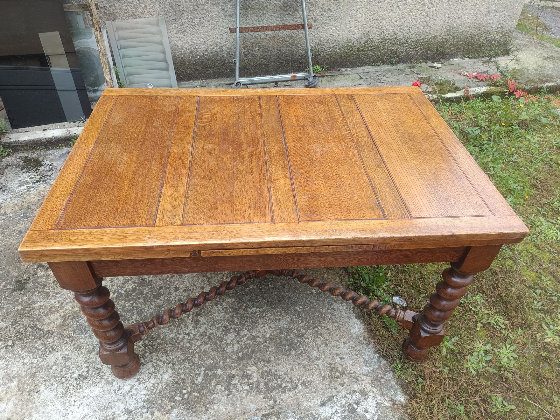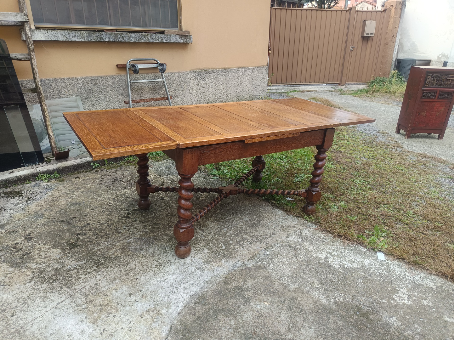 Tavolo in massello di rovere, con piano allungabile e gambe a rocchetto. Misure: cm 128 x 85 x 80