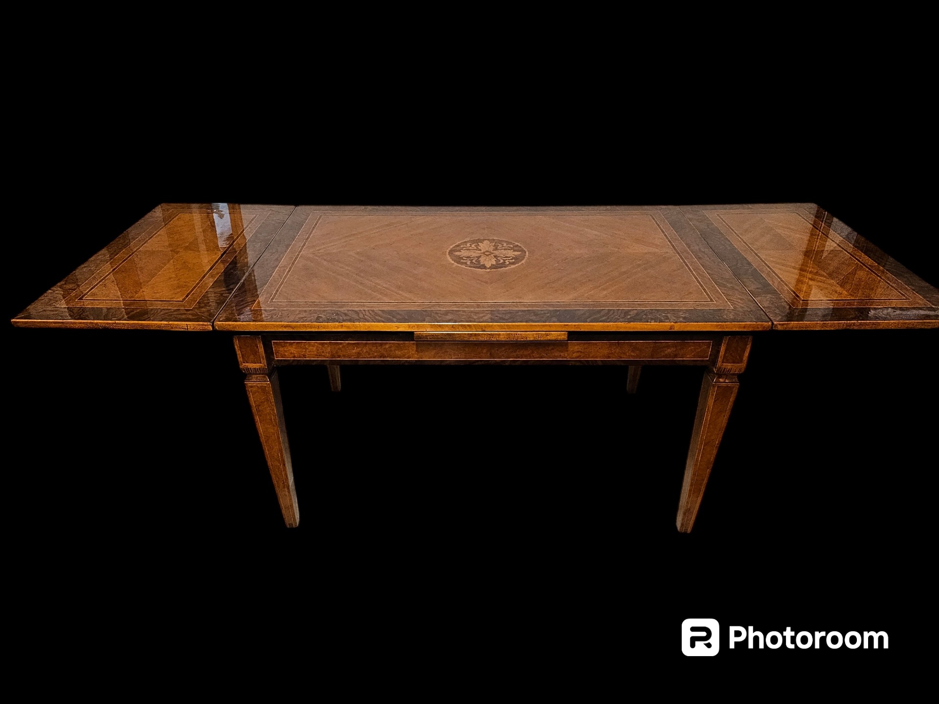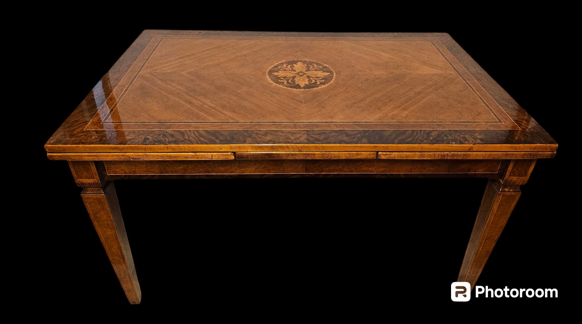 Tavolo a tiro in noce con filetti di puo a bosso e palissandro gamba piramide rovesciata. Allungabile di testa. Misura 140 × 90 aperto 2 40. Per novanta epoca anni venti