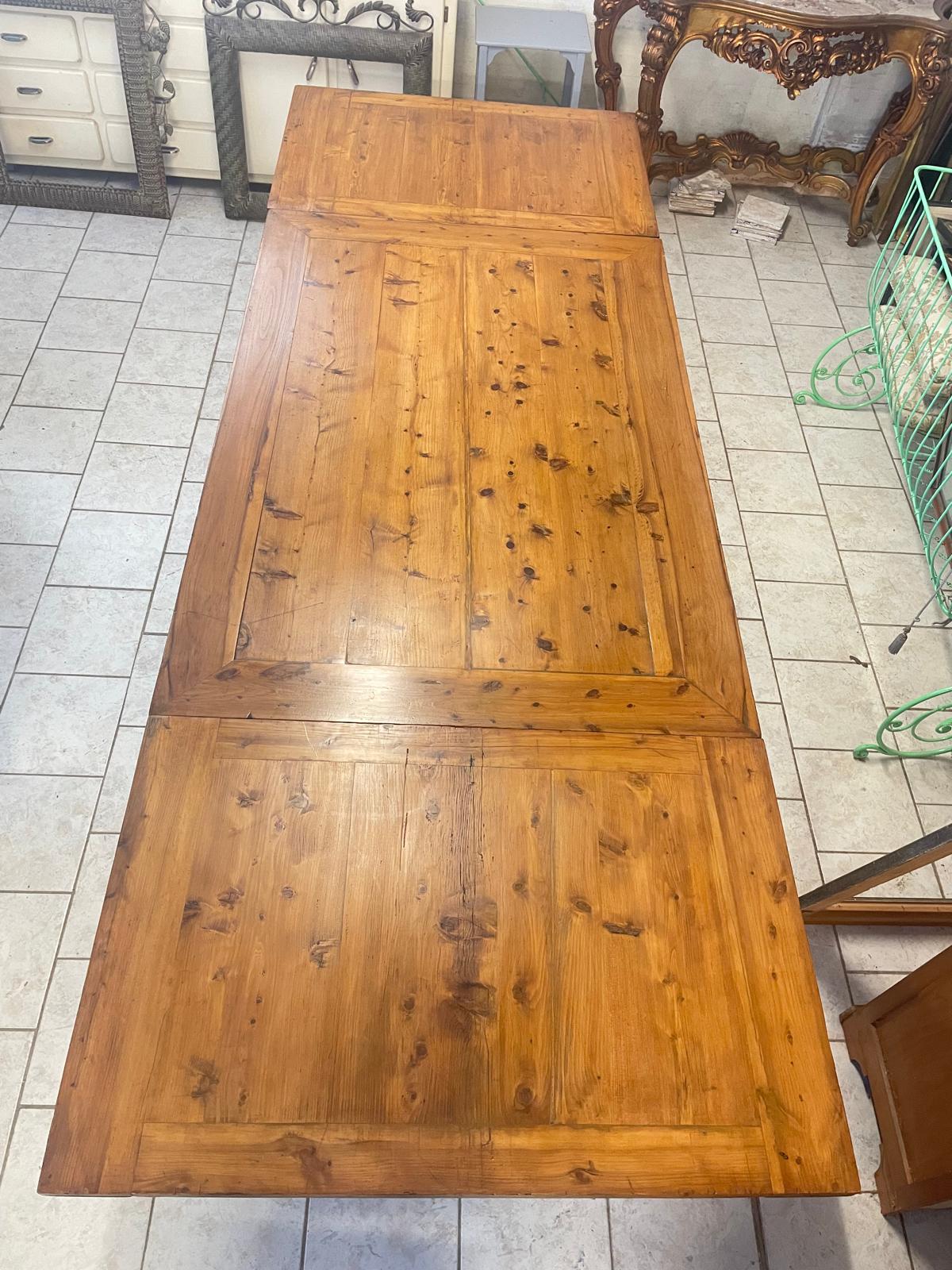 Meraviglioso tavolo allungabile a tiro in cipresso dalle dimensioni molto importanti (oltre 3 metri allungato), piano ed allunghi rifiniti con un’elegante riquadratura, bella la tornitura delle gambe.