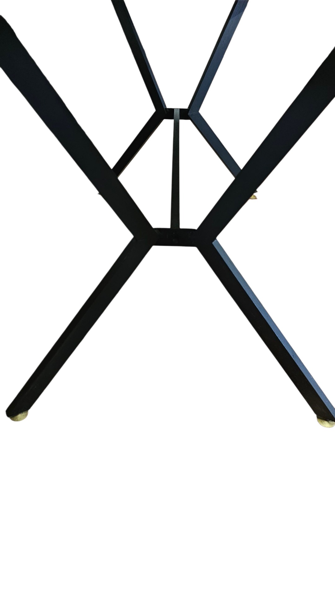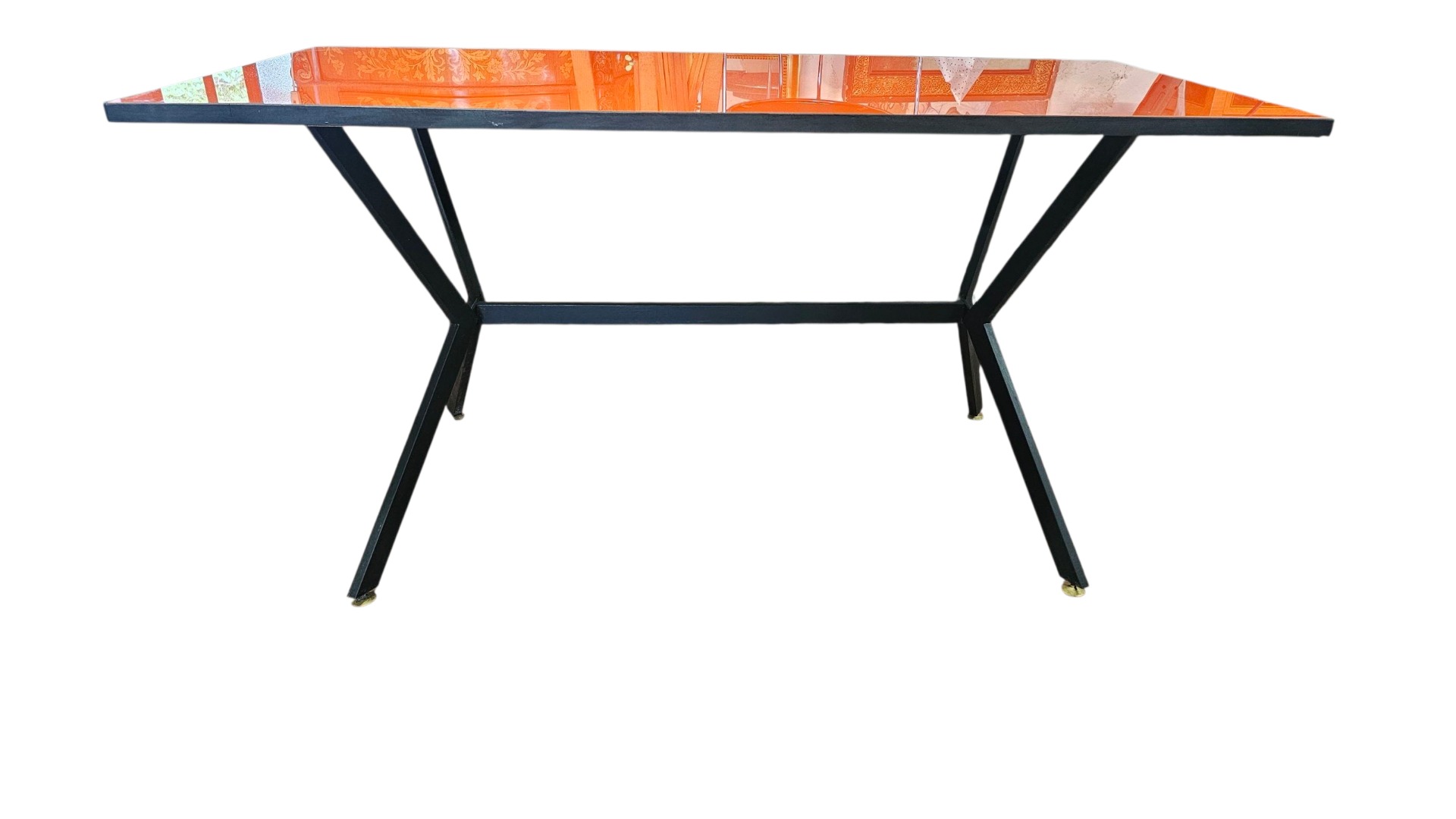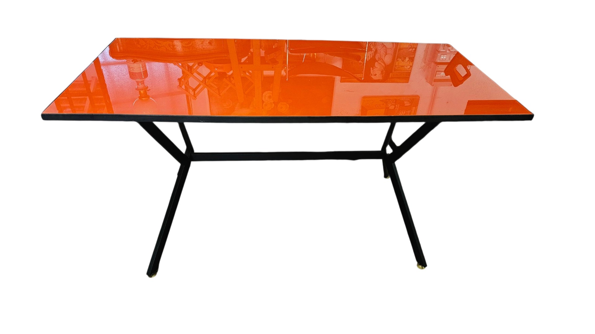 Tavolo anni '60 con topi in cristallo arancione, base ebani in nero. Piedini in ottone. Misura 100. Settanta per ottantacinque