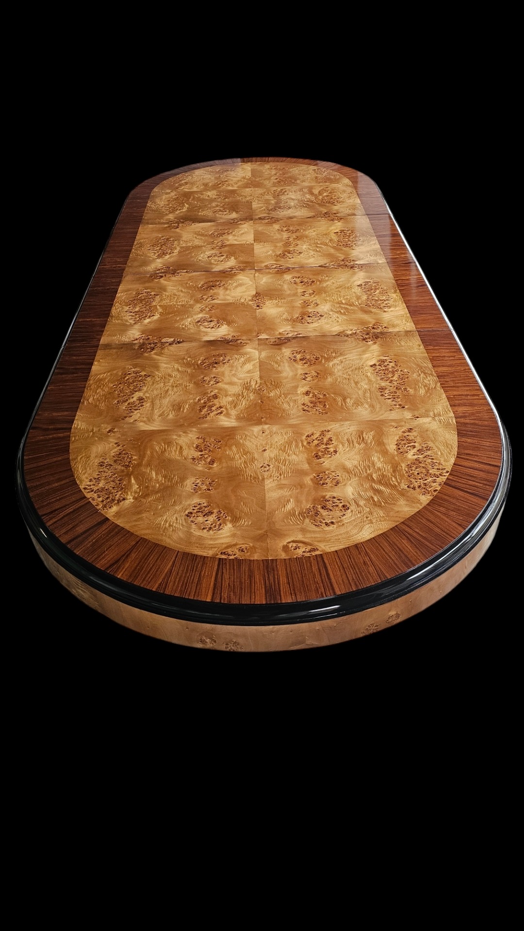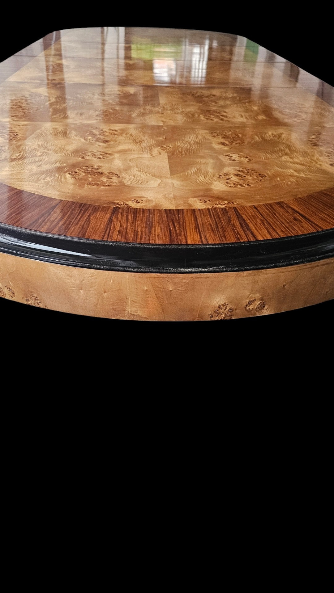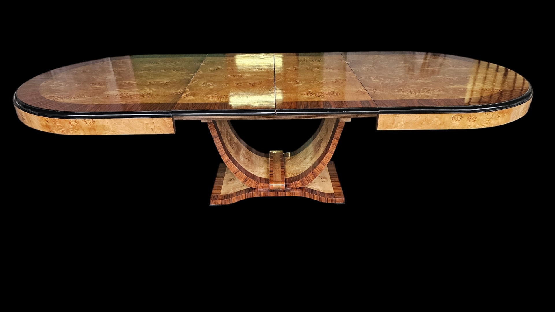 Tavolo hardbécaud in radica di bethul e palissandro. Piano ovale, base curva. 2 prolunghe che risiedono all'interno del tavolo. Misura 2 m per 120 aperto 3 m percento 20. Anni quaranta