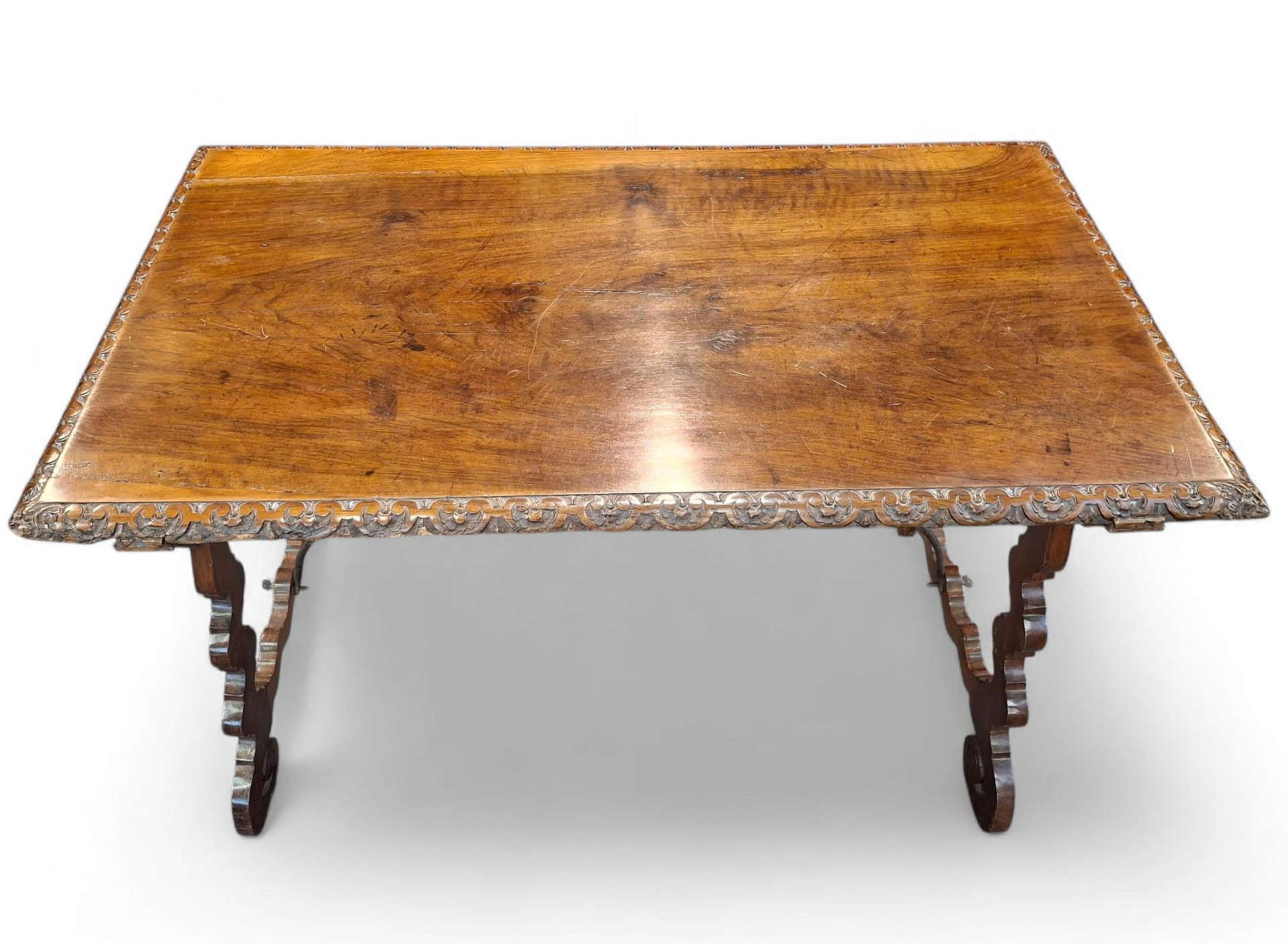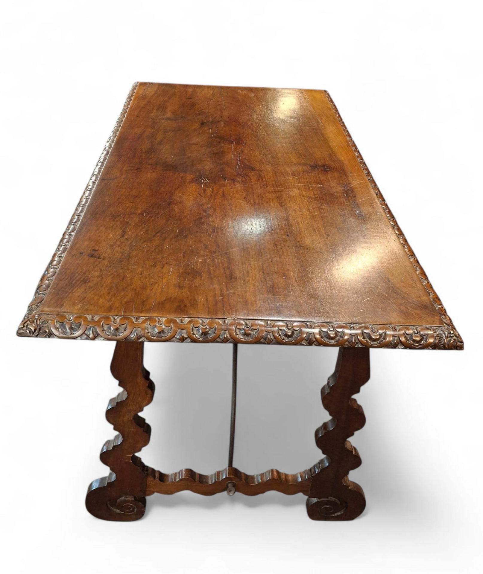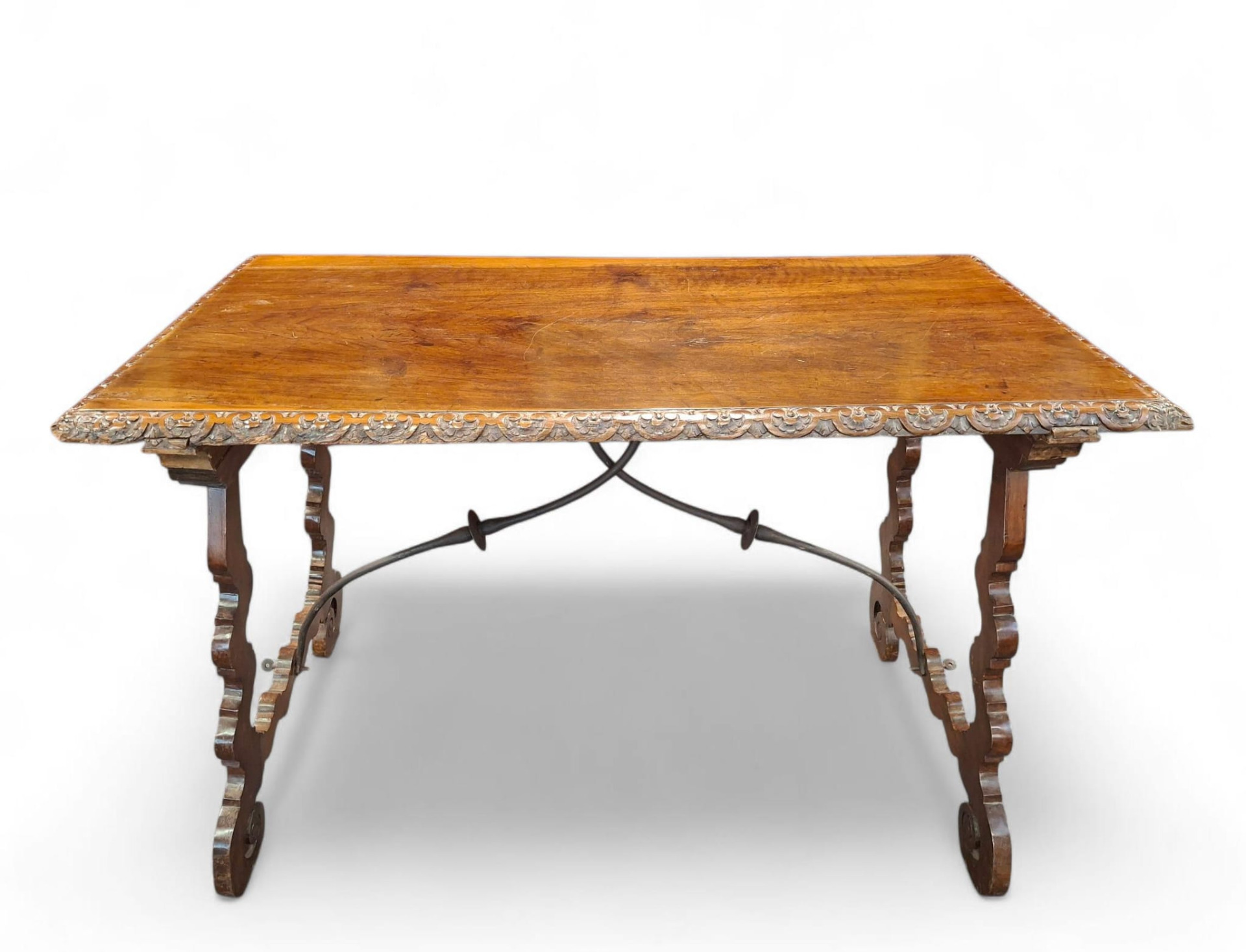 Tavolo con gambe a lira in legno di noce, ferro di supporto centrale, Spagna, fine XVII secolo, profilatura del piano intagliato con 4 mascheroni, misure 75x130 cm, altezza 82 cm.