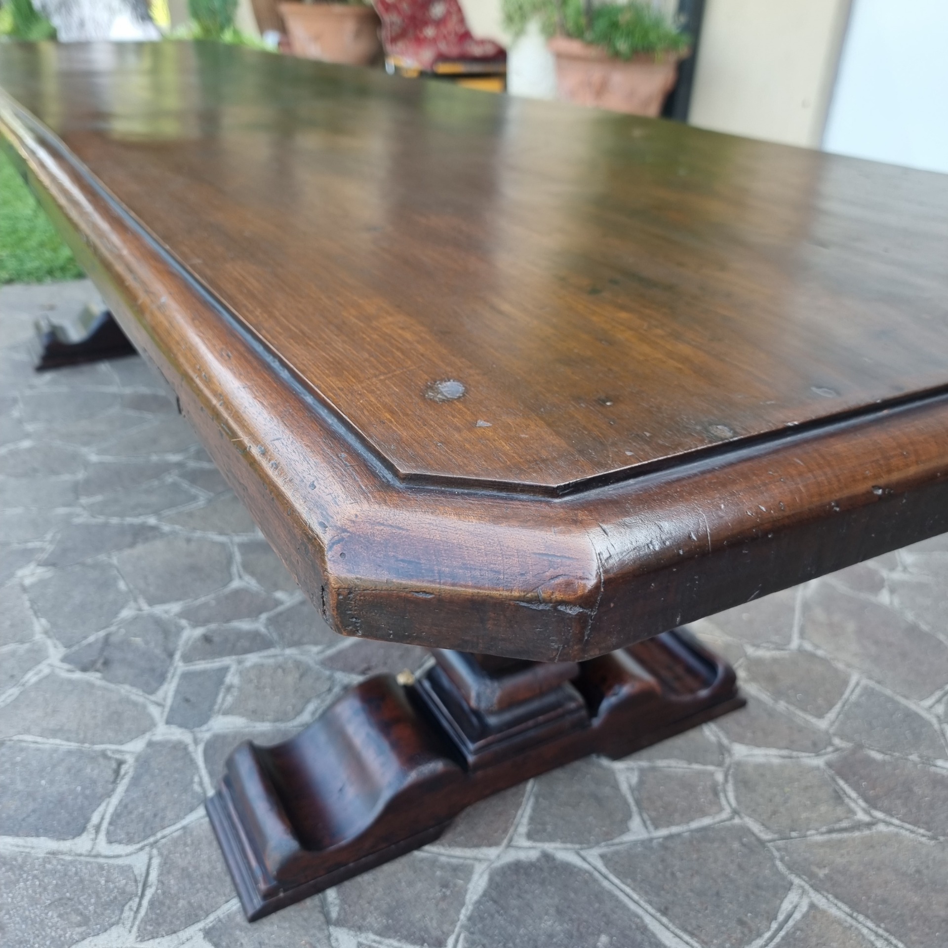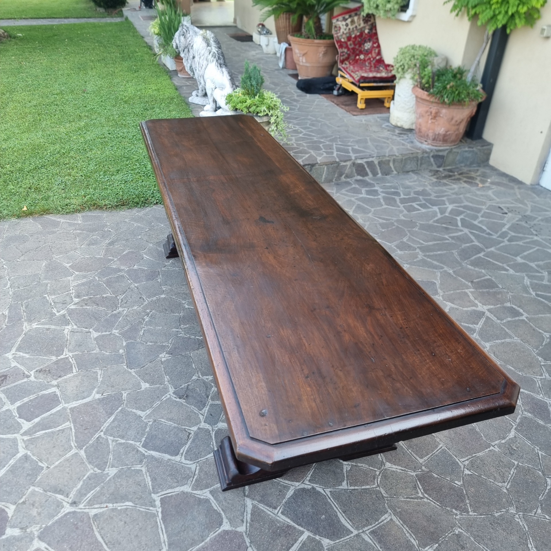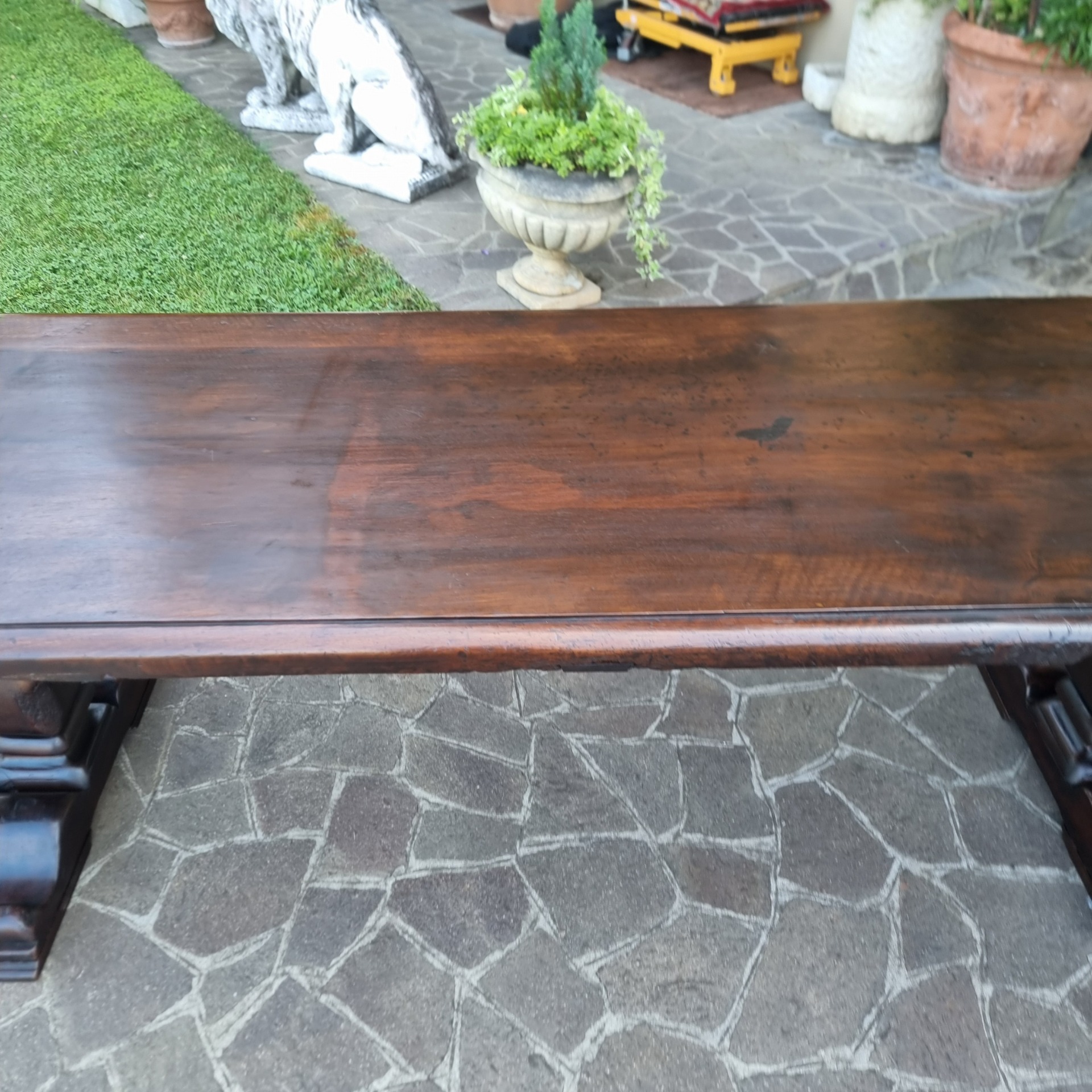 Realizzato completamente in massello di noce, questo tavolo presenta una struttura solida e proporzionata, con gambe imponenti e traverse a doppia campata. Ogni dettaglio rivela la mano esperta del falegname che lo ha creato, probabilmente per ambienti religiosi di grande prestigio.