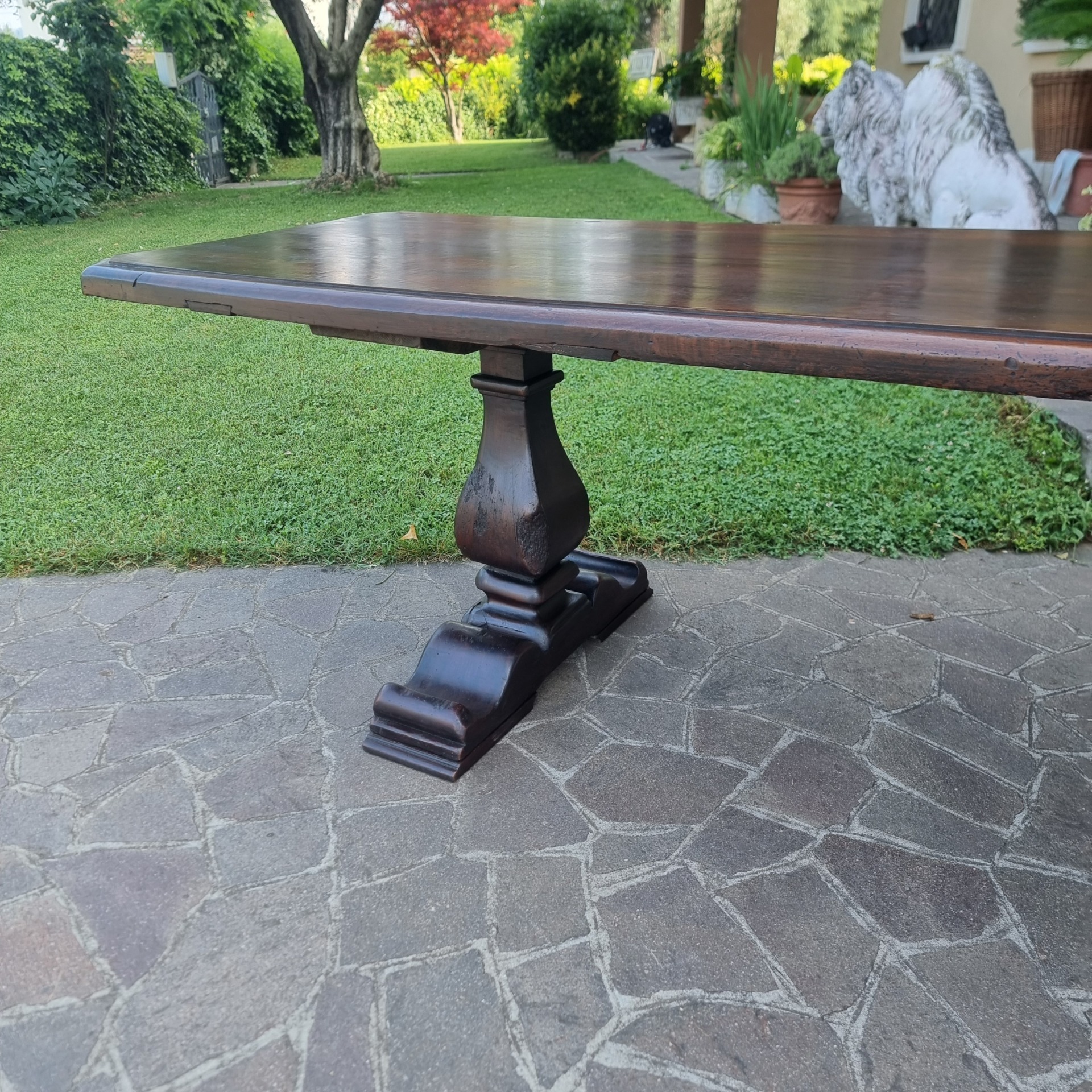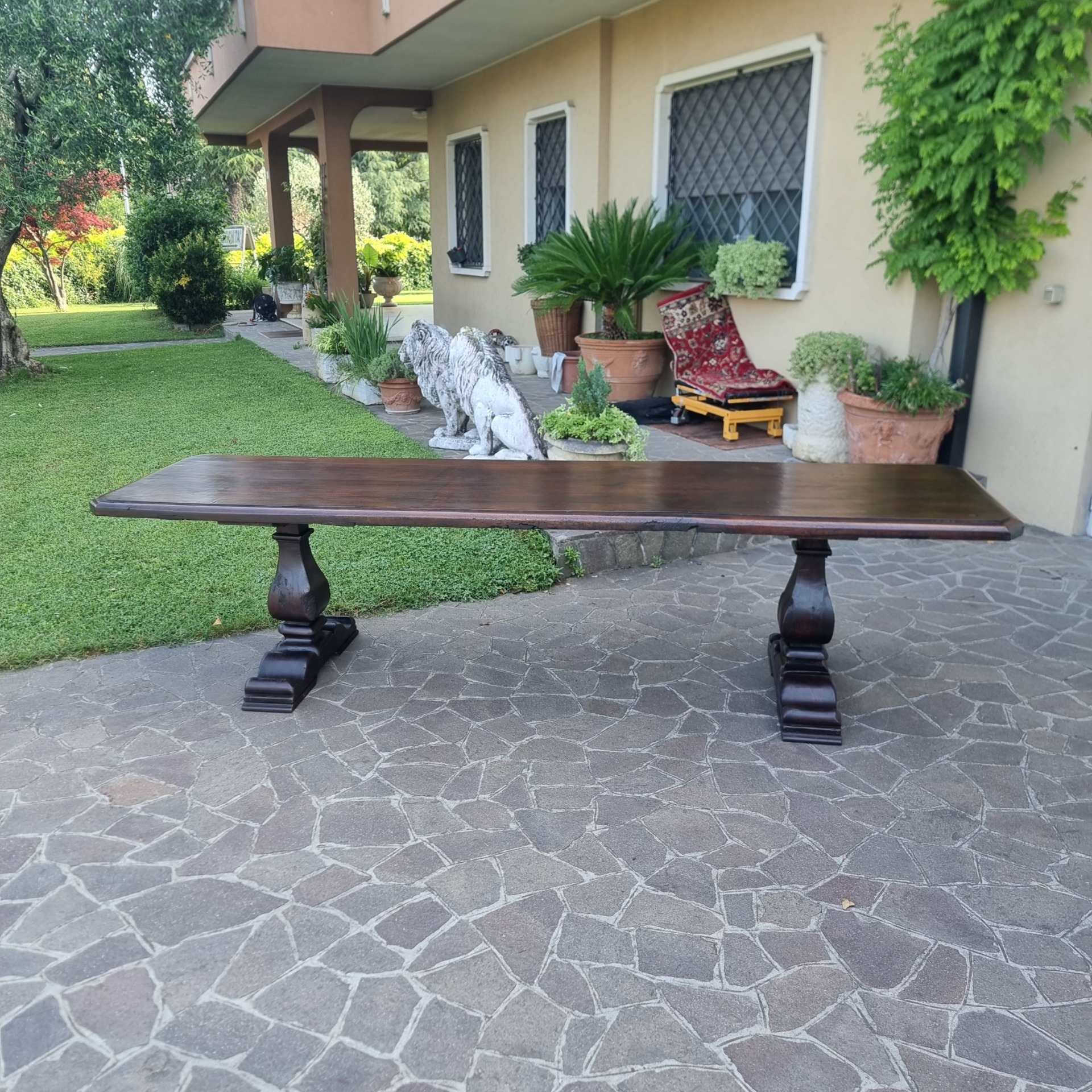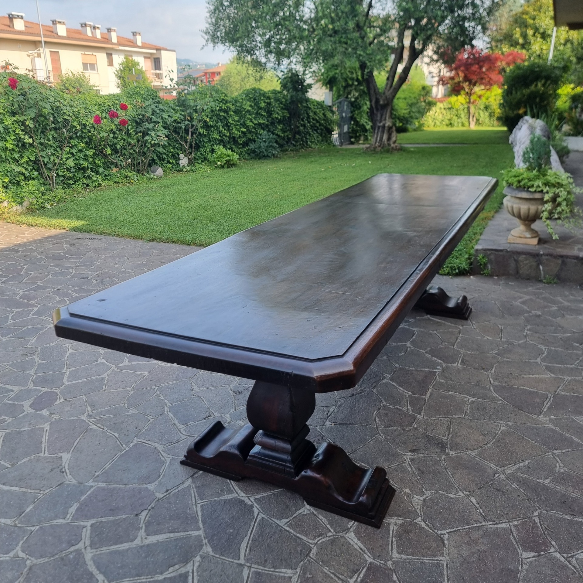 Realizzato completamente in massello di noce, questo tavolo presenta una struttura solida e proporzionata, con gambe imponenti e traverse a doppia campata. Ogni dettaglio rivela la mano esperta del falegname che lo ha creato, probabilmente per ambienti religiosi di grande prestigio.