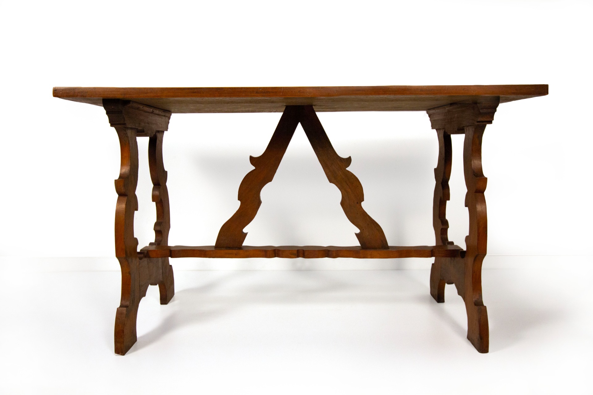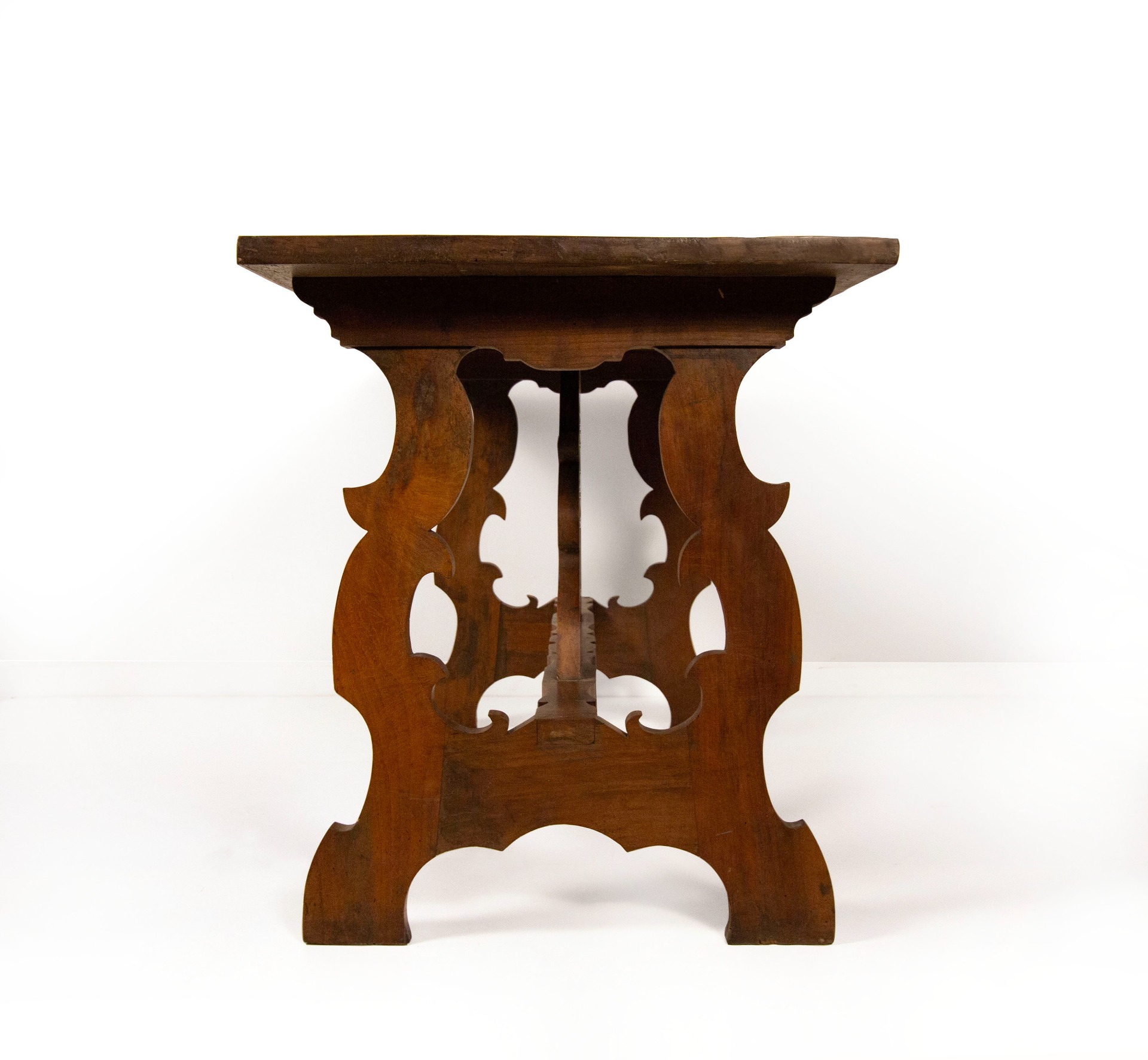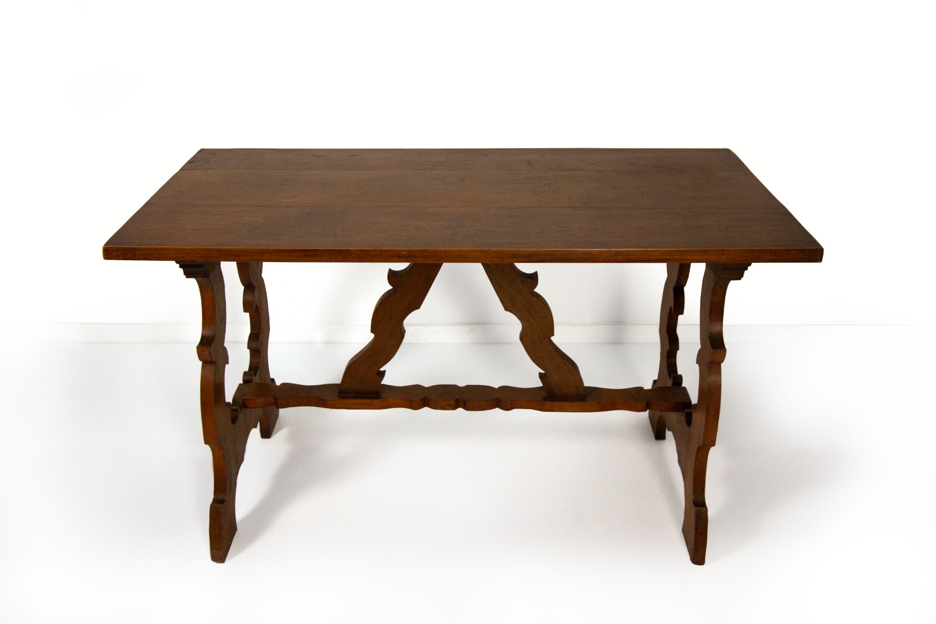 Tavolo fratino in noce, XX secolo, in stile seicentesco, piano rettangolare, montanti sagomati a lira e raccordati da tre traverse similari, cm 79,5x139x69 2025.181.29 Ad integrazione delle descrizioni, la galleria “Antichità Giglio” rende disponibili, a richiesta, condition report sullo stato di conservazione dei propri beni e preventivi di trasporto nazionali ed internazionali.