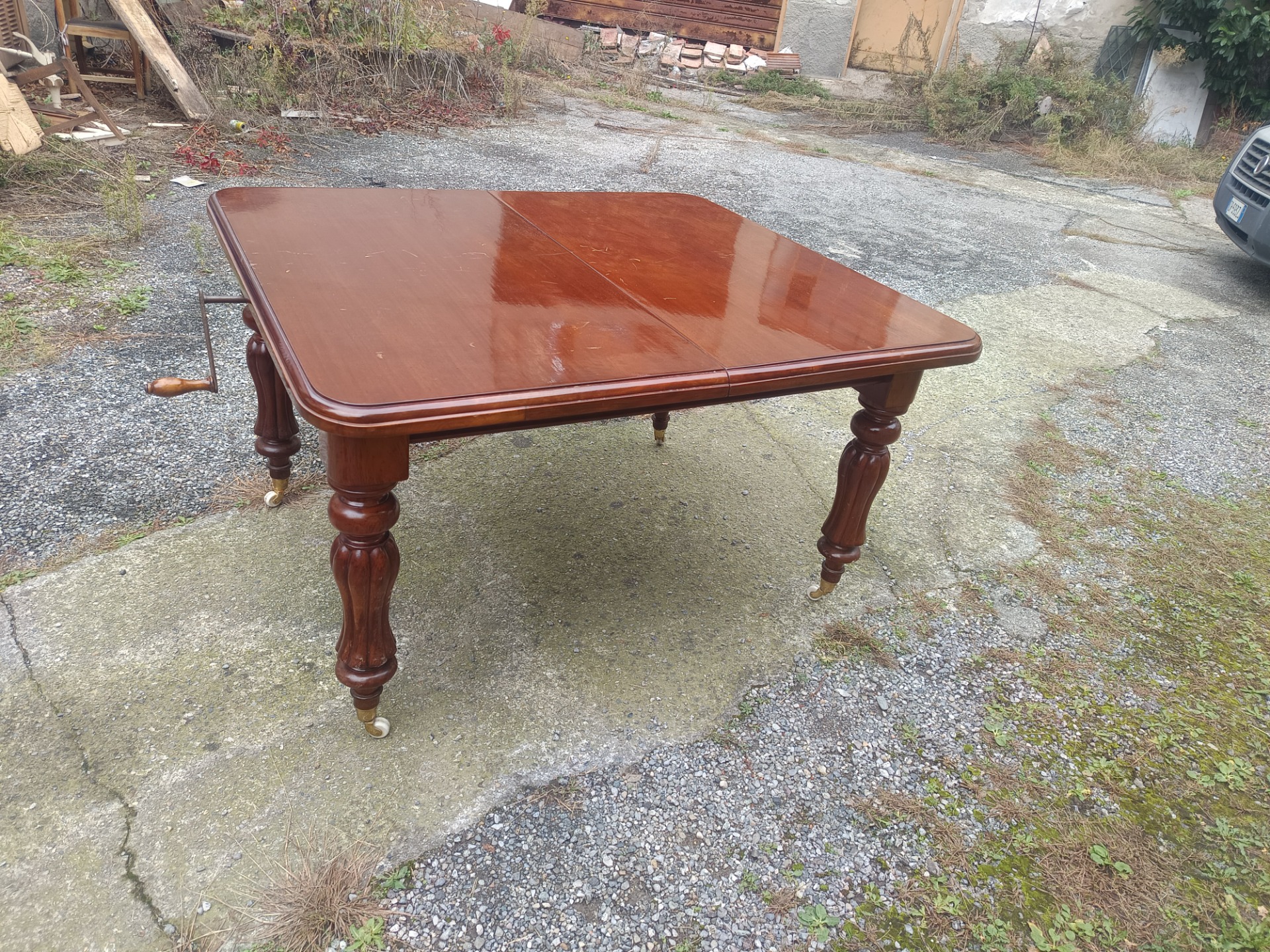 Elegante tavolo inglese in mogano dei primi del 900 con tre allunghi. Misure: cm 115 x 128 x 230