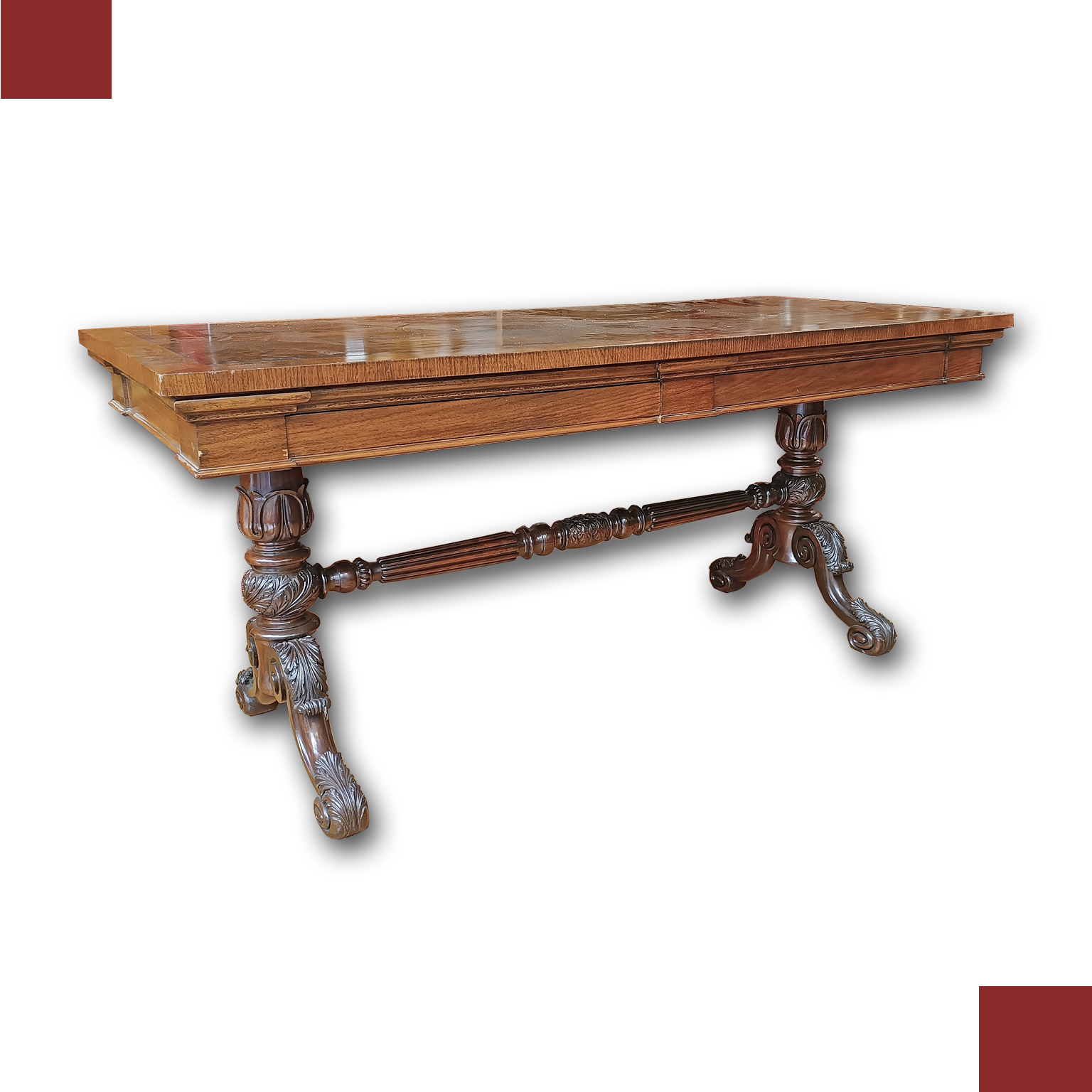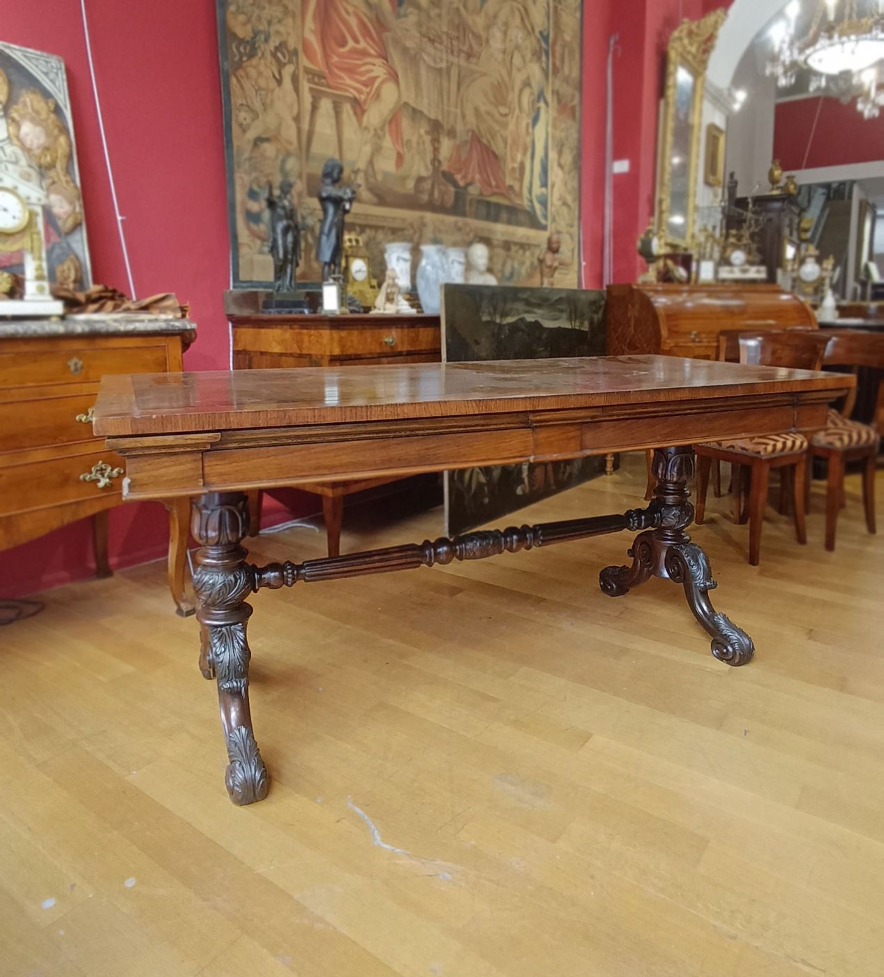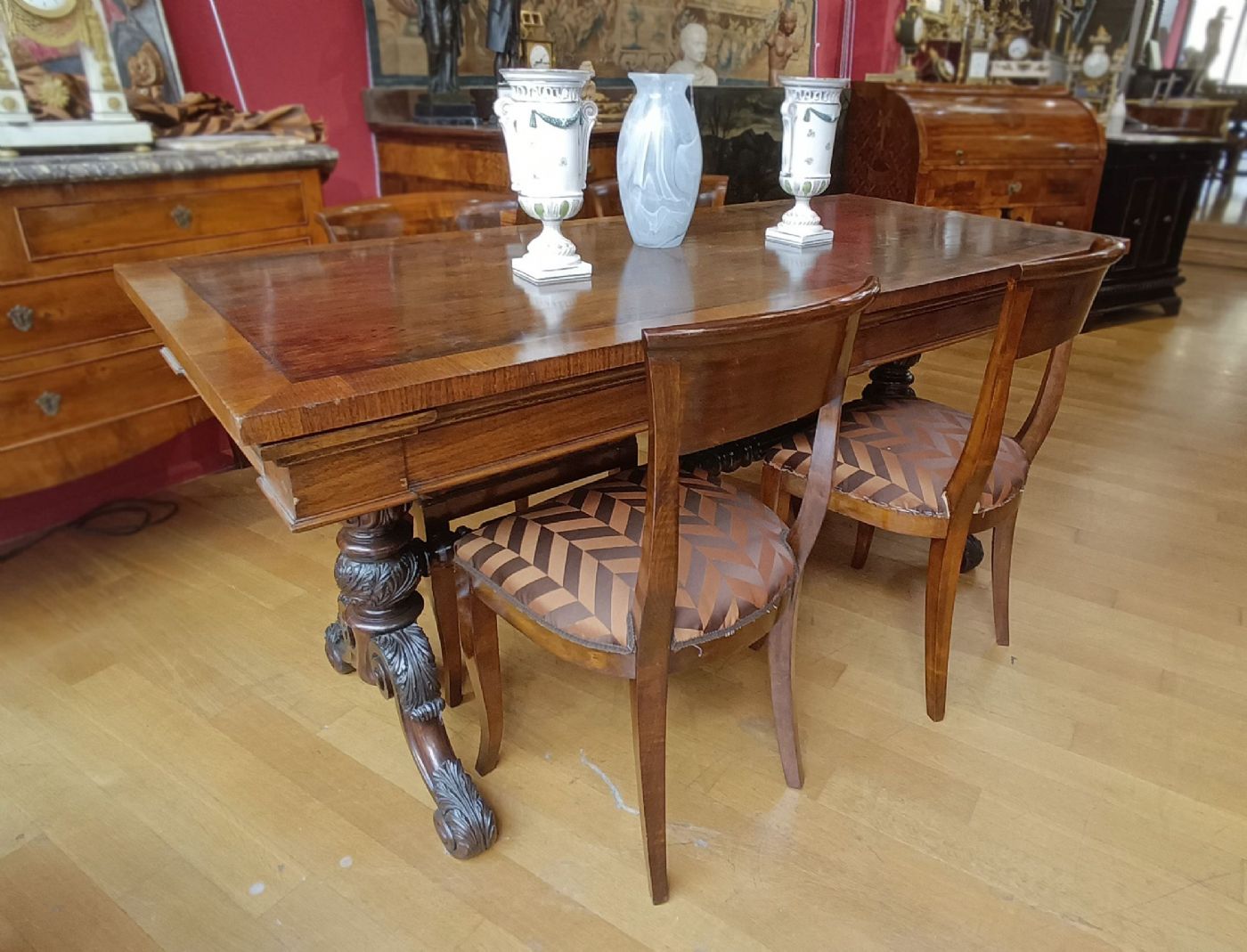 Elegante tavolo scrittoio in noce intagliato ed ebanizzato,con piano liscio e due cassetti sul fronte del sottopiano, pratici per riporreoggetti. Le gambe, in noce ebanizzato, sono costituite da due piedi e unatraversa, riccamente intagliate e modanate a decori geometrici e vegetali, tracui la foglia d’acanto. Si tratta di un tavolo di grande eleganza, capace diarredare con gusto e raffinatezza qualsiasi ambiente. Manifattura italiana, delperiodo Carlo X, intorno ai primi del XIX secolo.