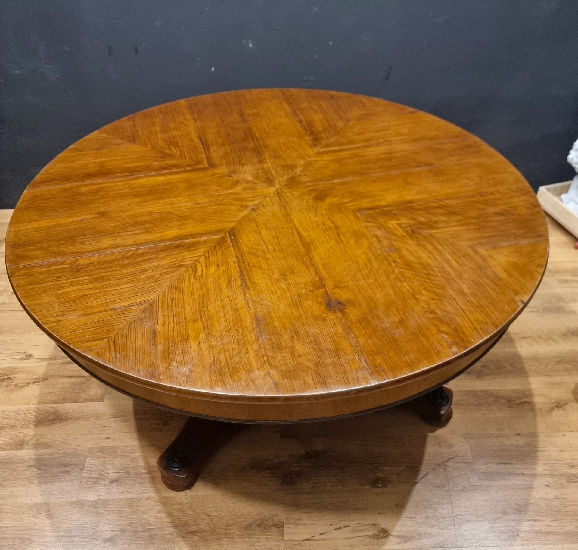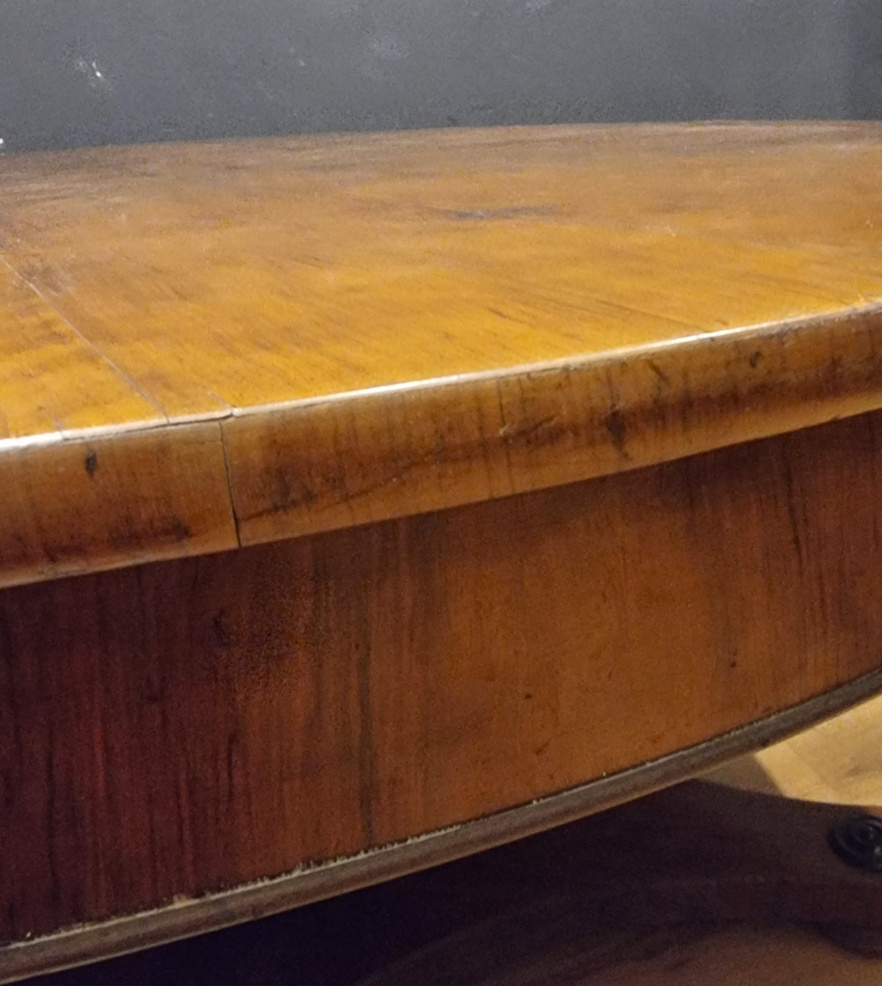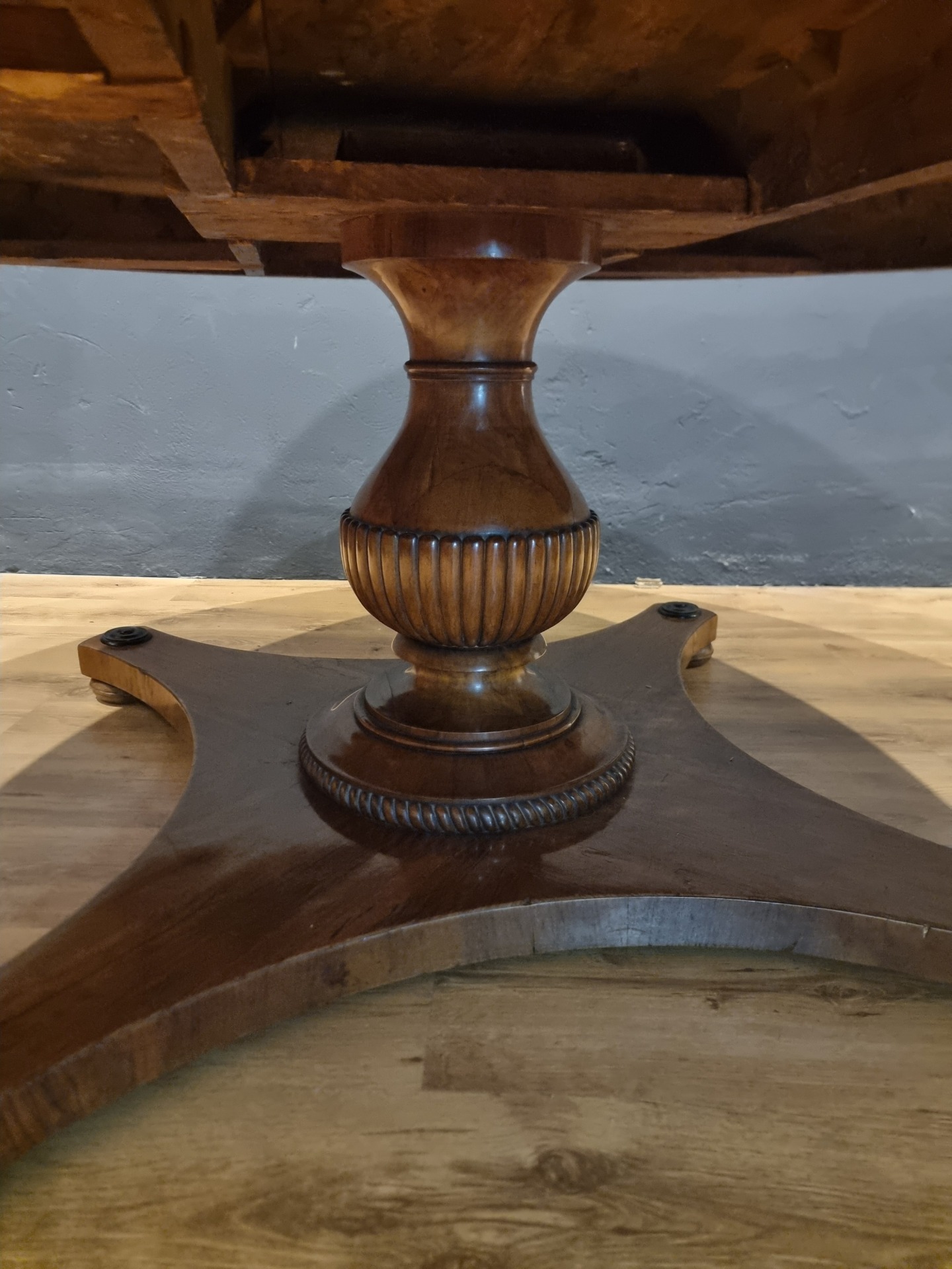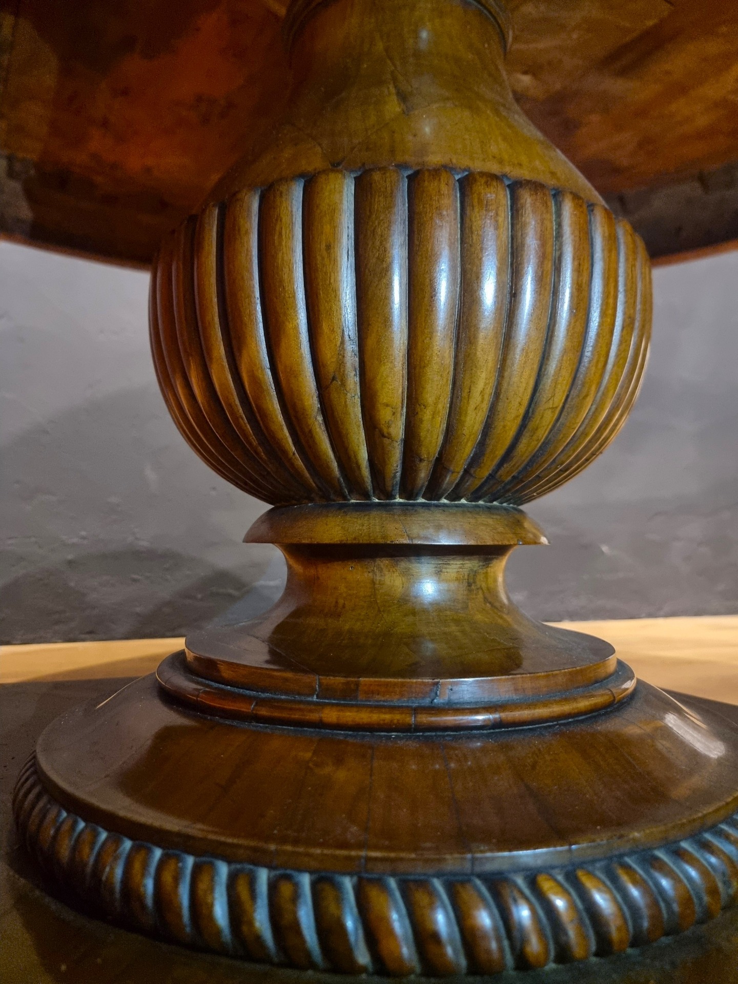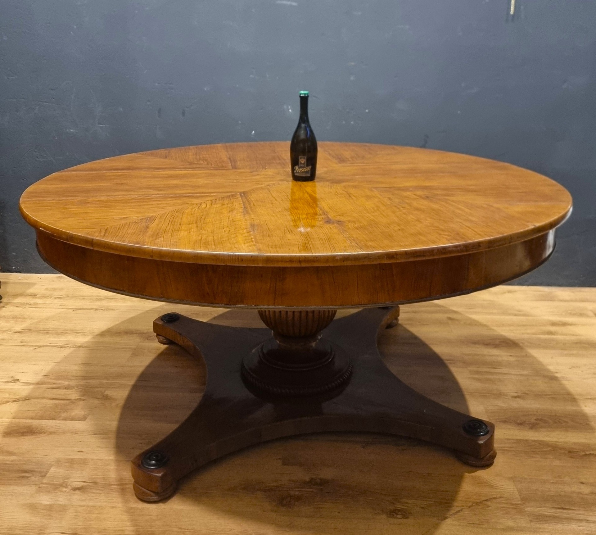 Il Tavolo tondo in noce Impero 1840 alta qualità rappresenta un capolavoro dell'artigianato antico, perfetto per chi desidera un pezzo unico. In ottime condizioni generali, con splendida patina, misura cm. 175 x h 82 cm, altezza fazzoletto 68 cm.