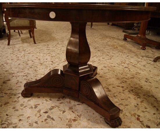 Tavolo circolare, francese di metà 1800, stile Direttorio in mogano e piuma di mogano. Presenta basamento a ceppo centrale con intagli che termina con piedini leonini.
