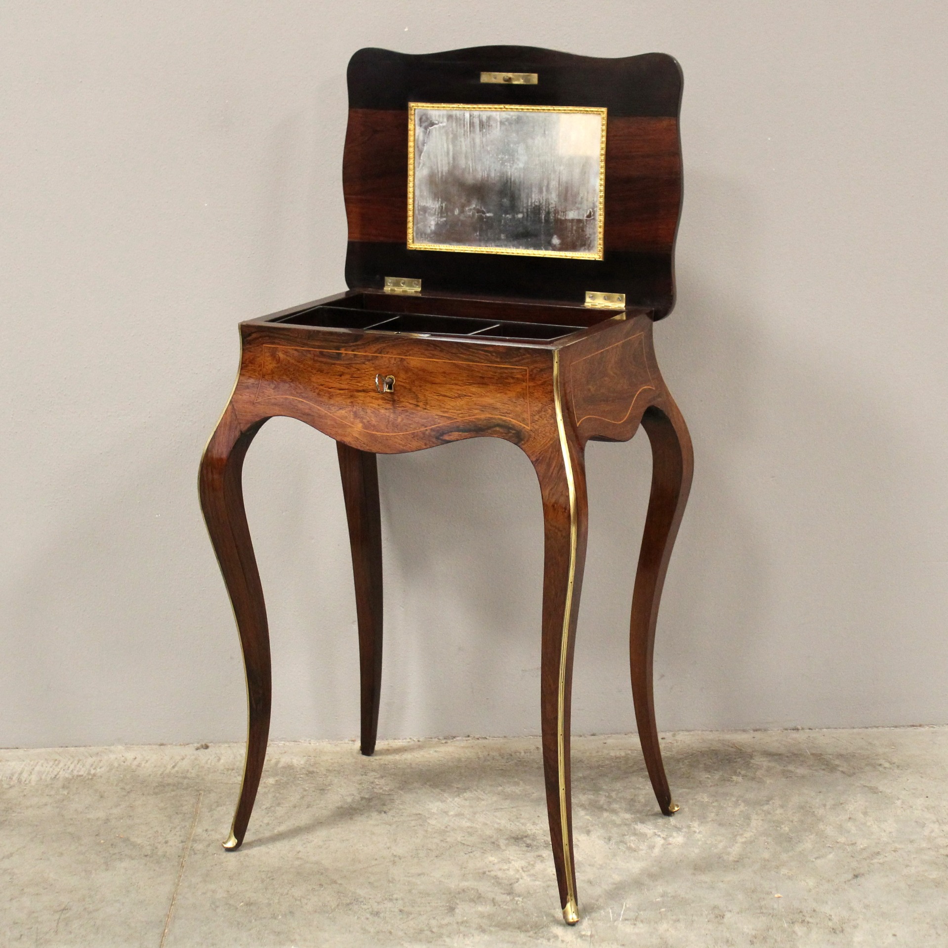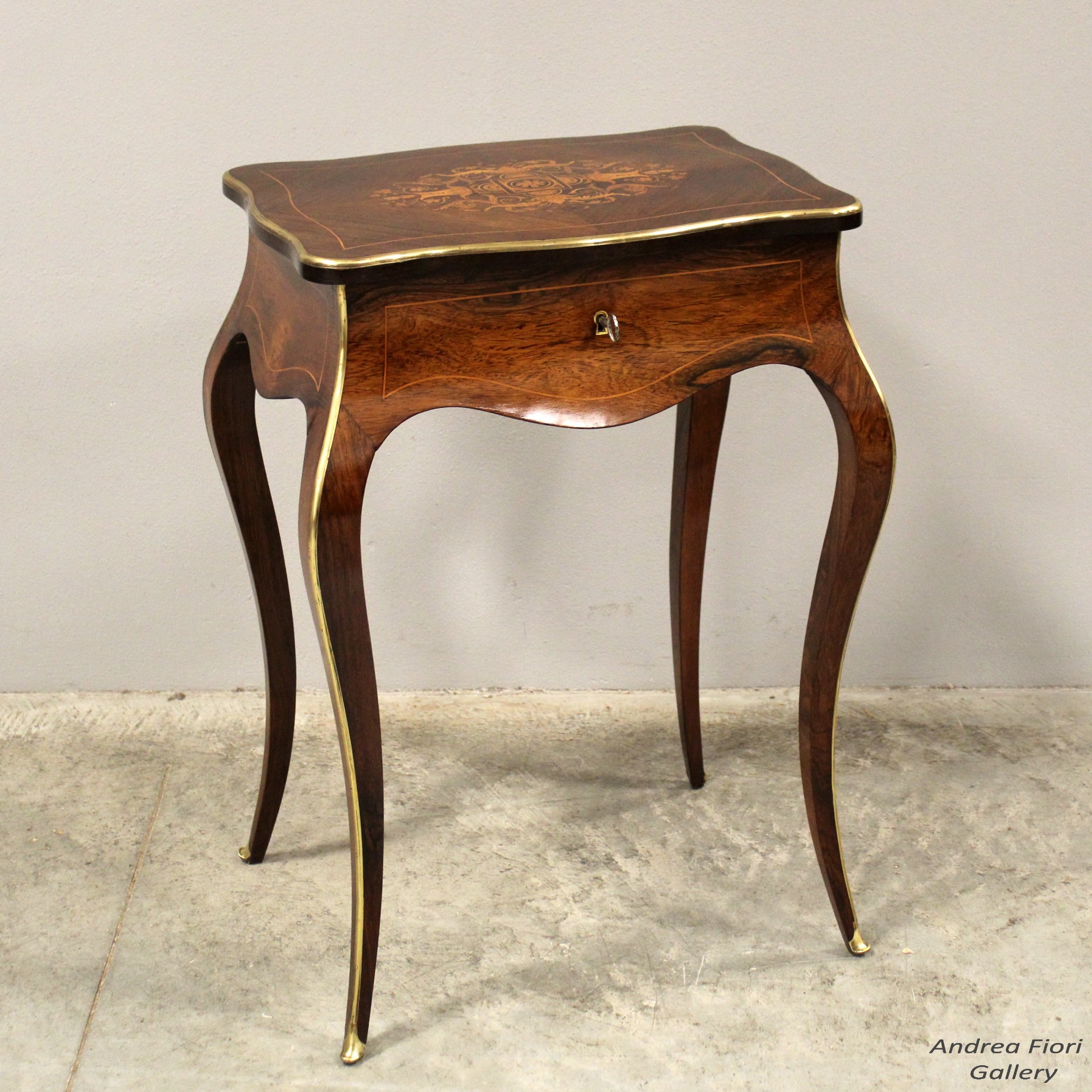 Tavolino Napoleone IIIIn palissandro , elegantemente intarsiato e filettato in vari legni pregiati