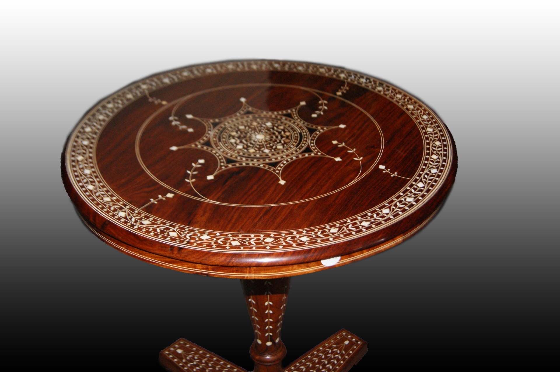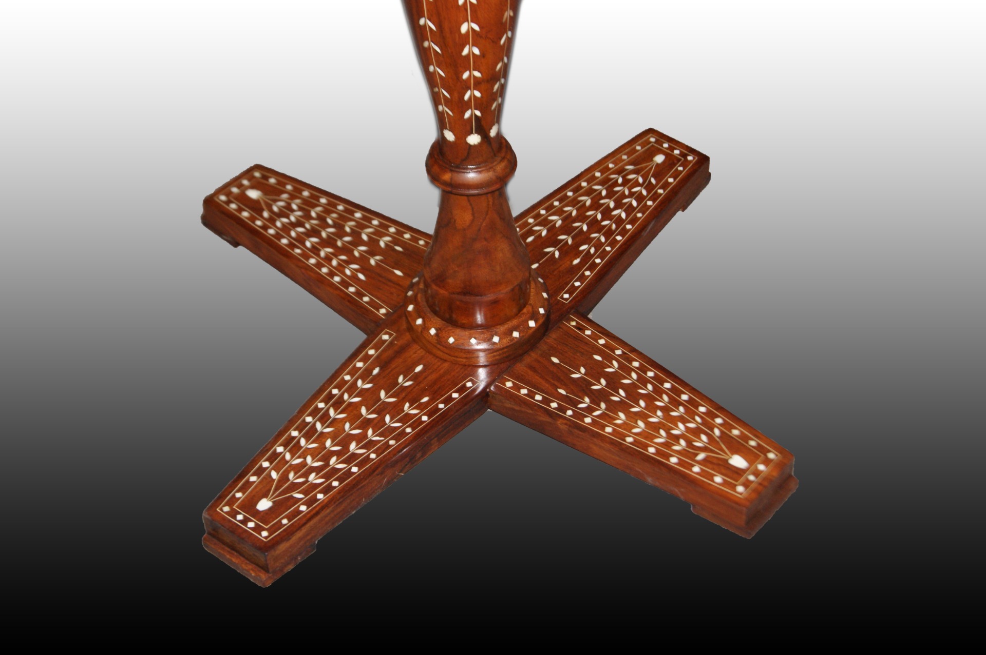 Bellissimo tavolino circolare inglese di metà 1800, stile Orientale, in legno di palissandro. Presenta ricchi intarsi in avorio sul piano, basamento a ceppo centrale anch'esso riccamente intarsiato.