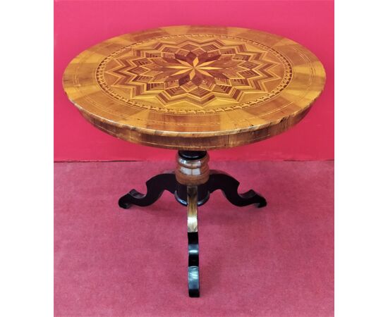 Tavolino da salotto con intarsi geometrici sul piano e sul fusto.