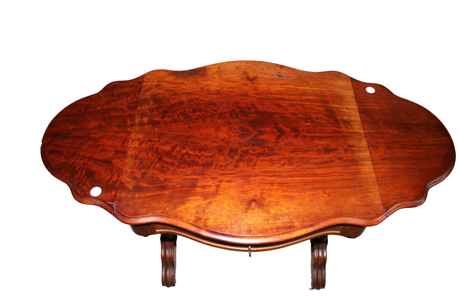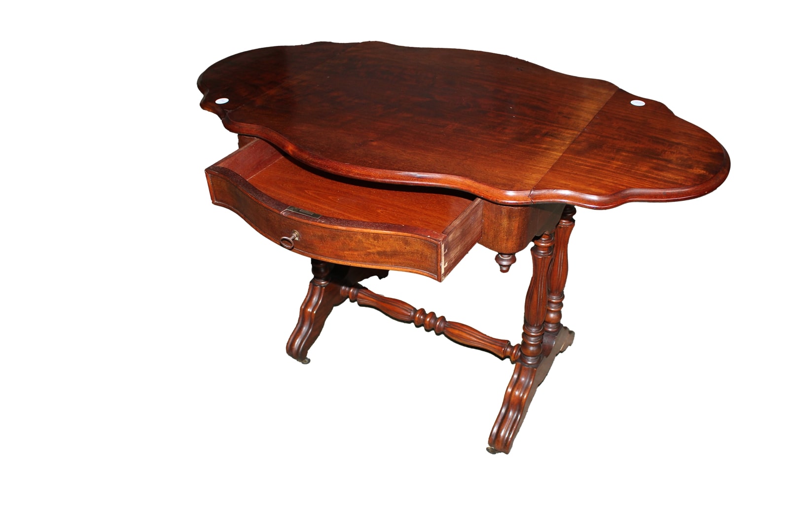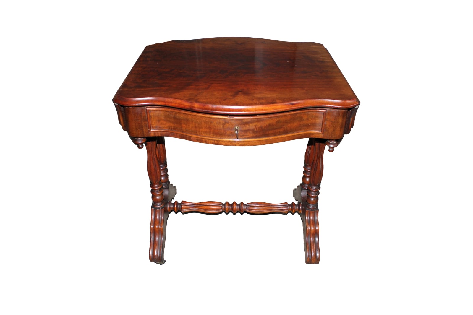 Elegante tavolino da salotto realizzato in pregiato legno di mogano, caratterizzato da una linea morbida e armoniosa tipica dello stile Luigi Filippo. Il piano smerlato con alette laterali conferisce leggerezza e versatilità alla forma, mentre le gambe tornite e finemente intagliate testimoniano l’abilità artigianale dell’epoca. Completa la struttura un pratico cassetto sottopiano con serratura originale