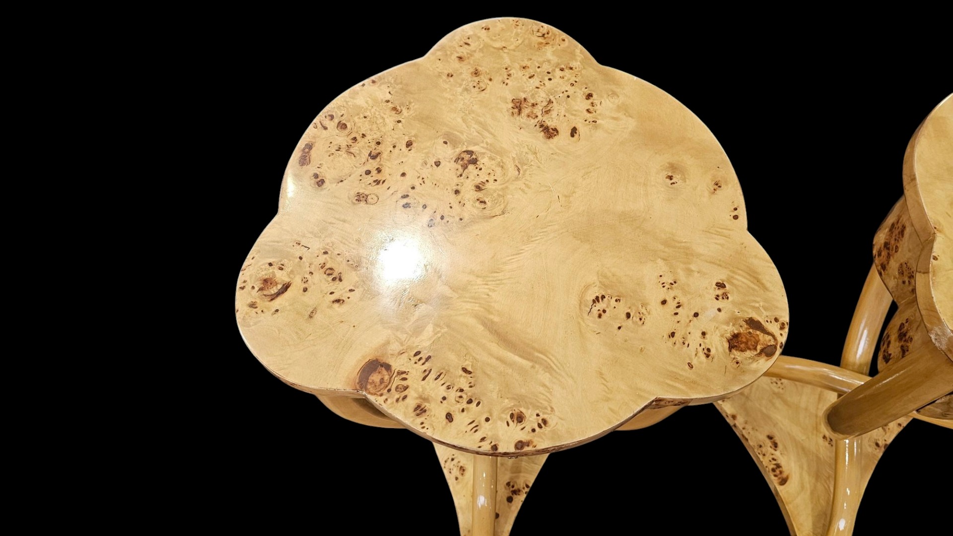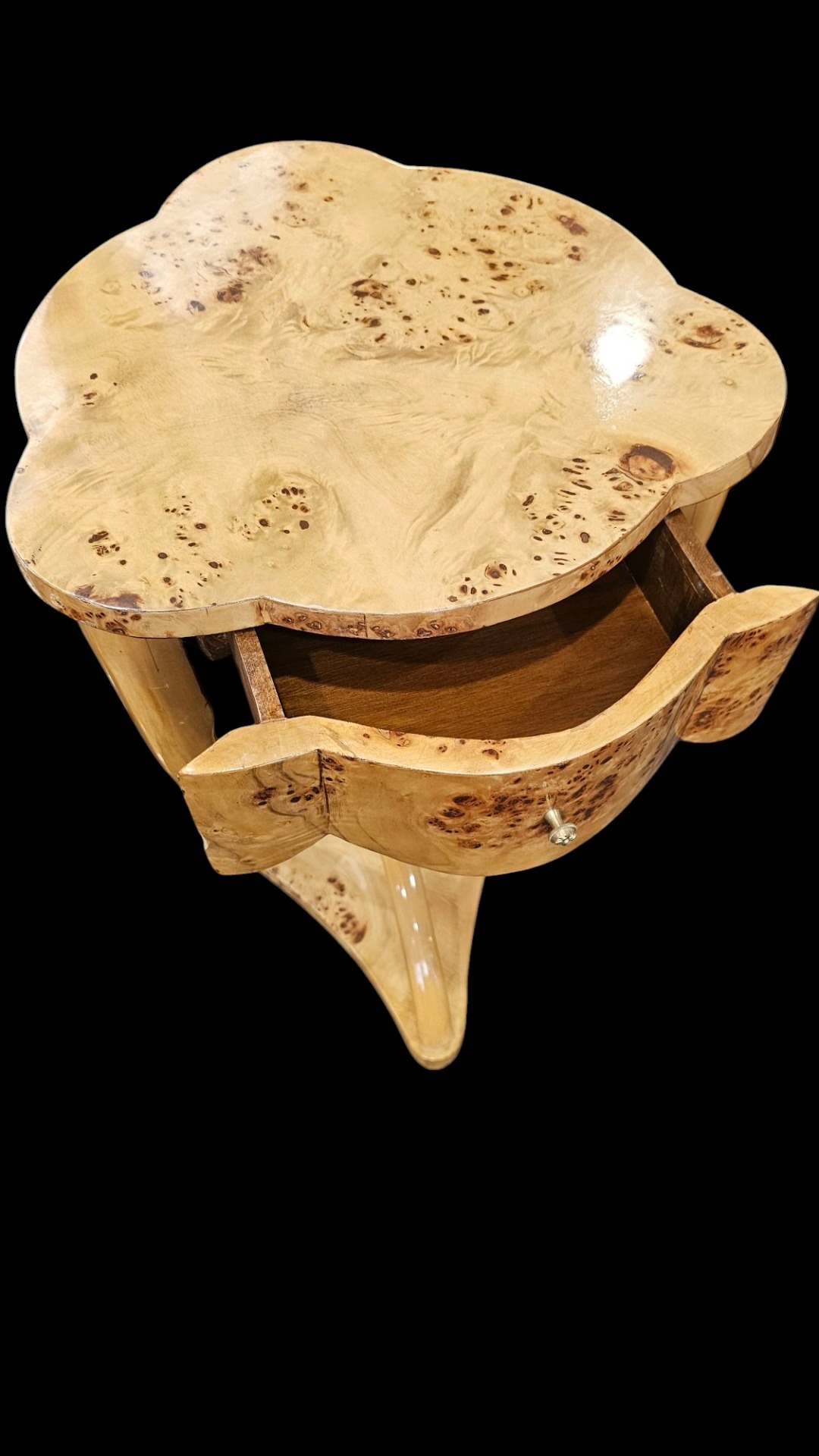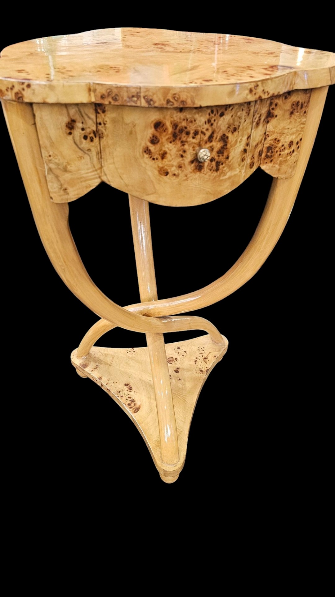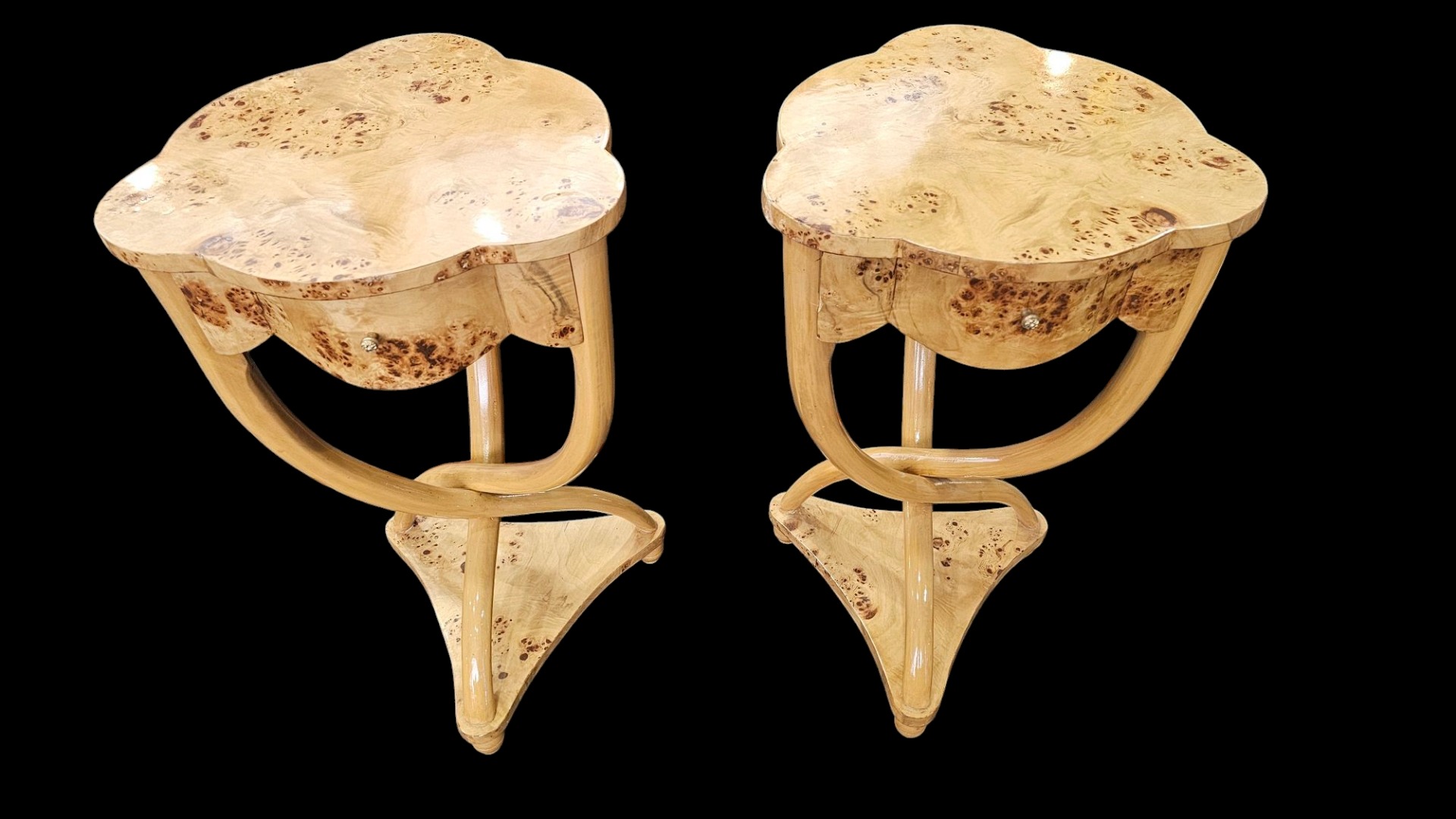 Coppia di tavolini francesi, in radica di betoul, con un cassetto, gambe mosse. Misura quarantadue per quarantadue al terza settanta