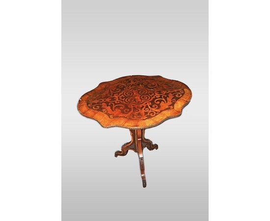 Tavolino francese smerlato a vela della seconda metà del 1800, stile Luigi XV, in legno di palissandro e bois de rose. Presenta piano riccamente intarsiato e basamento a ceppo centrale con applicazioni in bronzo.