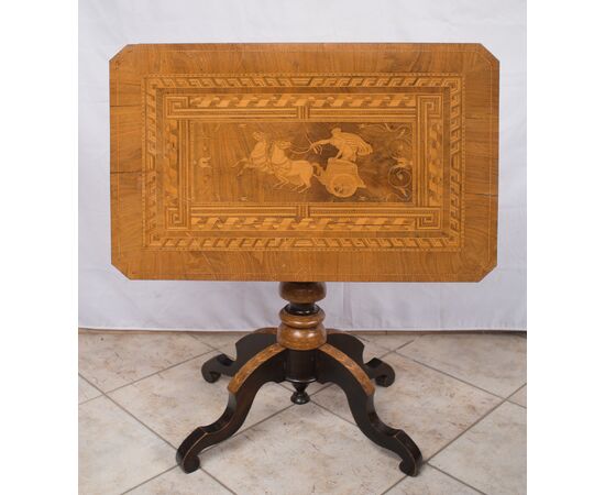 Il piano presenta un intarsio centrale raffigurante una biga con guerriero ed è contornato da riserve in legni pregiati.