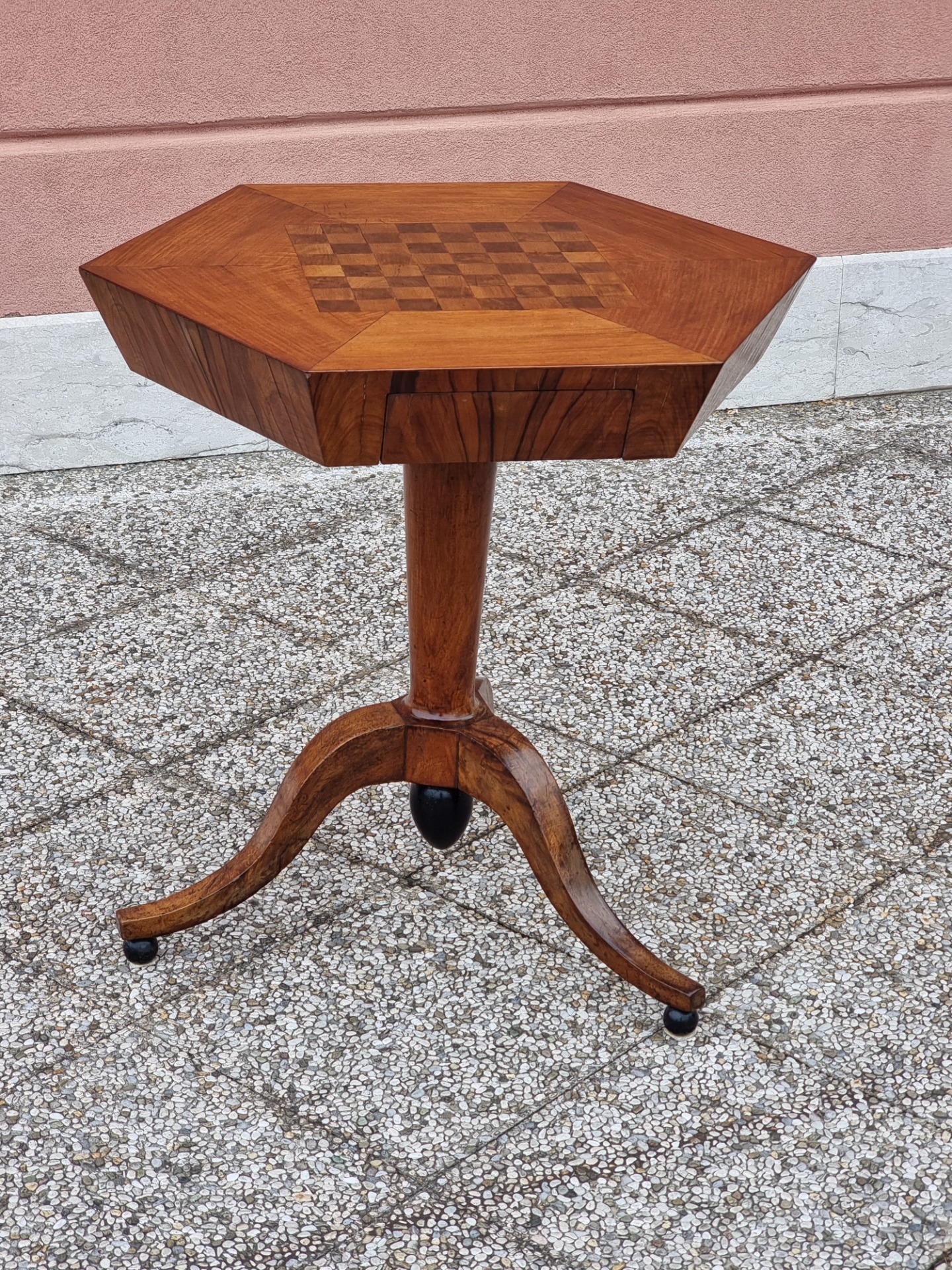 Tavolino da gioco esagonale con scacchiera, in noce, primi Ottocento