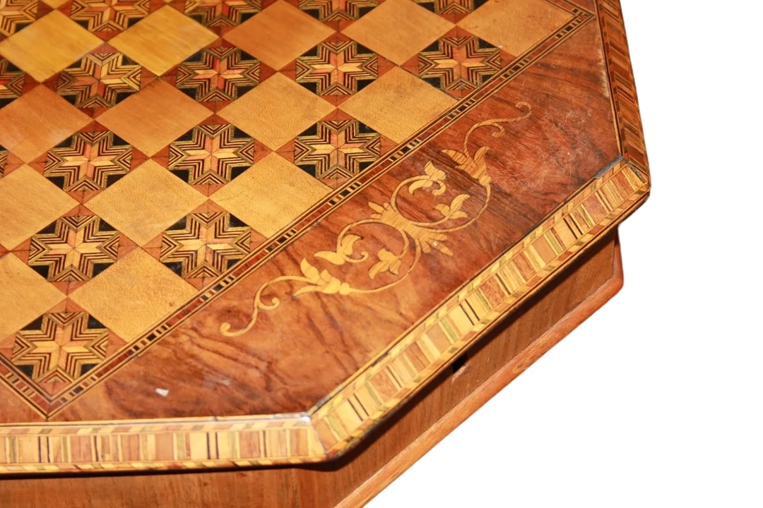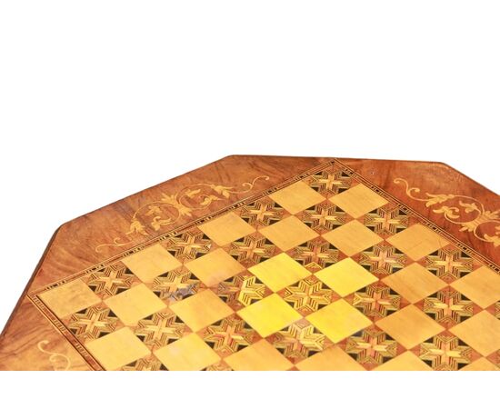 Tavolino da lavoro inglese della seconda metà del 1800 stile Vittoriano in legno di noce. Presenta piano di forma ottagonale riccamente intarsiato a motivo floreale con scacchiera, corpo ad imbuto che si dirama in tre piedini intagliati.