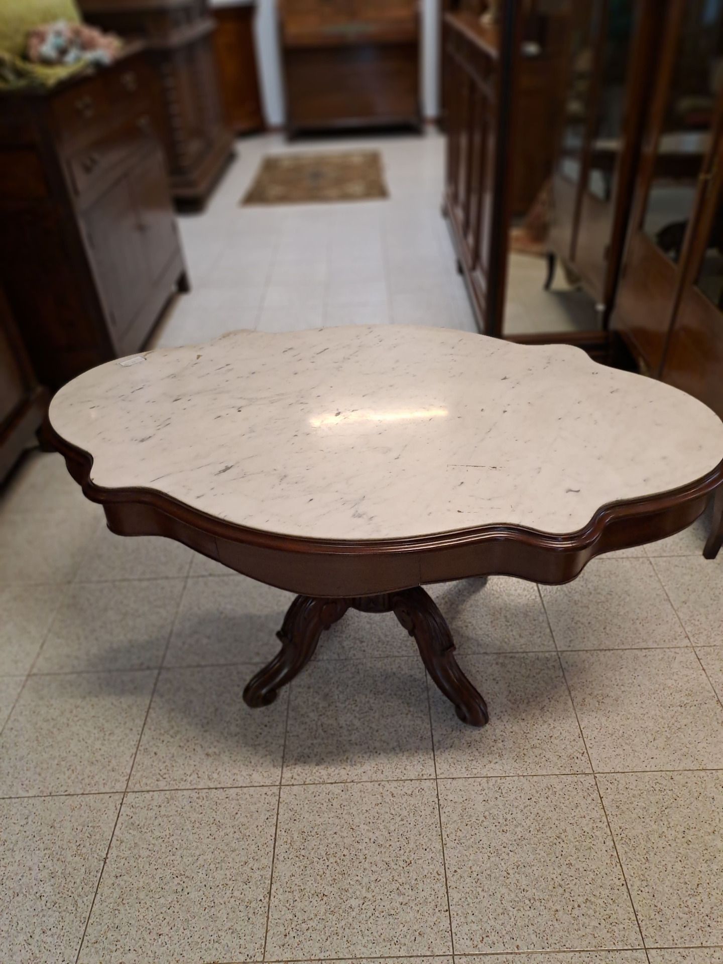 in mogano, con piano in marmo. Dimensioni: Altezza 62 cm – 130 x 80 cm Spese di spedizione a carico cliente. Per maggiori informazioni: info@antichitadaziano.com