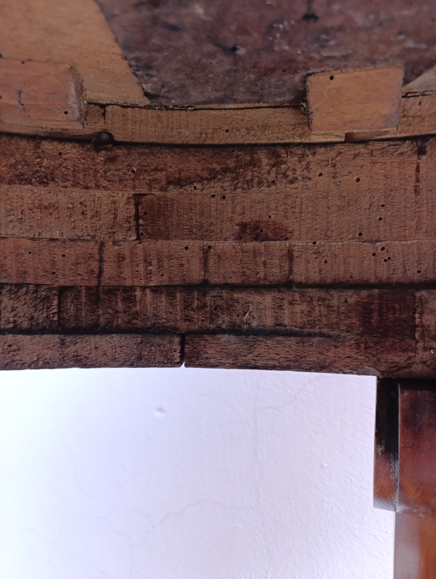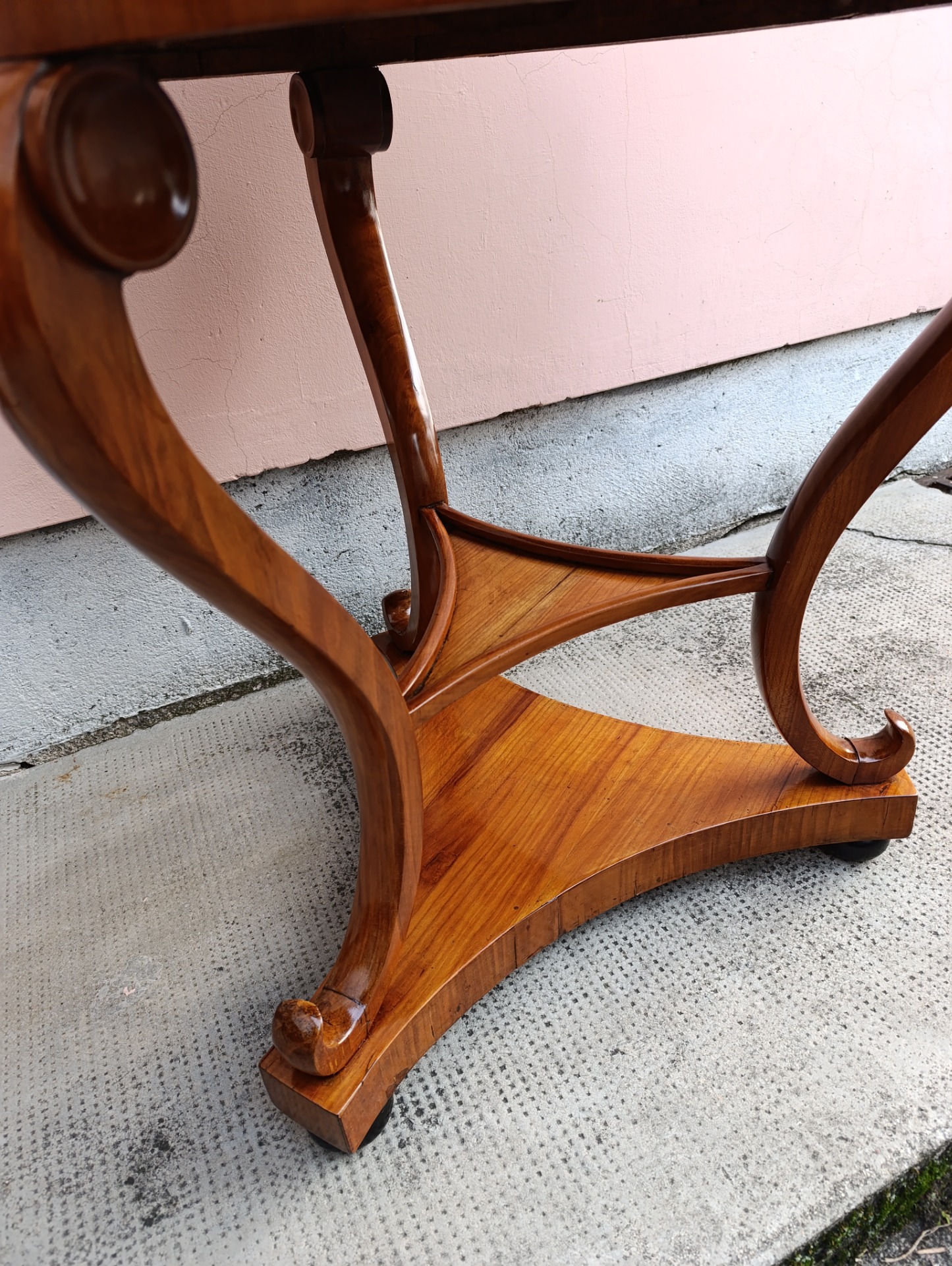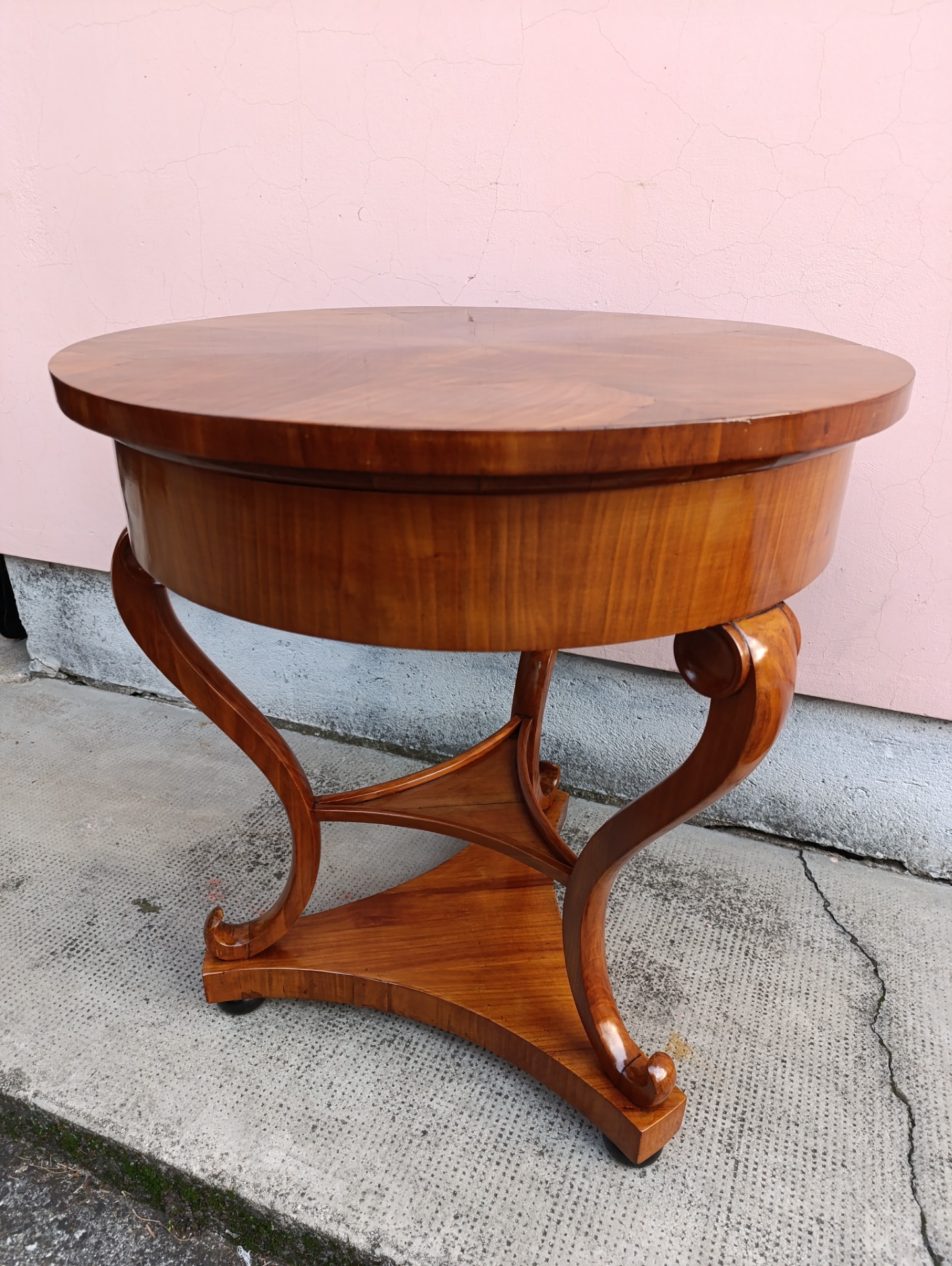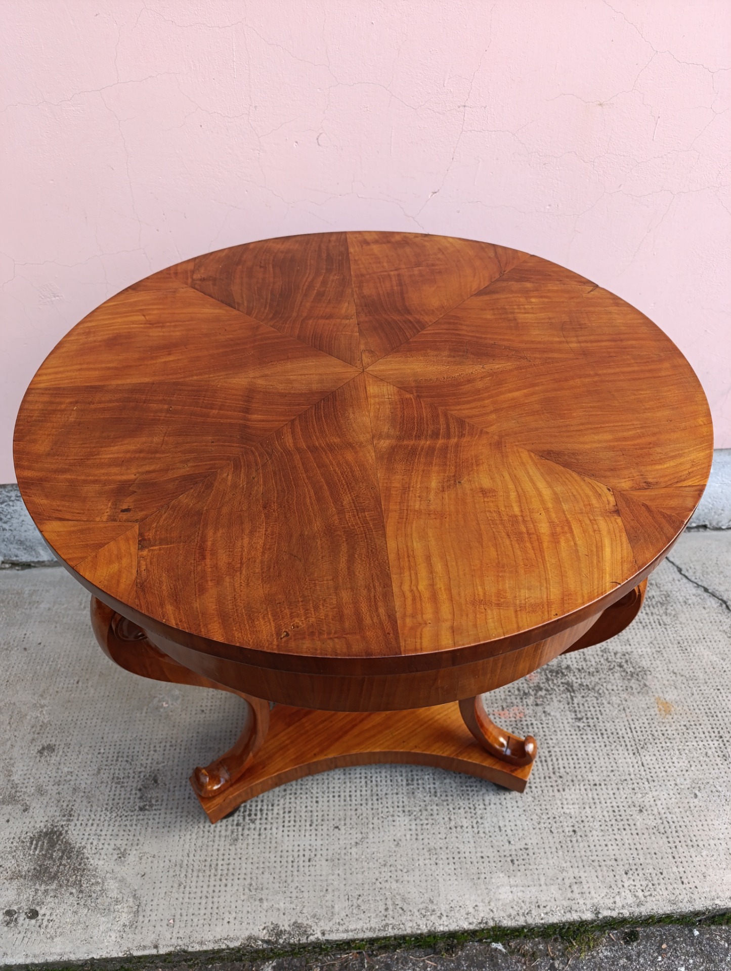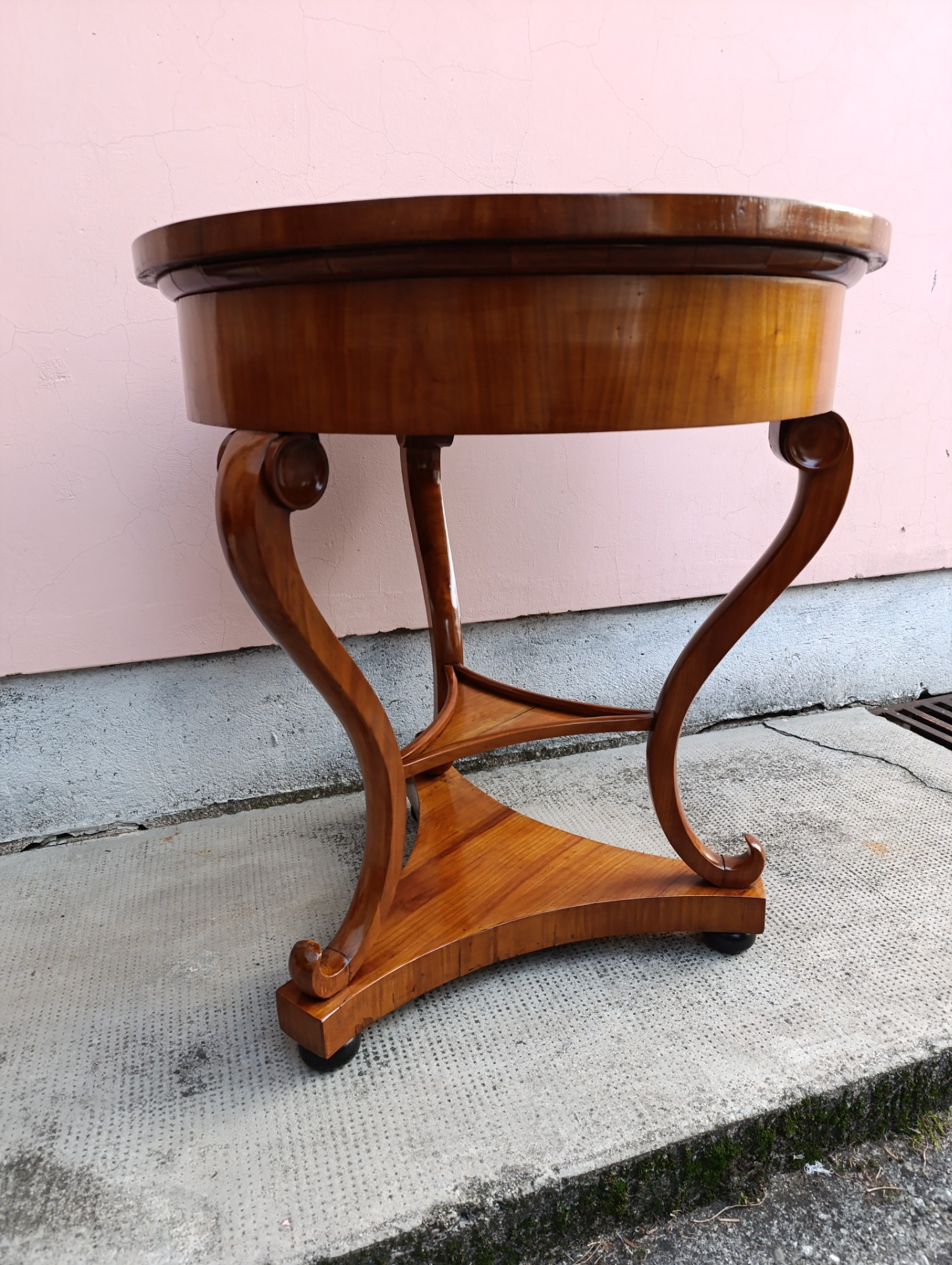 Tavolino rotondo in ciliegio lastronato bellissimo movimento delle gambe.Epoca 800.