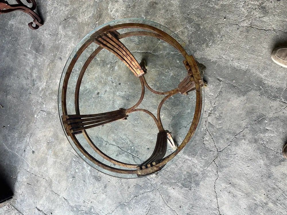 Questo raffinato tavolino in ferro bronzato proviene dall’Italia dei primi decenni del XX secolo e conquista al primo sguardo grazie alla sua estetica nobile e scultorea. La struttura circolare, composta da quattro slanciate lamelle di ferro sapientemente curvate, accoglie un solido piano in vetro molato che lascia intravedere l’eleganza dell’intelaiatura sottostante.Su ciascun supporto campeggia un’imponente maschera di leone in bronzo, simbolo di potere e protezione, che aggiunge un tocco monumentale al mobile. Alla base, i piedi a zampa felina in ottone dorato assicurano stabilità e continuità stilistica, creando un dialogo armonioso tra materiali e finiture.Materiale: ferro bronzato, e ottone doratoEpoca: XX secolo (circa 1900-1930)Stile: gusto neoclassico con richiami décoCondizioni: ottime, con leggera patina coerente con l’etàUtilizzo: coffee table, tavolino da centro, complemento d’accentoL’affascinante finitura bronzata, ottenuta con sapienti tecniche di ossidazione, restituisce calde sfumature ambrate che dialogano con la lucentezza del vetro. Il tavolino si inserisce con disinvoltura tanto in interni classici quanto in ambienti contemporanei, dove diventa protagonista assoluto grazie al suo carattere scenografico.Perfetto per esporre libri d’arte, una composizione floreale o un prezioso servizio da tè, questo pezzo garantisce valore aggiunto a salotti, ingressi o suite d’hotel di charme. Grazie alle dimensioni contenute, può essere facilmente collocato al centro di un’area conversazione o accanto a un divano.L’articolo è stato controllato dai nostri restauratori: la struttura è solida, il vetro privo di scheggiature, le applicazioni in bronzo ben fissate. Su richiesta offriamo servizio di imballo professionale e spedizione assicurata in tutto il mondo.Regalati o regala un oggetto dal fascino intramontabile, testimonianza della migliore tradizione artigianale italiana.Materiale: FerroAltezza (cm): 63Diametro: 56Epoca: XX Secolo - 1900