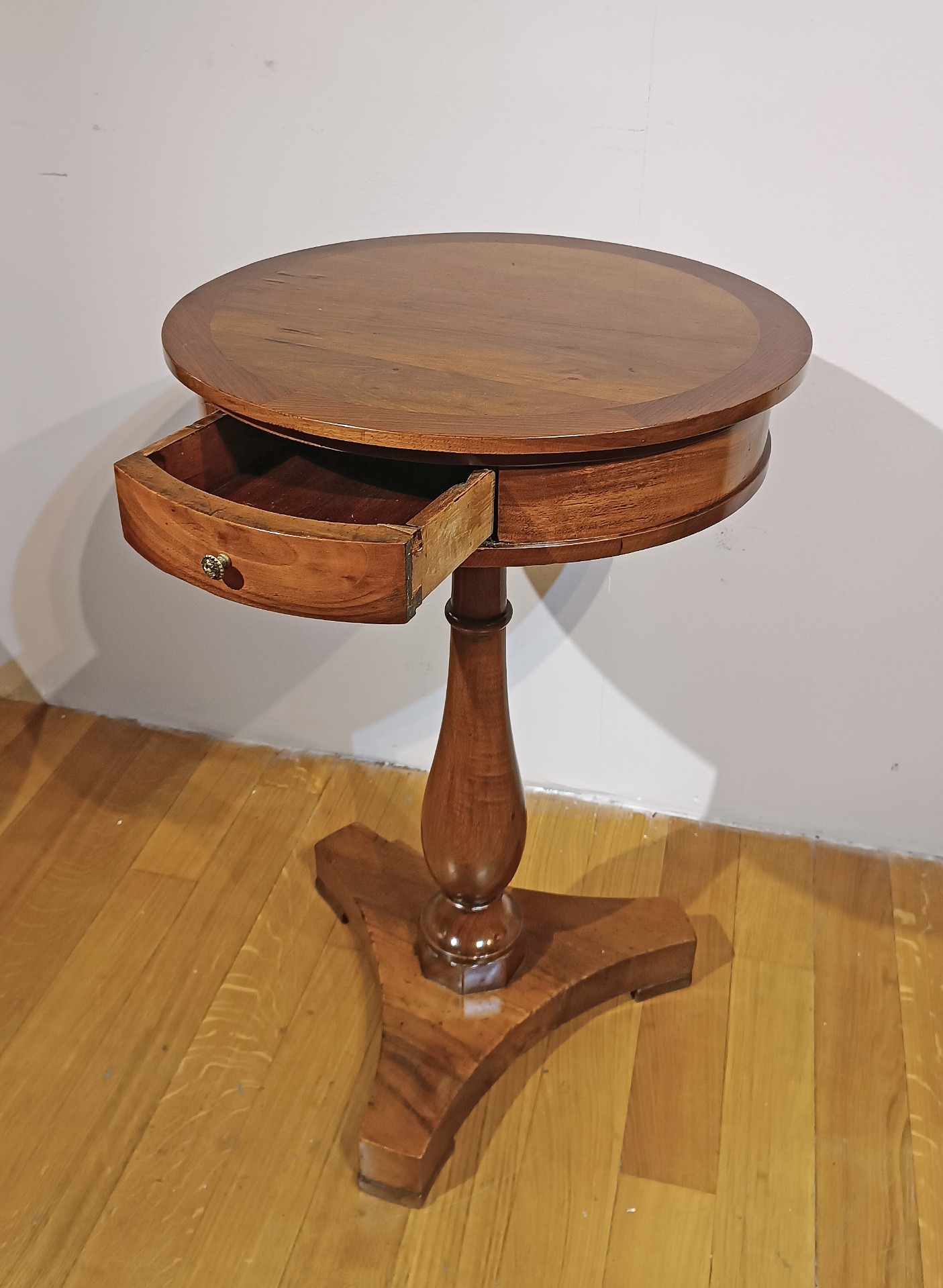 Raffinato tavolino lastronato in legno di ciliegio e noce. La sua gamba centrale, tornita in massello di noce, si distingue per eleganza, con un piede triangolare che ne completa la linea. Il piano rotondo è impreziosito da una fascia esterna in ciliegio, conferendo un tocco di raffinatezza in più. Completato da un piccolo cassetto, ideale per riporre oggetti di uso quotidiano, questo tavolino unisce funzionalità e stile in un design sofisticato. Manifattura toscana del periodo Carlo X, intorno alla metà del XIX secolo.