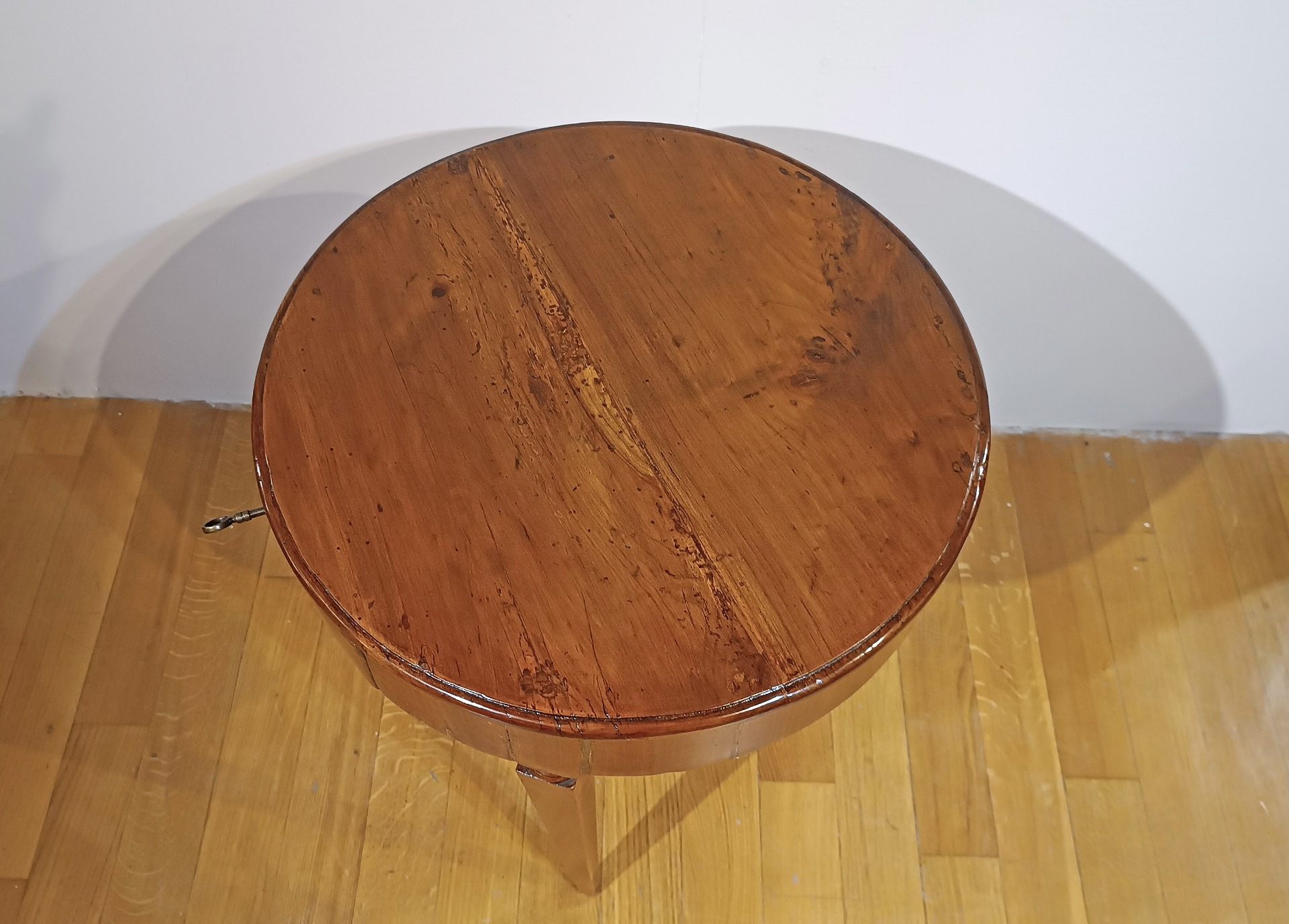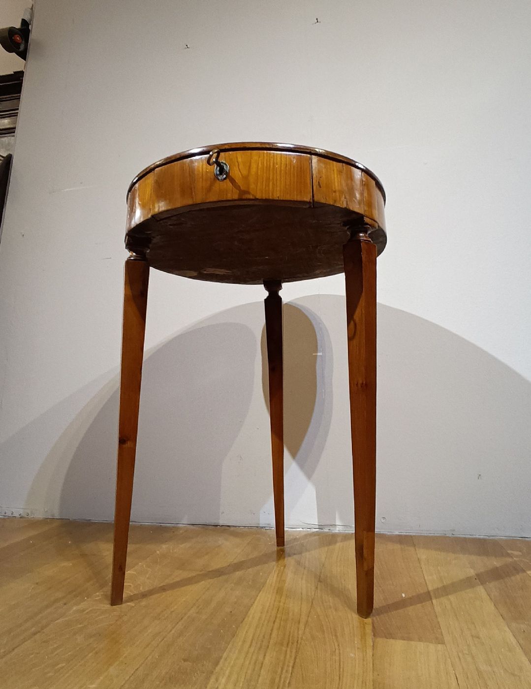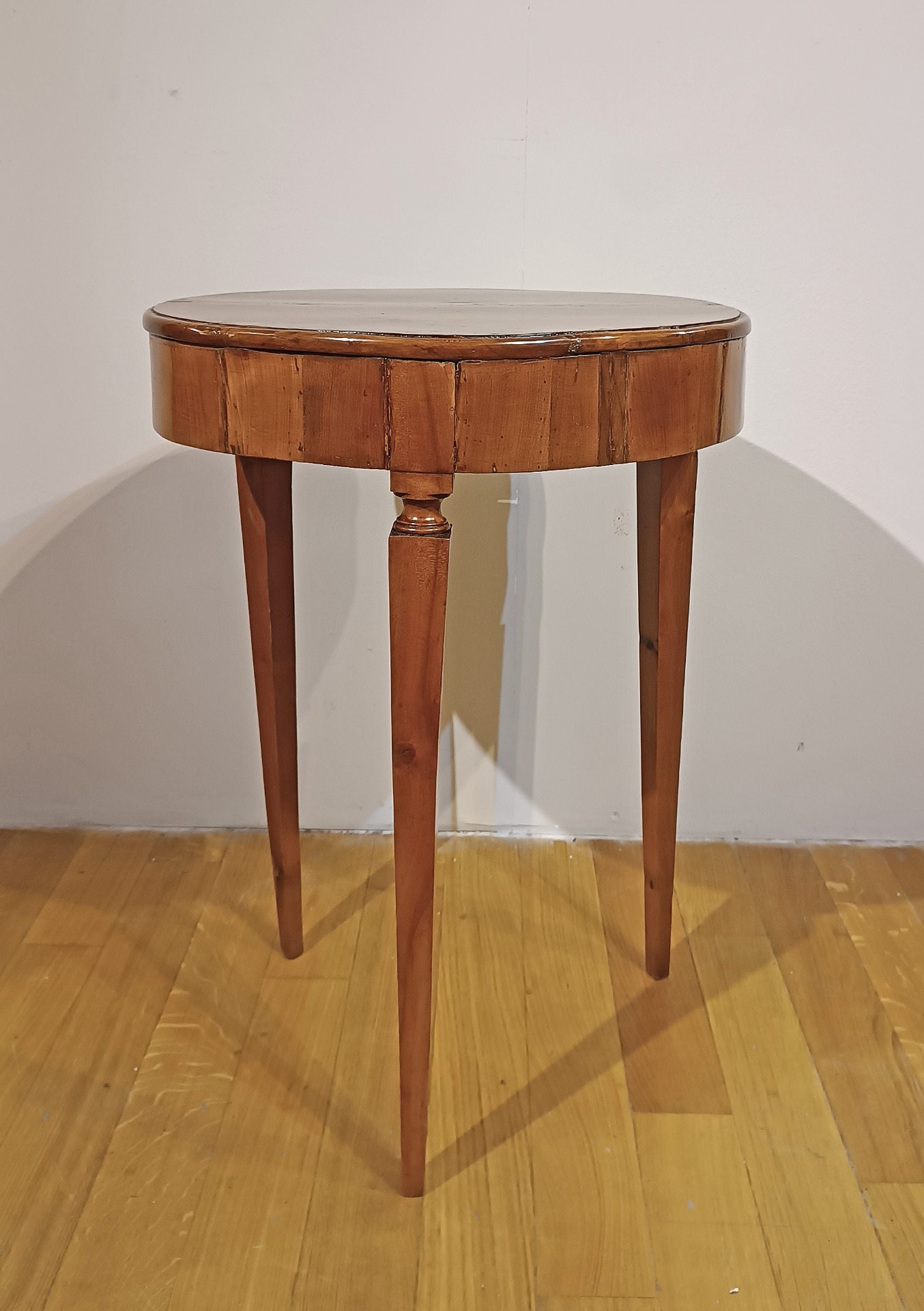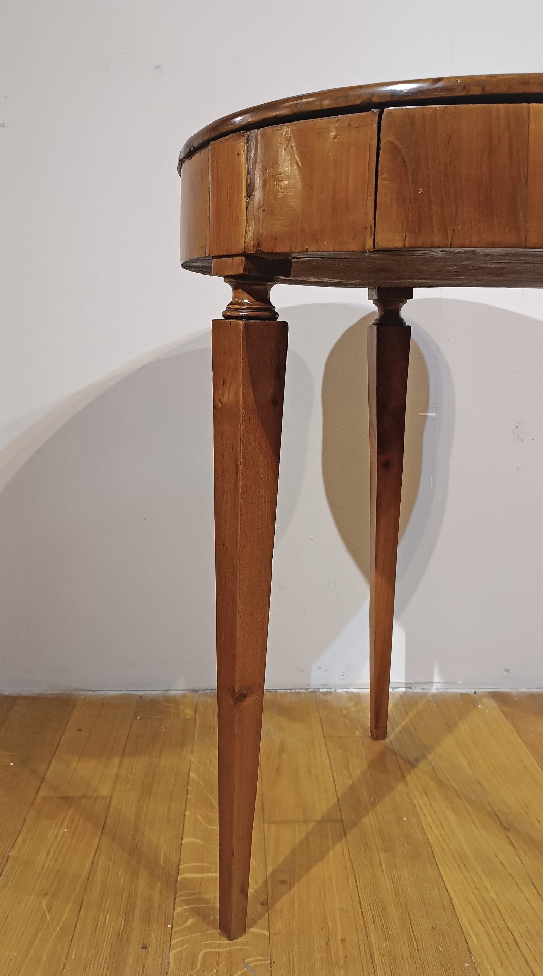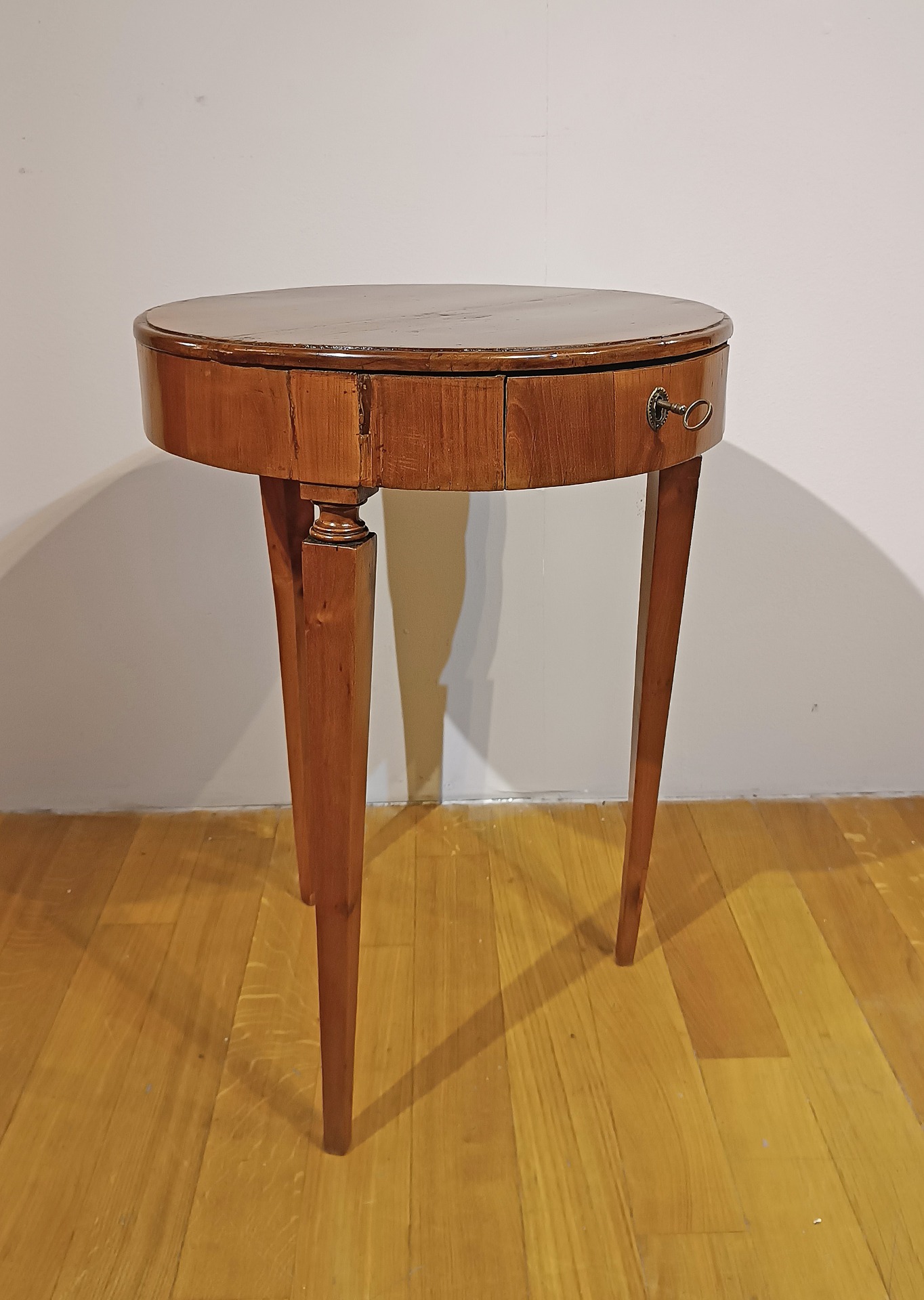 Raffinato tavolino lastronato in noce, finemente intagliato. Il mobile è composto da tre gambe troncopiramidali, tipiche del periodo, e da un piano con una fascia circolare. Il tavolino è dotato di un piccolo cassetto, pratico per riporre oggetti di piccole dimensioni. Si tratta di un mobile di grande gusto ed eleganza, capace di arredare con classe qualsiasi ambiente, ideale da posizionare accanto a un divano. Manifattura toscana del periodo Luigi XVI, intorno alla seconda metà del XVIII secolo.