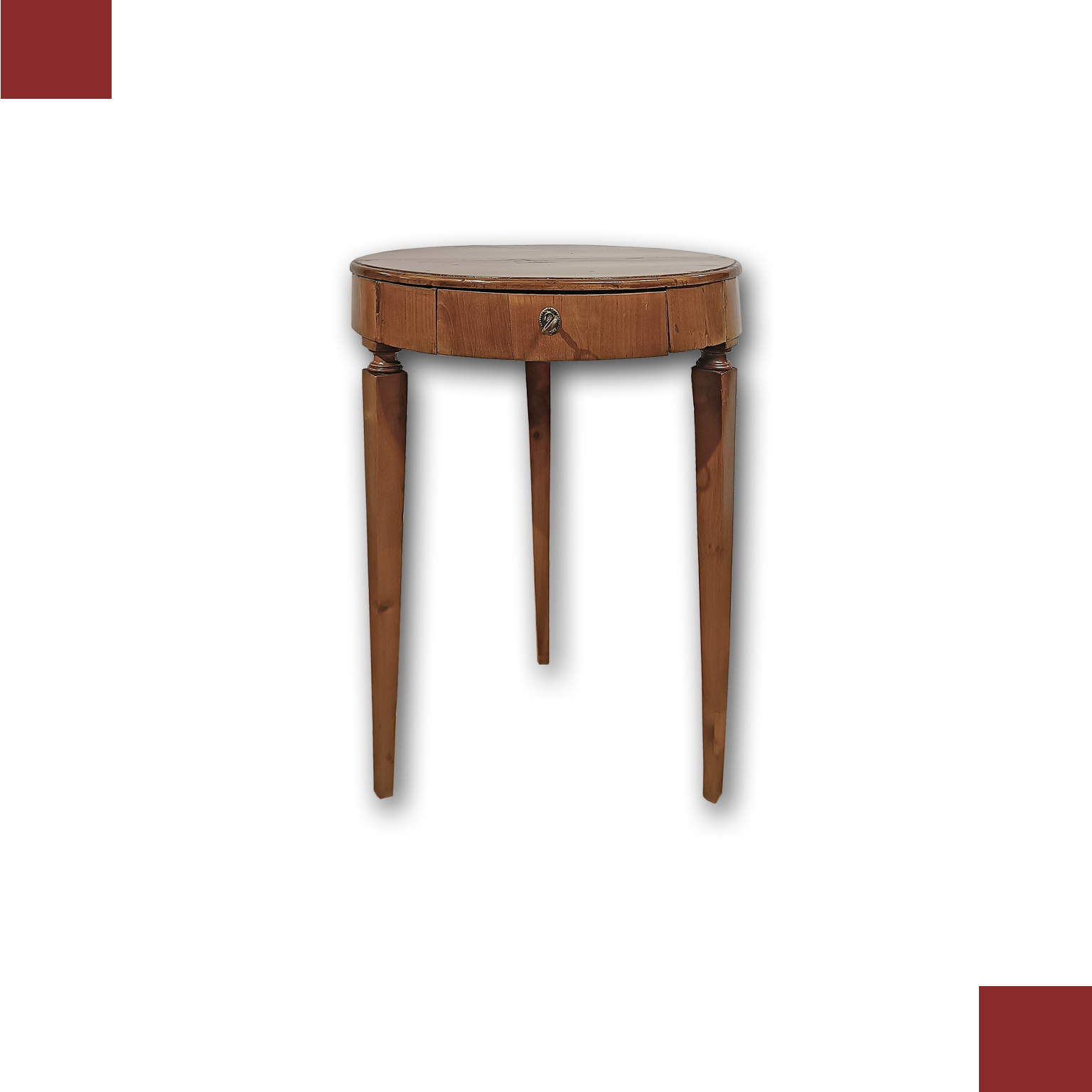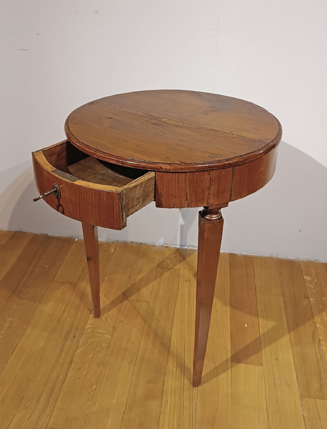 Raffinato tavolino lastronato in noce, finemente intagliato. Il mobile è composto da tre gambe troncopiramidali, tipiche del periodo, e da un piano con una fascia circolare. Il tavolino è dotato di un piccolo cassetto, pratico per riporre oggetti di piccole dimensioni. Si tratta di un mobile di grande gusto ed eleganza, capace di arredare con classe qualsiasi ambiente, ideale da posizionare accanto a un divano. Manifattura toscana del periodo Luigi XVI, intorno alla seconda metà del XVIII secolo. Misure: H x DM 71x 53cm