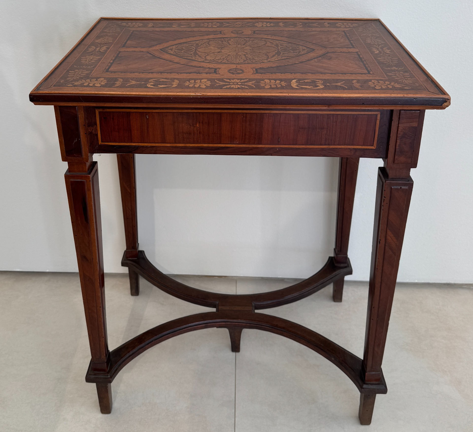 Tavolino intarsiato in noce e legni diversi, Lombardia, fine XVIII secolo,piano rettangolare centrato da un rosone di foglie d'acanto entro un profilo a mandorla e molteplici bordure, la più importante a candelabre fogliate. Cintura dritta con due cassetti nei lati corti, gambe troncopiramidali raccordate da una traversa a X, piedi a puntale, cm 72x60x41 2025.122.1 Ad integrazione delle descrizioni, la galleria “Antichità Giglio” rende disponibili, a richiesta, condition report sullo stato di conservazione dei propri beni e preventivi di trasporto nazionali ed internazionali.