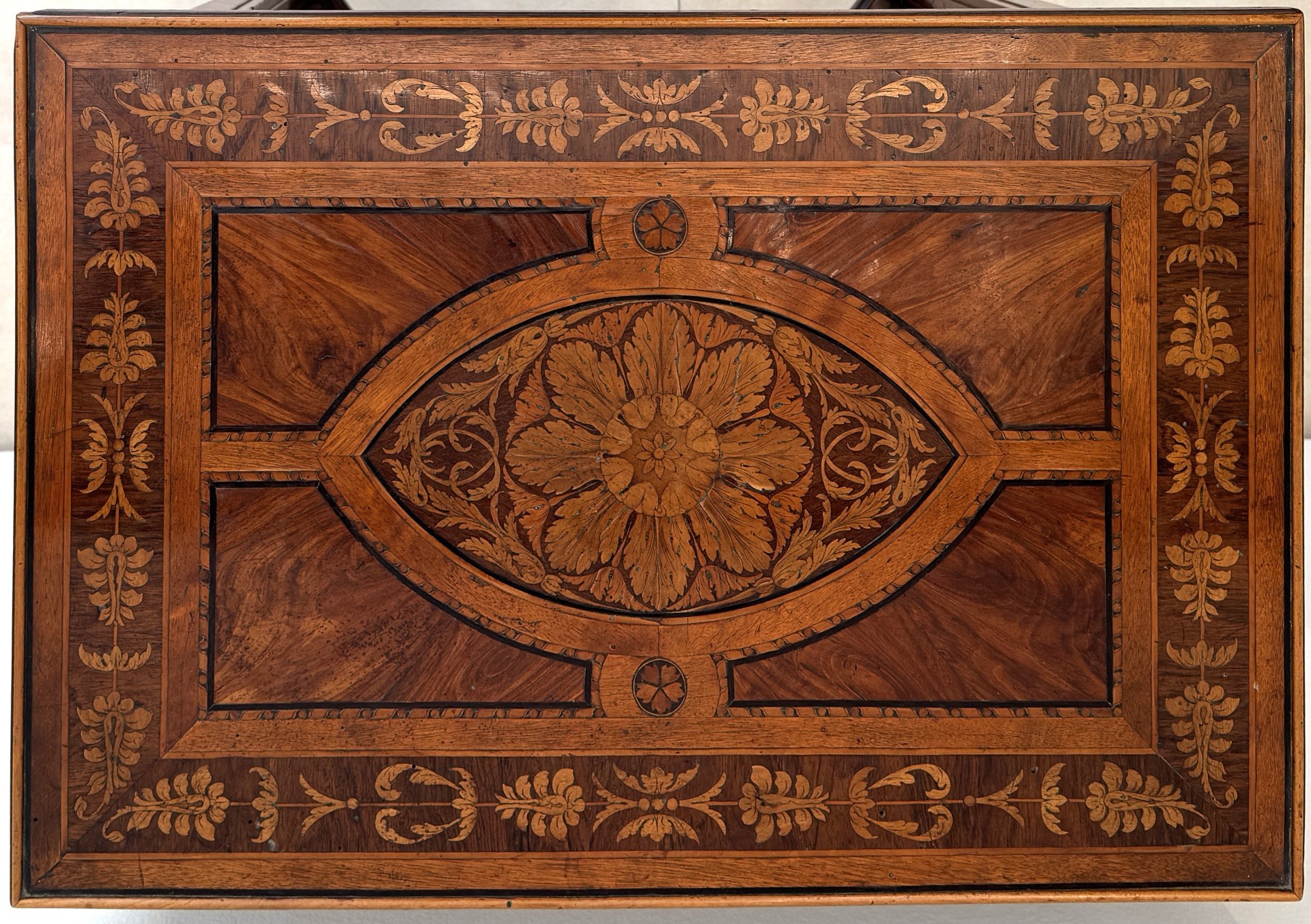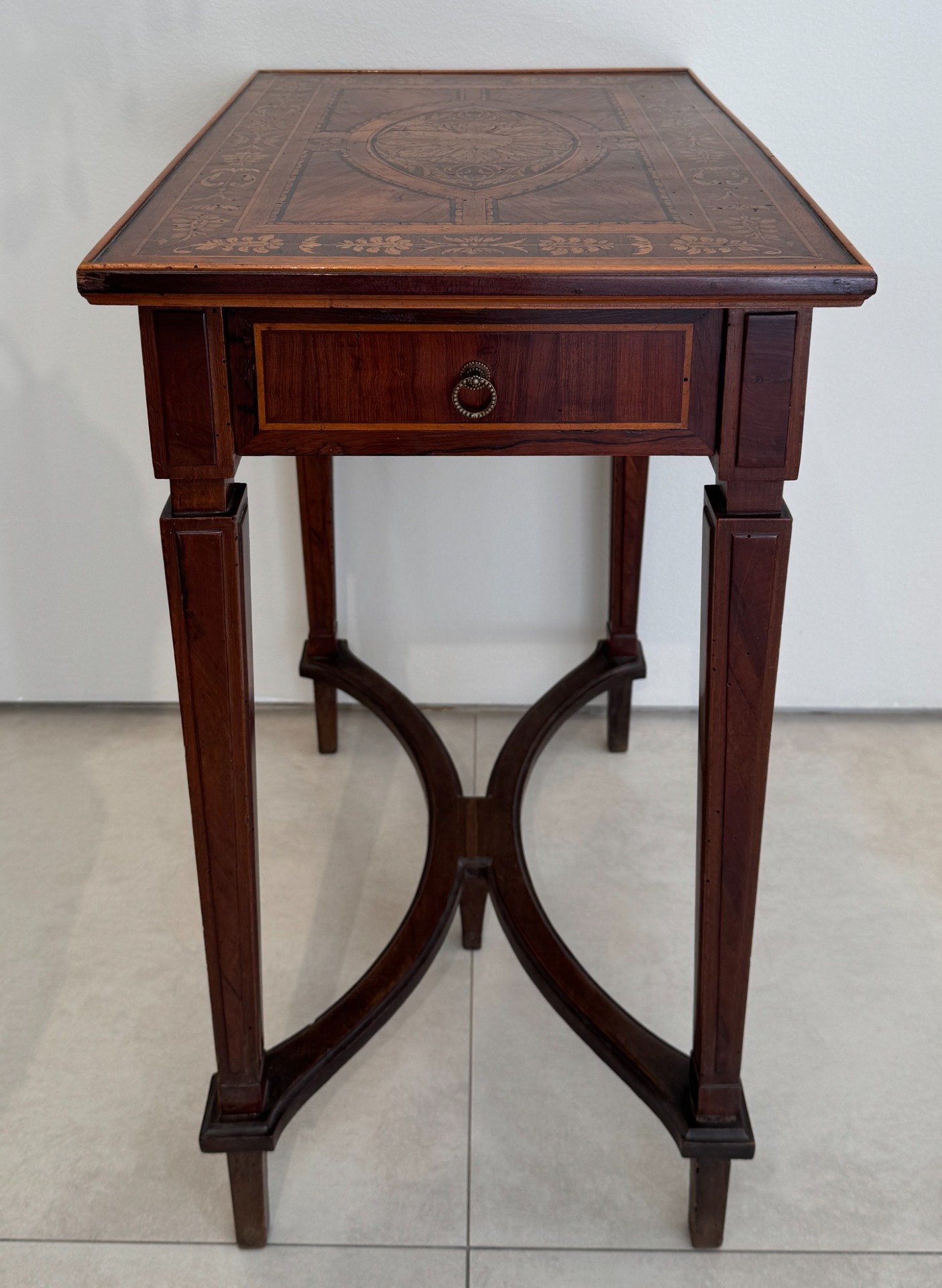 Tavolino intarsiato in noce e legni diversi, Lombardia, fine XVIII secolo,piano rettangolare centrato da un rosone di foglie d'acanto entro un profilo a mandorla e molteplici bordure, la più importante a candelabre fogliate. Cintura dritta con due cassetti nei lati corti, gambe troncopiramidali...