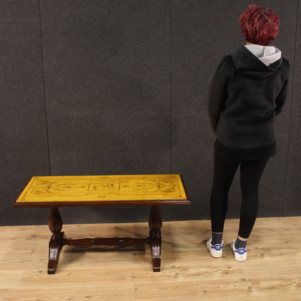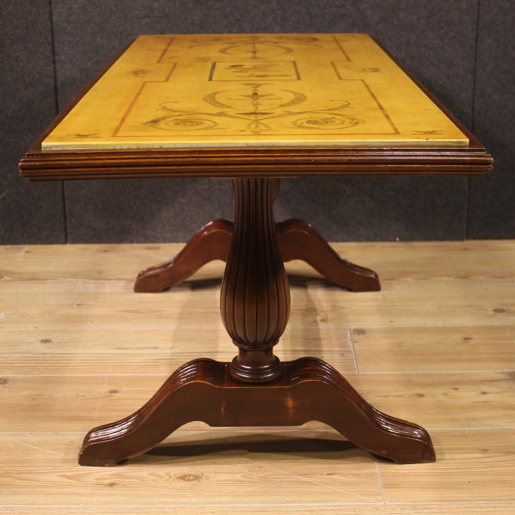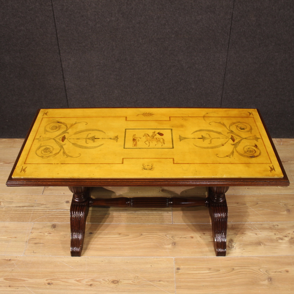 Elegante tavolino basso da salotto italiano degli anni 60. Mobile con base scolpita in legno di faggio (tinta mogano) e favoloso piano in marmo cesellato, intarsiato con stucco e dipinto con decori, animali e figure di gusto neoclassico. Tavolino basso da salotto di ottima misura e proporzione, per antiquari e arredatori. Piano in marmo bianco patinato giallo antichizzato, di buon servizio. Tavolino di ottima solidità e stabilità, con qualche segno di usura sul piano e una piccola mancanza di stucco. Mobile in bellissima patina, nel complesso in buono stato conservativo.