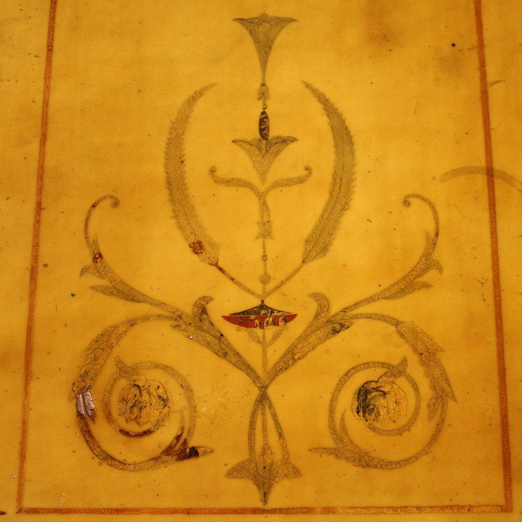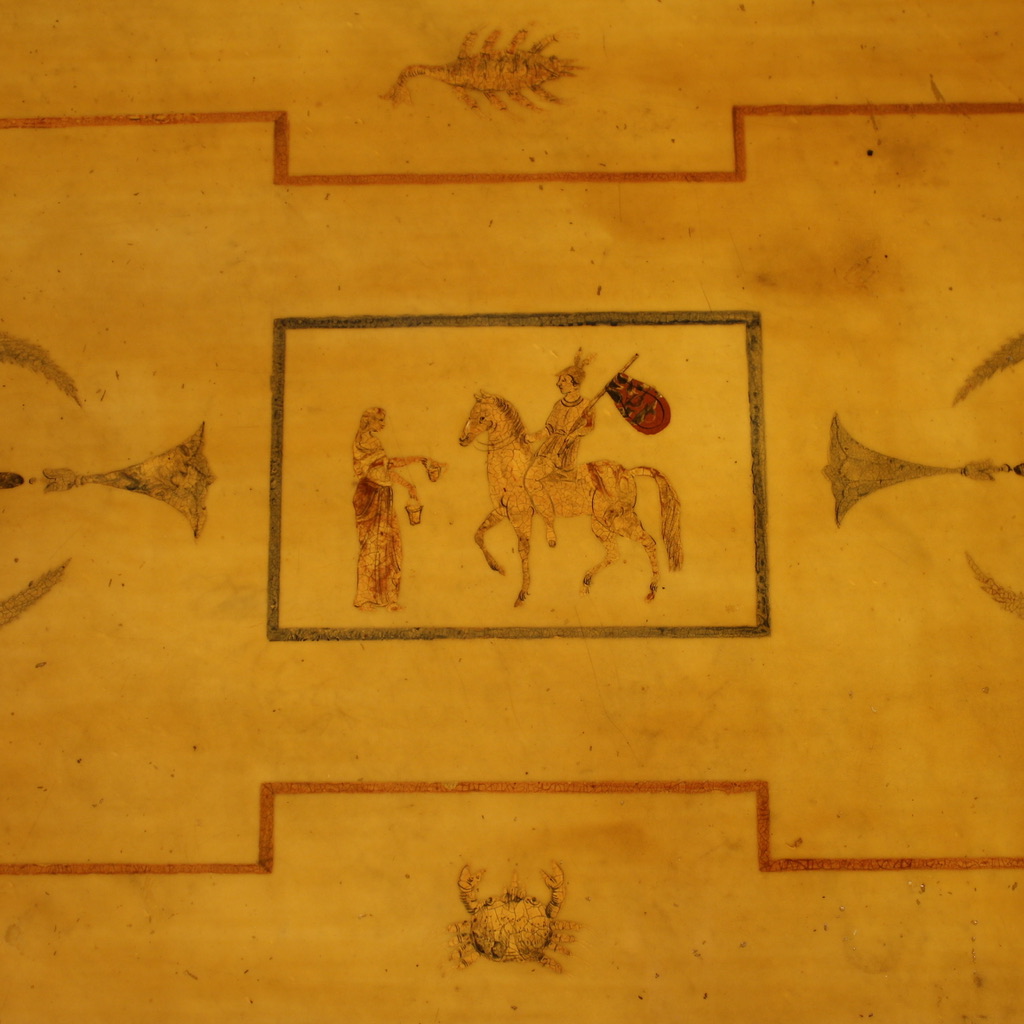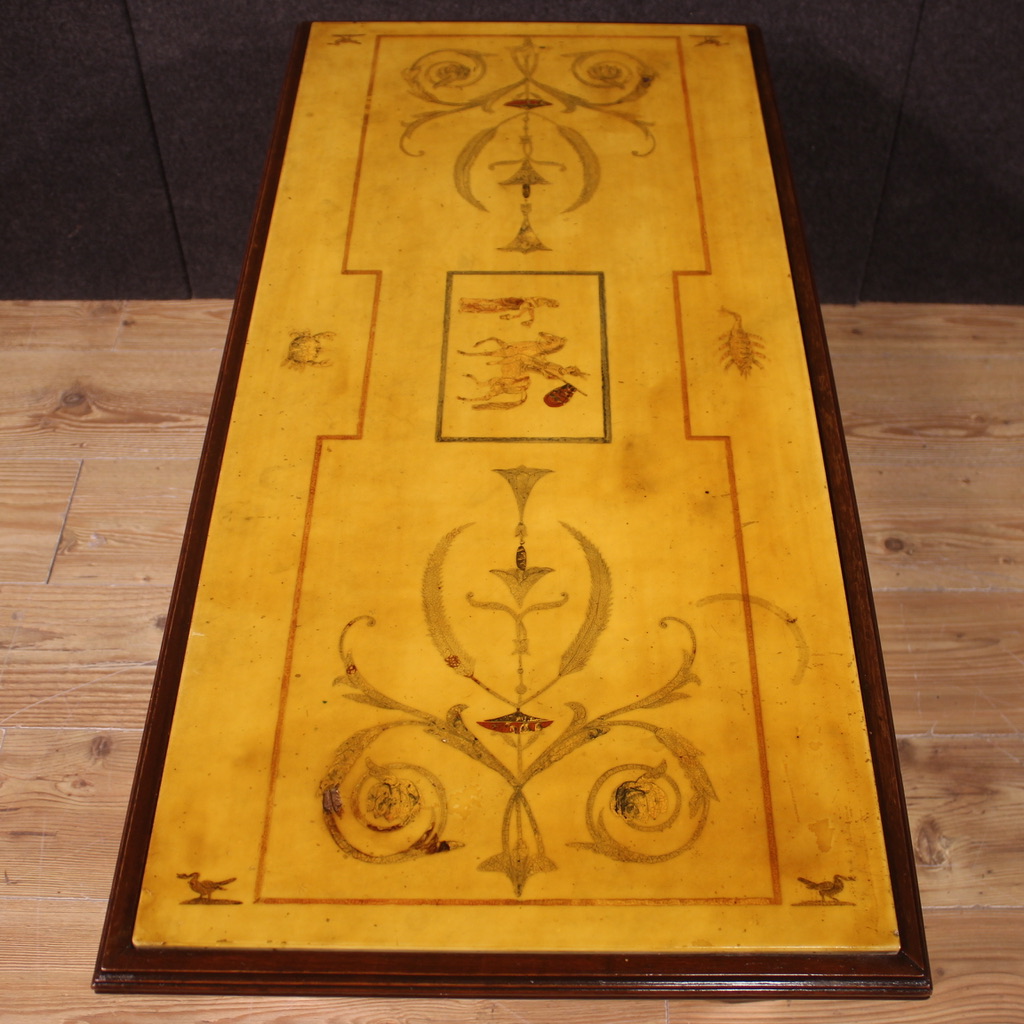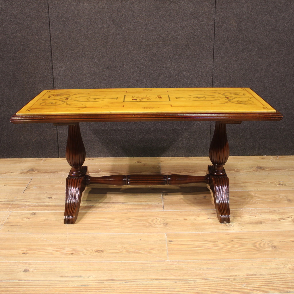 Elegante tavolino basso da salotto italiano degli anni 60. Mobile con base scolpita in legno di faggio (tinta mogano) e favoloso piano in marmo cesellato, intarsiato con stucco e dipinto con decori, animali e figure di gusto neoclassico. Tavolino basso da salotto di ottima misura e proporzione, per antiquari e arredatori. Piano in marmo bianco patinato giallo antichizzato, di buon servizio. Tavolino di ottima solidità e stabilità, con qualche segno di usura sul piano e una piccola mancanza di stucco. Mobile in bellissima patina, nel complesso in buono stato conservativo.
