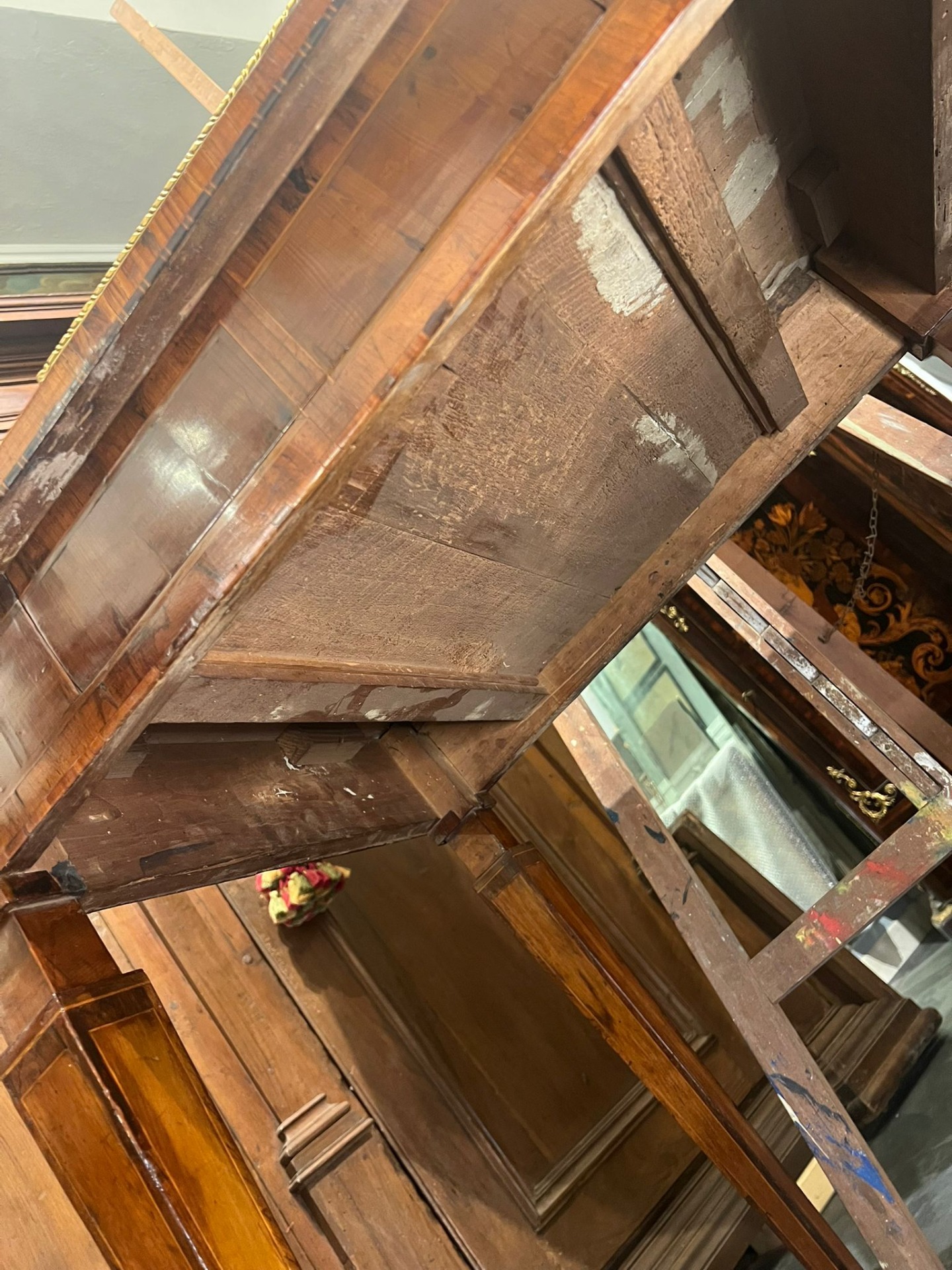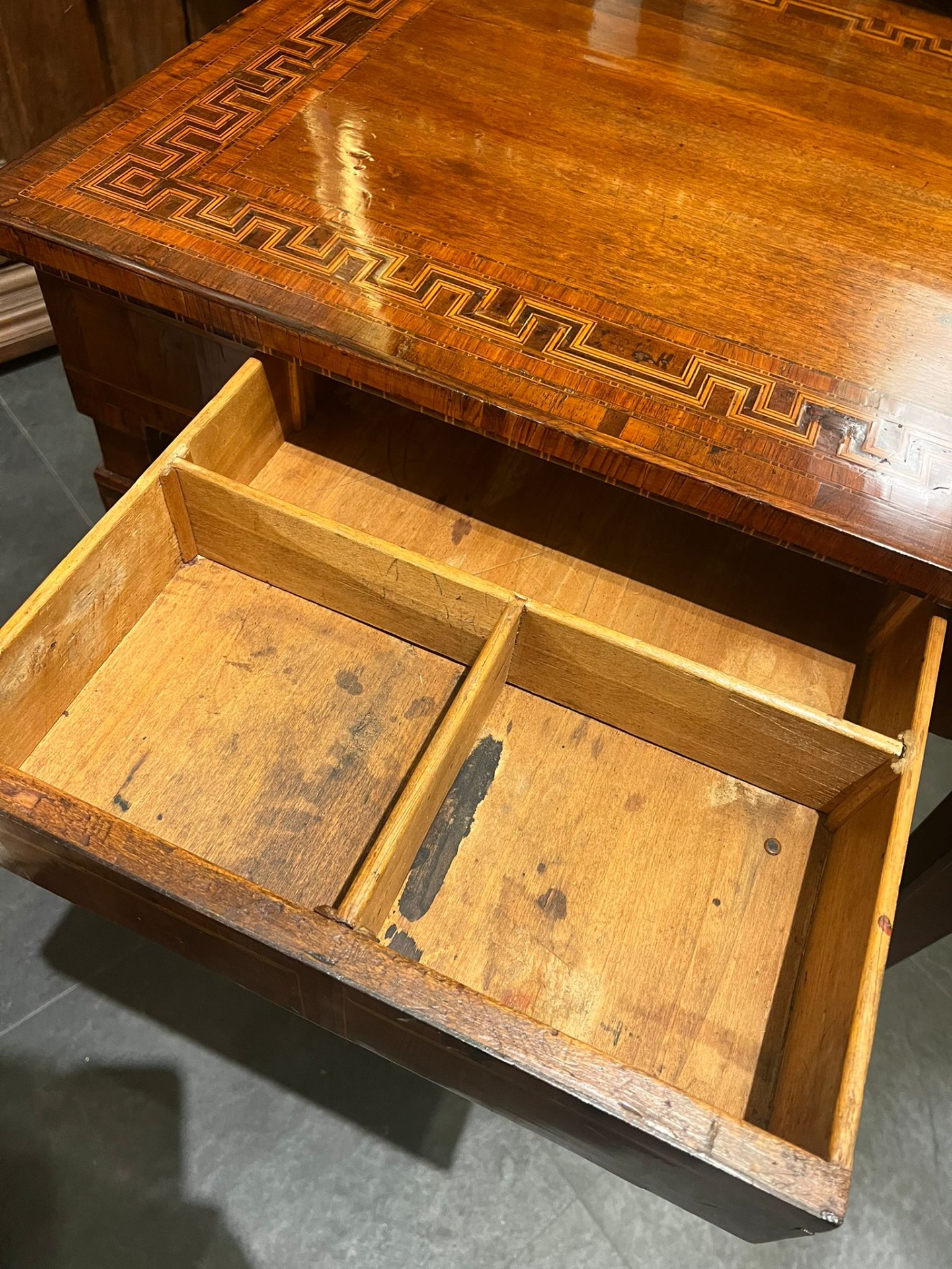 Tavolino rettangolare caratterizzato da una raffinata lavorazione a lastronatura, con piano in noce impreziosito da una ricca filettatura geometrica in essenze pregiate. Il motivo a greca che corre lungo tutto il perimetro del piano, con precisi inserti in vari legni, fra i quali, il palissandro.