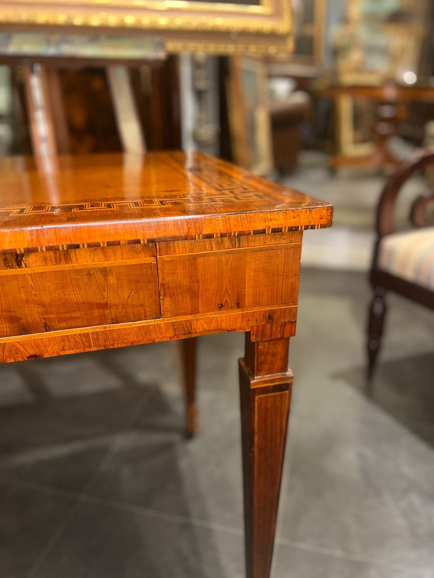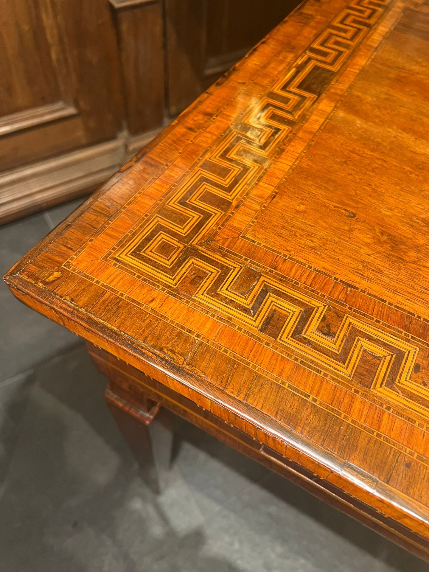 Elegante tavolino rettangolare lastronato in legno di noce, filettato, fine XVIII secolo, Toscana.
